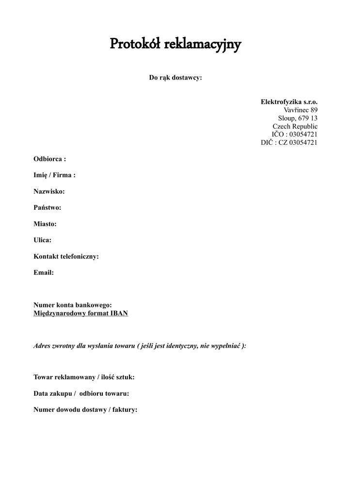 Protokół reklamacyjny Do rąk dostawcy: Elektrofyzika s.r.o. Vavřinec 89 Sloup, 679 13 Czech Republic IČO : 03054721 DIČ : CZ 03054721 Odbiorca : Imię / Firma : Nazwisko: Państwo: Miasto: Ulica: Kontakt telefoniczny: Email: Numer konta bankowego: Międzynarodowy format IBAN Adres zwrotny dla wysłania towaru ( jeśli jest identyczny, nie wypełniać ): Towar reklamowany / ilość sztuk: Data zakupu / odbioru towaru: Numer dowodu dostawy / faktury: Poniżej prosimy o zaznaczenie usterki: o Po podłączeniu urządzenia w sieć elektryczną ani wyświetlacz ani diody nie zostały zaświecone o Urządzenie pozostało w stanie „Start systemu“ o Po całkowitej awarii wyłączenia prądu i po ponownym uruchomieniu według instrukcji nie działają ani wyświetlacz ani diody o Urządzenie wyłączyło się bez jakiejkolwiek awarii wyłączenia prądu i po ponownym uruchomieniu według instrukcji nie działają ani wyświetlacz ani diody o Nie można wstawić obudowy boczne według instrukcji o Nie można wyjąć obudowy boczne według instrukcji o Prawdopodobnie doszło do uszkodzenia adaptera urządzenia o Inna usterka (prosimy o jej określenie) : Reklamacja zostanie zaakceptowana według tych warunków: 1. 2. 3. 4. 5. 6. 7. Składając reklamację, razem z tym „Protokołem reklamacyjnym“ trzeba osobno wysłać również kopię faktury lub dowodu dostawy, otrzymanego przy przyjęciu towaru. Urządzenie zostanie przekazane przez obiorcę do dostawcy do procedury reklamacyjnej tylko w stanie kompletnym, to znaczy w tym uzyskane materiály pisemne, adapter, zabezpieczenie przeciwprzepięciowe oraz wszystkie części urządzenia najlepiej w oryginalnym opakowaniu i na koszt odbiorcy. Towar nie może zostać uszkodzony przez odbiorcę w jakikolwiek sposób mechaniczny. Do procedury reklamacyjnej paczka musi zostać wysłana jako pakiet wartościowy. Wszelkie przesyłki wysłane do dostawcy za pobraniem nie zostaną zaakceptowane i brane pod uwagę. Dostawca zobowiązuje się załatwić reklamację na korzyść klienta i to w co najkrótszym czasie, najpóźniej bez zbędnej zwłoki do 30 dni od otrzymania towaru. Jeżeli klient doręczy do reklamacji towar niekompletny, dostawca zastrzega sobie w ramach procedury reklamacyjnej.obniżenie kwoty wypłaconej dla klienta. Wnioskodawca (klient) zgadza się i przyjmuję na wiadomość, że mogą mu być policzone koszty związane z reklamacją nieuzasadnioną, to znaczy reklamacja, kiedy niefunkcjonalność urządzenia zpowodowana została przez niewłaściwe użytkowanie, uszkodzenie lub zniszczenie urządzenia sprzętu przez klienta. Potwierdzam, że dokładnie przeczytałam / przeczytałam instrukcję instalacji urządzenia razem z wszelką dokumentacją i urządzenie zainstalowałam / zainstalowałem zgodnie z dostarczonymi materiałami. Serial No.: ______________________________________________________________________ ________________________________ Data _______________________________ Podpis (pieczątka) Wynik procesu reklamacyjnego towaru - DryPol® system i wyposażenie: 1. Uszkodzenie mechaniczne zewnętrznej powierzchni urządzenia tak nie 2. Uszkodzenie mechaniczne wewnątrz urządzenia tak nie 3. Uszkodzenie mechaniczne źródła zasilania urządzenia tak nie 4. Uszkodzenie elektrycznego źródła zasilania urządzenia tak nie 5. Usterka dotycząca HW oraz SW urządzenia tak nie 6. Usterka dotycząca mechanicznych części urządzenia tak nie 7. Usterka dotycząca elektronicznych części urządzenia tak nie 8. Usterka dotycząca źródła zasilania urządzenia tak nie 9. Urządzenie zostało uszkodzone przez klienta tak nie 10. Normalne zużytkowanie czynnością urządzenia tak nie 11. Uszkodzenie w czasie transportu tak nie 12. Warunki gwarancyjne do naprawy gwarancyjnej zostały dotrzmane tak nie 13. Reklamacja została zaakceptowana i uznana tak nie 14. Kwota w PLZ za naprawę reklamacją nieuznaną PLZ Data przyjęcia reklamacji : __________________________________________________ Data wykonania reklamacji : _________________________________________________ __________________________________________________ Michal Macháč Elektrofyzika s.r.o. Vavřinec 89 Sloup, 679 13 Czech Republic IČO : 03054721 DIČ : CZ 03054721
