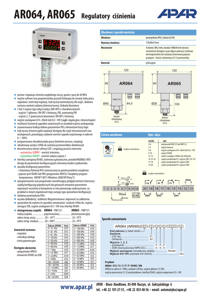 AR064, AR065 Regulatory ciśnienia Obudowa i sposób montażu Obudowa przemysłowa IP65, Gainta G2104 Wymiary obudowy 120x80x55mm Mocowanie 4 otwory Φ4,3 mm, rozstaw 108x50 mm (otwory montażowe dostępne są po zdjęciu pokrywy czołowej) lub bezpośrednio do instalacji ciśnieniowej poprzez przyłącze - króciec ciśnieniowy G1/2 przetwornika Materiał poliwęglan 120 AR064 80 pomiar i regulacja ciśnienia względnego cieczy, gazów i pary do 40 MPa n wejście cyfrowe oraz programowalny przycisk funkcyjny do zmiany trybu pracy n Kod D10 D12 D14 A1G A1K A1Q A1R A1S A1T A1W A1X A3E A3G A3K D31 D3W D38 Zakres AR065 0 ÷ 100 kPa 0 ÷ 160 kPa 0 ÷ 250 kPa 0 ÷ 400 kPa 0 ÷ 600 kPa 0 ÷ 1,0 MPa 0 ÷ 1,6 MPa 0 ÷ 2,5 MPa 0 ÷ 4,0 MPa 0 ÷ 6,0 MPa 0 ÷ 10 MPa 0 ÷ 16 MPa 0 ÷ 25 MPa 0 ÷ 40 MPa Kod A1G A1H A1N A1Q A1R A1S A1T A1W A1X A1Z A70 A71 A73 A74 www.apar.pl Ø26 króciec ciśnieniowy G1/2 100 króciec ciśnieniowy G1/2 Listwa zaciskowa Opis złącz zaciski 3-6 5-7 5-8 9-10 12-13 14-15-16 17-18 19-20 PROGRAMOWANIE PRG na płytce wyświetlacza AR955 KOPIOWANIE opis przetwornik PMC131 lub PMP131 wejście binarne wyjście analogowe 0/4÷20mA lub 0/2÷10V wyjście RS485 wejście zasilające 230Vac lub 24Vac(dc) wyjście przekaźnika P1, wyjście SSR1 (14-15) wyjście przekaźnika P2, wyjście SSR2 wyjście przekaźnika P3, wyjście SSR3 PRG na płytce wyświetlacza Uout + Iout + _ V GND Uzas P3 mA 1 2 3 4 5 6 7 8 9 10 _ BIN + + Dostępne akcesoria: - programator AR955 - konwerter RS485 na USB Zakres AR064 0 ÷ 10 kPa 0 ÷ 20 kPa 0 ÷ 40 kPa 0 ÷ 100 kPa 0 ÷ 200 kPa 0 ÷ 400 kPa 0 ÷ 600 kPa 0 ÷ 1 Mpa 0 ÷ 1,6 MPa 0 ÷ 2,5 MPa 0 ÷ 4 MPa -100 ÷ 100 kPa -100 ÷ 300 kPa -0,1 ÷ 0,9 MPa -10 ÷ 10 kPa -2 ÷ 2 kPa -20 ÷ 20 kPa PMP131 84,0 24Vdc Przetwornik RS485 Zawartość zestawu: - regulator - instrukcja obsługi - karta gwarancyjna AR065 80 PMC131 Ø40 - RS + RS regulatora: start/stop regulacji, tryb ręczny/automatyczny dla wyjść, skokowa zamiana wartości zadanej (dzienna/nocna), blokada klawiatury 2 lub 3 wyjścia typu włącz/wyłącz (ON-OFF) o charakterystykach: n - wyjście 1 (główne): ON-OFF z histerezą, PID, autotuning PID - wyjście 2, 3 (pomocnicze/alarmowe): ON-OFF z histerezą wyjście analogowe 0/4÷20mA lub 0/2÷10V (ciągłe-regulacyjne, retransmisyjne) n możliwość konwersji sygnałów wejściowych na standard wyjścia analogowego n zaawansowana funkcja doboru parametrów PID z elementami fuzzy logic n tryb ręczny (otwarta pętla regulacji) dostępny dla wyjść dwustanowych oraz n analogowych, pozwalający zadawać wartość sygnału wyjściowego w zakresie 0 ÷ 100% programowana charakterystyka pracy (kontroler procesu, ramping) n wbudowany zasilacz 24Vdc do zasilania przetworników obiektowych n dwuwierszowy odczyt cyfrowy LED z regulacją jasności świecenia: n - wyświetlacz GÓRNY - wartość mierzona, - wyświetlacz DOLNY - wartość zadana wyjścia 1 interfejs szeregowy RS485, izolowany galwanicznie, protokół MODBUS-RTU n dostęp do parametrów konfiguracyjnych chroniony hasłem użytkownika sposoby konfiguracji parametrów: n - z klawiatury foliowej IP65 umieszczonej na panelu przednim urządzenia - poprzez port RS485 lub PRG (programator AR955) i bezpłatny program komputerowy ARSOFT-WZ1 (Windows 2000/XP/Vista/7) oprogramowanie oraz programator umożliwiający podgląd wartości mierzonej i n szybką konfigurację pojedynczych lub gotowych zestawów parametrów zapisanych wcześniej w komputerze w celu ponownego wykorzystania, na przykład w innych regulatorach tego samego typu (powielanie konfiguracji) obudowa przemysłowa IP65 n wysoka dokładność, stabilność długoterminowa i odporność na zakłócenia n opcjonalnie do wyboru (w sposobie zamawiania): zasilanie 24Vac/dc, wyjścia n sterujące SSR, wyjście analogowe 0/2÷10V oraz interfejs RS485 AR065 - PMP131 zintegrowany czujnik: AR064 - PMC131 n rodzaj czujnika .................. pojemnościowy ................. piezorezystancyjny zakres temp. pracy ............ -20÷ 85°C ........................ -25÷70°C zakres temp. medium ....... -20÷100°C ........................ -25÷70°C 120 P2 P1 20 19 18 17 16 15 14 12 13 _ + SSR3 _ + SSR2 _ + SSR1 Sposób zamawiania AR064 (AR065)/ / / / / / / Kod zakresu (z tabel obok) Zasilanie - 230 Vac ....................................... S1 - 24Vac/dc ..................................... S2 Wyjście 1, 2, 3 - przekaźnik .......................................... P P P - SSR (tranzystorowe NPN OC) ........... S S S Wyjście szeregowe (dodatkowa opłata) ................. RS485 Wyjście 0/2÷10V (zamiast 0/4÷20mA) ...................................... WU Przykład: AR064 / A1S / S1 / S / P / P / RS485 / WA AR064 na zakres 0÷1MPa, zasilanie 230 Vac, wyjście główne (1) SSR, wyjścia pomocnicze (2 i 3) przekaźnikowe, interfejs RS485, wyjście napięciowe 0/2÷10V APAR - Biuro Handlowe, 05-090 Raszyn, ul. Gałczyńskiego 6 tel. +48 22 101-27-31, +48 22 853-48-56 • email: [email protected] Dane Techniczne Wejście dedykowane AR064 zintegrowany przetwornik ciśnienia PMC131, czujnik pojemnościowy, materiał membrany Al2O3, zakres temperatury medium -20÷85°C Wejście dedykowane AR065 zintegrowany przetwornik ciśnienia PMP131, czujnik piezorezystywny, materiał membrany SS316L, zakres temperatury medium -25÷70°C Czas odpowiedzi (10 ÷ 90%) 0,25 ÷ 3 s (programowalny) Błędy przetwarzania (w temperaturze otoczenia 25°C): 0,6 % zakresu pomiarowego ±1 cyfra (suma dokładności przetwornika i regulatora) Wejście binarne (stykowe lub napięciowe <24V) bistabilne, poziom aktywny: zwarcie lub < 0,8 V - złącze PRG (bez separacji) dla zestawu programującego AR955, standard - szybkość 2,4 ÷ 115,2 kb/s, - format znaku 8N1 (8 bitów danych, 1 bit stopu, bez bitu parzystości), - protokół MODBUS-RTU (SLAVE) Wyjścia dwustanowe (3 przekaźnikowe lub SSR) - przekaźnikowe (P1, P2, P3), standard 1 główne (SPDT) - 8A/250Vac (dla obc. rezyst.), 2 