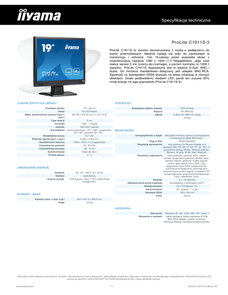 Specyfikacja techniczna ProLite C1911S-3 ProLite C1911S to monitor skonstruowany z myślą o podłączeniu do kamer przemysłowych. Idealnie nadaje się więc do zastosowań w monitoringu i ochronie. Ten 19-calowy panel wyświetla obraz z rozdzielczością natywną 1280 x 1024 (1.3 Megapiksela). Jego czas reakcji wynosi 5 ms (czarny-do-czarnego), a poziom kontratsu to 1000:1 (typowo). ProLite C1911S wyposażony jest w wejścia D-Sub, BNC i Audio. Do monitora standardowo dołączany jest adapter BNC-RCA. Zgodność ze standardem VESA pozwala na łatwą instalację w różnych obiektach. Dzięki podświetleniu diodami LED, panel ten zużywa 20% mniej energii niż jego poprzednik (ProLite C1911S-2). CHARAKTERYSTYKA OBRAZU INTERFEJSY Przekątna ekranu Panel Maks. powierzchnia robocza (wys. x szer.) Czas reakcji 19" ( 48 cm) Analogowe wejście sygnału TN LED-backlit Wyjścia 301.06 x 376.32 mm; 11.9" x 14.8" Złącza 5 ms Kontrast 1000 : 1 typowy Jasność 250 cd/m² typowa Kąt widzenia poziomo/pionowo: 170°/ 160°; prawo/lewo: 85°/ 85°; góra/dół: 80°/ 80° Wyświetlane kolory Wielkość plamki (pion. x poz.) 1280 x 1024 ( 1.3 megapiksela) 30 - 82 KHz Częstotliwość pionowa Plug & Play Separate Sync Format obrazu 5:4 przy pomocy On-Screen-Display w 8 językach (EN, FR, DE, IT, ES, PT, NL, SE) i 5 przycisków obsługi (Power, Wejście sygnału/ Wybierz, W górę, W dół, Meu/ Wyjście) Parametry regulowane obraz (jasność, kontrast, kolor, odcień, ostrość, temperatura kolorów), dźwięk (basy, soprany, balans, głośność, źródło sygnału audio), opcje (język menu OSD, czas wygaszania menu OSD, przełącznik AV, automatyczne wyłączanie, automatyczne wyłączanie przy braku sygnału, przywróć), PC (autokonfiguracja, pozycja pozioma/pionowa menu, taktowanie, faza) ZARZĄDZANIE ENERGIĄ Zasilanie Zasilacz Zużycie energii AC 100 - 240 V, 50 / 60 Hz wewnętrzny 19 W typowo; maks. 1 W w trybie Power management Głośniki Zabezpieczenie przed kradzieżą WYMIARY / WAGA Waga 2 x 1 W (Stereo) kompatybilny z Kensington-lock™ Bezpieczeństwo CE, TÜV/Bauart, CU Kąt pochylenia 20° w górę; 1° w dół Standard VESA 100 x 100 mm Kolor Wymiary (szer. x wys. x gł.) VESA DDC2B™ Regulacja parametrów 56 - 75 Hz Synchronizacja D-Sub Kompatybilność z Apple Wszystkie monitory iiyama są kompatybilne z komputerami Apple Macintosh. 16.7 mln Częstotliwość pozioma AV (BNCx2) D-Sub, AV (BNCx2), Audio WŁAŚCIWOŚCI 0.294 x 0.294 mm Rozdzielczość fizyczna VGA (D-Sub) czarny 407 x 431.5 x 200.5 mm 3.9 kg AKCESORIA Sterowniki Windows 95 / 98 / 2000 / ME / XP / Vista/ 7 Akcesoria w zestawie kabel zasilający, kabel sygnałowy D-Sub, BNC-RCA adapter, stopka, skrócona instrukcja obsługi, instrukcja bezpieczeństwa Wszystkie znaki towarowe zastrzeżone. Pomyłki i wprowadzanie zmian zastrzeżone. Specyfikacje produktów mogą ulec zmianie bez wcześniejszego zawiadomienia. Wszystkie monitory LCD iiyama są zgodne z normą ISO-9241-307:2008 określającą liczbę i rodzaj defektów matrycy. www.iiyama.com Powered by TCPDF (www.tcpdf.org) 1/1 2013-01-24T10:34:46+01:00