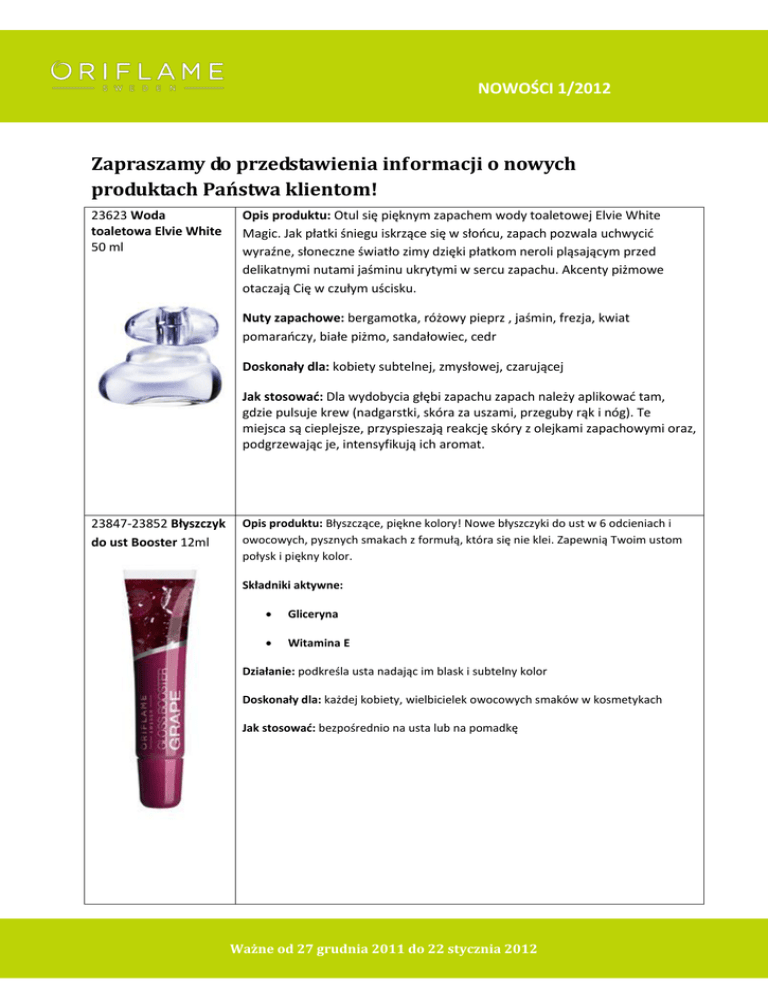 NOWOŚCI 1/2012 ORIFLAME POLAND Zapraszamy do przedstawienia informacji o nowych produktach Państwa klientom! 23623 Woda toaletowa Elvie White 50 ml Opis produktu: Otul się pięknym zapachem wody toaletowej Elvie White Magic. Jak płatki śniegu iskrzące się w słońcu, zapach pozwala uchwycić wyraźne, słoneczne światło zimy dzięki płatkom neroli pląsającym przed delikatnymi nutami jaśminu ukrytymi w sercu zapachu. Akcenty piżmowe otaczają Cię w czułym uścisku. Nuty zapachowe: bergamotka, różowy pieprz , jaśmin, frezja, kwiat pomarańczy, białe piżmo, sandałowiec, cedr Doskonały dla: kobiety subtelnej, zmysłowej, czarującej Jak stosować: Dla wydobycia głębi zapachu zapach należy aplikować tam, gdzie pulsuje krew (nadgarstki, skóra za uszami, przeguby rąk i nóg). Te miejsca są cieplejsze, przyspieszają reakcję skóry z olejkami zapachowymi oraz, podgrzewając je, intensyfikują ich aromat. 23847-23852 Błyszczyk do ust Booster 12ml Opis produktu: Błyszczące, piękne kolory! Nowe błyszczyki do ust w 6 odcieniach i owocowych, pysznych smakach z formułą, która się nie klei. Zapewnią Twoim ustom połysk i piękny kolor. Składniki aktywne: Gliceryna Witamina E Działanie: podkreśla usta nadając im blask i subtelny kolor Doskonały dla: każdej kobiety, wielbicielek owocowych smaków w kosmetykach Jak stosować: bezpośrednio na usta lub na pomadkę Ważne od 27 grudnia 2011 do 22 stycznia 2012 NOWOŚCI 1/2012 23374 Wygładzający balsam do ust z organicznymi ekstraktami z jagód acai i granatu 4,5 g Opis produktu: Balsam barwiący usta na czerwony kolor zawiera ORIFLAME POLAND antyoksydanty, które pomagają chronić je przed wolnymi rodnikami. Dodatkowo sprawia, że stają się gładkie. Składniki aktywne: Jagody acai Granat Działanie: ochronne Doskonały dla: każdego Jak stosować: balsam przeznaczony jest do codziennej pielęgnacji ust. 23273 Krem do skóry wrażliwej Silk and Beauty 200 ml 23274 Krem pod prysznic do skóry wrażliwej Silk Beauty 200 ml 23272 Mydełko do skóry wrażliwej Silk Beauty 100 g Opisy produktów Krem do ciała: Wyciąg z rumianku pomaga ukoić wrażliwą skórę, a ekstrakt z orchidei i witamina E odżywiają i chronią. Sprawią, że skóra będzie delikatnie zrelaksowana, a Ty odkryjesz swoją prawdziwą zmysłowość dzięki cudownie subtelnemu zapachowi i delikatnej, jedwabistej konsystencji. Krem pod prysznic: Oczyszcza, nawilża i subtelnie pachnie. Zawiera specjalną formułę ze zrównoważonym pH. Proteiny jedwabiu i gliceryna pomagają w naturalny sposób odżywić i nawilżyć skórę wrażliwą, a kojące właściwości rumianku delikatnie ją łagodzą. Przeciwutleniacze zawarte w orchidei zapewniają ochronę. Mydełko: Łagodna formuła o subtelnym zapachu delikatnie oczyszcza wrażliwą skórę. Zawiera nawilżające proteiny jedwabiu i glicerynę, kojący rumianek i ochronną alantoinę, które sprawiają, że skóra jest miękka i zrelaksowana. Spień mydełko, by powstała piękna, miękka piana. Składniki aktywne: Oleje roślinne Wosk pszczeli Ważne od 27 grudnia 2011 do 22 stycznia 2012 NOWOŚCI 1/2012 Witamina E Ekstrakt z rumianku Alantoina Ekstrakt z orchidei Gliceryna Proteiny jedwabiu ORIFLAME POLAND Działanie: kojące, nawilżające i odżywcze Doskonały dla: osób ze skóra wrażliwą, skłonną do podrażnień 21339 Preparat oczyszczający Diamond Cellular 200 ml Opis produktu: Luksusowy preparat oczyszczający, tonik i płyn do demakijażu w jednym! Zawiera kompleks White Diamond Elixir™ i wykorzystuje technologię micelarną, dzięki której delikatnie usuwa wszystkie zanieczyszczenia, bez korzystania z wody. Stosować rano i wieczorem używając wacika. Składniki aktywne: Alantoina Kwas mlekowy Trufla biała Ekstrakt z groszku Działanie: 3w1: produkt do demakijażu, oczyszczania i tonizacji twarzy Doskonały dla: każdy rodzaj cery po 40 roku życia Luksusowy, odświeżający i wielofunkcyjny płyn micelarny z kompleksem White Diamond Elixir skutecznie usuwa zanieczyszczenia i resztki makijażu, jednocześnie oczyszczając i tonizując skórę. Do wszystkich typów cery, łącznie z wrażliwą. Ekskluzywny kompleks White Diamond Elixir z wyciągiem z białych trufli poprawia kondycję skóry, jednocześnie wywierając wygładzający wpływ na zmarszczki. W połączeniu ze składnikami o działaniu rozjaśniającym, przywraca cerze wyrównany koloryt i świeży, pełen blasku wygląd. Technologia Micelarna absorbuje zanieczyszczenia, usuwając z twarzy kurz i nadmiar sebum. Jak stosować: Wmasuj delikatnie w skórę twarzy i szyi, a następnie zetrzyj. Nie wymaga spłukiwania. Testowany dermatologicznie. Ważne od 27 grudnia 2011 do 22 stycznia 2012 NOWOŚCI 1/2012 24033-24040 Konturówki do ust Wonder Colour 0,3 g Opis produktu: Super gładka konturówka, do której nie potrzebujesz ORIFLAME POLAND temperówki. Wyraźnie i precyzyjnie zaznacza naturalne kontury ust. Idealnie pasuje do ulubionej szminki i pięknie podkreśla usta. Dostępna w 8 odcieniach. Składniki aktywne: Woski roślinne Działanie: podkreślają kształt ust, przedłużają trwałość makijażu ust Doskonały dla: każdej kobiety 23457-23459 Lakierybazy pod manicure artystyczny Very Me 8 ml Jak stosować: Przed naniesieniem konturówki lekko przypudrujmy usta lub wklepmy w nie odrobinę podkładu. Delikatnie zmatowane usta lepiej się maluje. Kreski starajmy się poprowadzić dokładnie na granicy warg. Konturówka musi mieć kolor zbliżony do szminki. Może być jednak delikatnie jaśniejsza, na przykład o ton nigdy ciemniejsza, bo wtedy nasz makijaż wygląda po prostu nieestetycznie. Opis produktów Lakiery-bazy: Wspaniałe, mieniące się lakiery w trzech żywych kolorach! To doskonały punkt wyjścia do tego, byś zabłysnęła swoją kreatywnością. Artystyczne lakiery: Stwórz wyjątkowe i skomplikowane wzory na paznokciach. Lakier do paznokci w trzech intensywnych odcieniach z pędzelkiem 