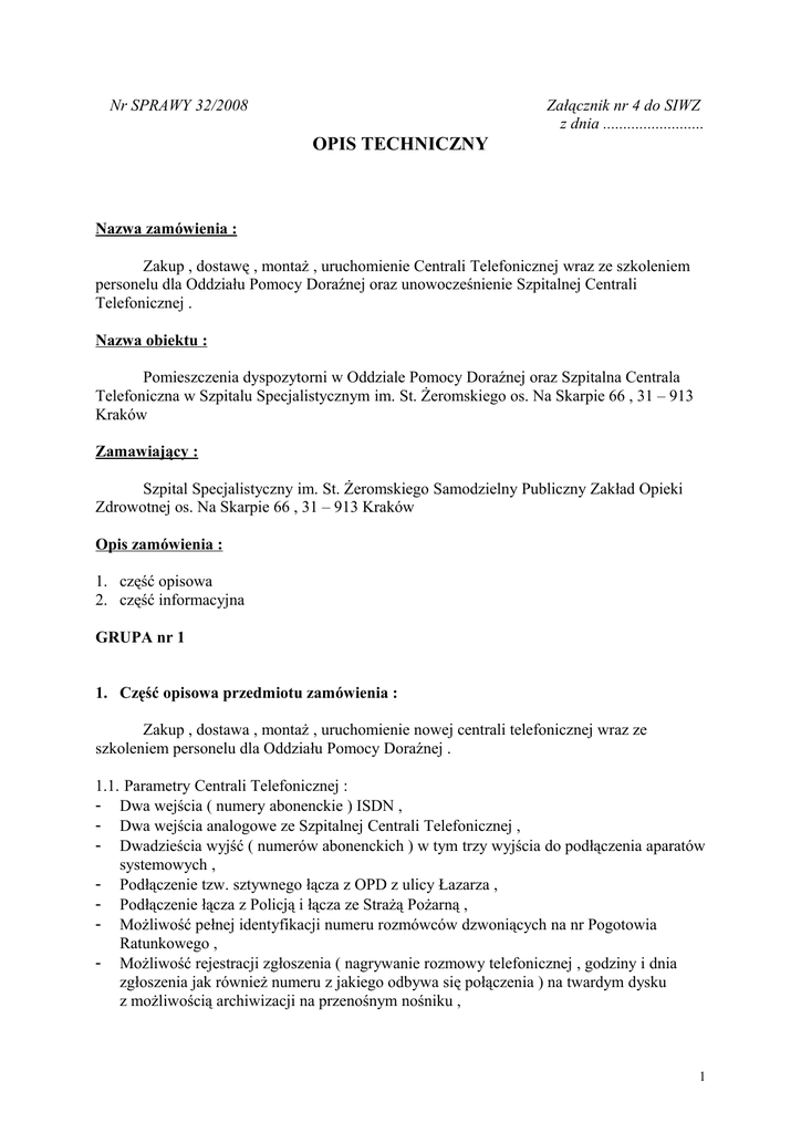 Nr SPRAWY 32/2008 Załącznik nr 4 do SIWZ z dnia ......................... OPIS TECHNICZNY Nazwa zamówienia : Zakup , dostawę , montaż , uruchomienie Centrali Telefonicznej wraz ze szkoleniem personelu dla Oddziału Pomocy Doraźnej oraz unowocześnienie Szpitalnej Centrali Telefonicznej . Nazwa obiektu : Pomieszczenia dyspozytorni w Oddziale Pomocy Doraźnej oraz Szpitalna Centrala Telefoniczna w Szpitalu Specjalistycznym im. St. Żeromskiego os. Na Skarpie 66 , 31 – 913 Kraków Zamawiający : Szpital Specjalistyczny im. St. Żeromskiego Samodzielny Publiczny Zakład Opieki Zdrowotnej os. Na Skarpie 66 , 31 – 913 Kraków Opis zamówienia : 1. część opisowa 2. część informacyjna GRUPA nr 1 1. Część opisowa przedmiotu zamówienia : Zakup , dostawa , montaż , uruchomienie nowej centrali telefonicznej wraz ze szkoleniem personelu dla Oddziału Pomocy Doraźnej . 1.1. Parametry Centrali Telefonicznej : - Dwa wejścia ( numery abonenckie ) ISDN , - Dwa wejścia analogowe ze Szpitalnej Centrali Telefonicznej , - Dwadzieścia wyjść ( numerów abonenckich ) w tym trzy wyjścia do podłączenia aparatów systemowych , - Podłączenie tzw. sztywnego łącza z OPD z ulicy Łazarza , - Podłączenie łącza z Policją i łącza ze Strażą Pożarną , - Możliwość pełnej identyfikacji numeru rozmówców dzwoniących na nr Pogotowia Ratunkowego , - Możliwość rejestracji zgłoszenia ( nagrywanie rozmowy telefonicznej , godziny i dnia zgłoszenia jak również numeru z jakiego odbywa się połączenia ) na twardym dysku z możliwością archiwizacji na przenośnym nośniku , 1 - - Połączenie internetowe pozwalające na zdalną kontrolę ( diagnostykę ) pracy centrali jak również na zmianę podstawowych ustawień , Poczta Głosowa – czas 1 h , Karta zapowiedzi – powitanie w przypadku zajętości łączy , Dwie słuchawki nagłowne dla dyspozytorów . Taryfikacja rozmów telefonicznych , Wejście typu LAN wraz z podłączeniem do sieci Szpitala , Dwie słuchawki nagłowne umożliwiające odbieranie przychodzących połączeń , Wykonanie wszystkich uzgodnienie technicznych z Telekomunikacją Polską S.A. w celu uzyskania w/w parametrów centrali , Komputer : o procesorze Duo 1,6 , twardy dysk – 160 G , pamięć RAM – 512 Mb , nagrywarka DVD , porty USB , monitor 17” , drukarka laserowa , Podłączenie i instalacja komputera z kompletnym oprogramowaniem operacyjnym ( Windows XP Prof. , Microsoft Office 2003 Prof. , program antywirusowy , program do zarządzania centralą telefoniczną ) , Zasilanie rezerwowe akumulatorowe , Instalacja UPS – a stanowiącego awaryjne źródło zasilania dla Centrali Telefonicznej i aparatu telefonicznego w dyspozytorni w przypadku zaniku napięcia w sieci szpitala , Dostaw , montaż i uruchomienie wszystkich aparatów systemowych , Część informacyjna przedmiotu zamówienia : 2.1 Wykonać montaż Centrali Telefonicznej wraz z jej uruchomieniem i szkoleniem personelu w dyspozytorni Oddziału Pomocy Doraźnej , 2.2 Wykonać potrzebne instalację połączeniowe pomiędzy Centralą Telefoniczną i aparatami systemowymi jak również wszystkie inne konieczne teletechniczne połączenia pomiędzy głowicą telefoniczną i centralą , 2.3 Działając z upoważnienia Zleceniodawcy uzgodnić wszystkie konieczne szczegóły z Telekomunikacją Polską S.A. , Strażą Pożarną i Policją , Oddziałem Pomocy Doraźnej z ul. Łazarza , dotyczące tzw. łączy stałych , 2.4 Wykonanie wszystkich uzgodnienie technicznych z Telekomunikacją Polską S.A. w celu uzyskania wymaganych parametrów centrali ( ISDN , łącza stałe , pełna identyfikacja rozmówców ) – zamiana istniejących wejściowych numerów analogowych ze strony TP S.A. na numery cyfrowe , 2.5 Przedstawienie protokołów z pomiarów w/w połączeń . 2. GRUPA nr. 2 1. Część opisowa przedmiotu zamówienia : Zakup , dostawa , montaż : karty Packet Control , karty DS1-INTFC oraz uruchomienie dwóch łączy cyfrowych ISDN PRI 2 Mb wraz z ich oprogramowaniem do centrali telefonicznej typu DEFINITY wraz ze szkoleniem personelu . 1.1 Karta Packet Control , 1.2 Karta DS1-INTFC , 1.3 Oprogramowanie ISDN PRI dla dwóch łączy cyfrowych 2 Mb wraz z udostępnieniem opcji dla tych łączy na bazie istniejącej wersji oprogramowania , 2 1.4 Po dostarczeniu łączy przez operatora – oprogramowanie , uruchomienie i sprawdzenie warstwy użytkowej dla w/w opcji , 1.5 Instalacje i uruchomienie nowego programu taryfikującego wraz z buforem pamięci o pojemności 1 Gb i komputerem do przetwarzania danych taryfikacyjnych , 1.6 Komputer o procesorze Duo 1,6 , twardy dysk – 160 G , pamięć RAM – 512 Mb , nagrywarka DVD , porty USB , monitor 17” LCD , drukarka laserowa , 1.7 Wszystkie zainstalowane programy muszą posiadać licencje ( Windows XP Prof. , Microsoft Office 2003 Prof. , program antywirusowy ) 2. Część informacyjna przedmiotu zamówienia : 2.1 Działając z upoważnienia Zleceniodawcy uzgodnić wszystkie konieczne szczegóły z Telekomunikacją Polską S.A. dotyczące łączy ISDN PRI 30 b+D , 2.2 Zapewnienie gwarancji zainstalowanej karty i wykonanej usługi , 2.3 Wykonanie w/w usługi nie może zakłócić łączności telefonicznej wewnętrznej na terenie Szpitala jak również połączeń z – i do – Szpitala , 2.4 Wszystkie prace związane z w/w zleceniem mogą być wykonywane tylko w obecności Konserwatora Centrali Telefonicznej Szpitala . 3