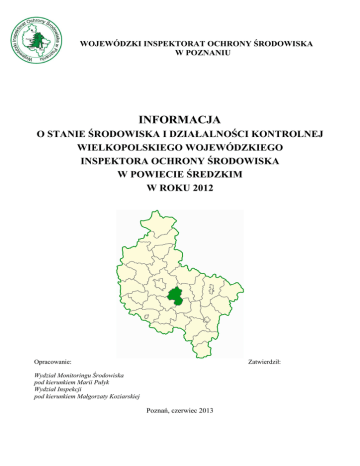 WOJEWÓDZKI INSPEKTORAT OCHRONY ŚRODOWISKA W POZNANIU INFORMACJA O STANIE ŚRODOWISKA I DZIAŁALNOŚCI KONTROLNEJ WIELKOPOLSKIEGO WOJEWÓDZKIEGO INSPEKTORA OCHRONY ŚRODOWISKA W POWIECIE ŚREDZKIM W ROKU 2012 Opracowanie: Zatwierdził: Wydział Monitoringu Środowiska pod kierunkiem Marii Pułyk Wydział Inspekcji pod kierunkiem Małgorzaty Koziarskiej Poznań, czerwiec 2013 2 SPIS TREŚCI WPROWADZENIE 5 2. WYBRANE CECHY POWIATU 6 3. STAN ŚRODOWISKA 9 3.1. Monitoring jakości powietrza 3.2. Monitoring jakości wód 9 10 3.2.1. Monitoring jakości wód powierzchniowych 10 3.2.2. Monitoring jakości wód podziemnych 13 3.3. Monitoring jakości gleby i ziemi 15 3.4. Monitoring hałasu 15 3.5. Monitoring pól elektromagnetycznych 18 3.6. Monitoring gospodarki odpadami 19 3.7. Podsumowanie 22 4. DZIAŁALNOŚĆ KONTROLNA 24 5. POWAŻNE AWARIE 24 3 4 1. WPROWADZENIE Opracowanie ma na celu przedstawienie stanu środowiska oraz wyników działalności kontrolnej Wielkopolskiego Wojewódzkiego Inspektora Ochrony Środowiska na terenie powiatu średzkiego w roku 2012. Do jego przygotowania wykorzystano badania własne WIOŚ w Poznaniu, wyniki badań będące w posiadaniu WIOŚ oraz ustalenia z kontroli użytkowników środowiska, prowadzonych przez inspektorów WIOŚ. Ostateczna ocena stanu środowiska w 2012 roku jest w trakcie opracowywania i po weryfikacji przez GIOŚ zostanie opublikowana w IV kwartale 2013 roku w formie „Raportu o stanie środowiska w Wielkopolsce w roku 2012”. Bieżące informacje dotyczące stanu środowiska na terenie całego wielkopolskiego znaleźć można na stronie internetowej www.poznan.wios.gov.pl. województwa Zadania w zakresie ochrony przyrody, w tym ustanawianie form ochrony przyrody oraz sprawowanie nadzoru nad przestrzeganiem określonych ustawą zakazów w stosunku do tych form, realizuje Regionalny Konserwator Przyrody. 5 2. WYBRANE CECHY POWIATU Powiat średzki położony jest w centralnej części województwa wielkopolskiego, obejmuje obszar o powierzchni 624 km2, a zamieszkują go 56653 osoby (stan na dzień 31.12.2012, wg GUS). Według podziału fizyczno-geograficznego J. Kondrackiego powiat ten położony jest: – w makroregionie Pojezierze Wielkopolsko-Kujawskie: mezoregion Równina Wrzesińska oraz – w makroregionie Pradolina Warciańsko-Odrzańska: mezoregion Kotlina Śremska. Gospodarka powiatu ma charakter rolniczo-przemysłowy; użytki rolne zajmują około 74% powierzchni. Administracyjnie powiat podzielony jest na: ▪ jedną gminę miejsko-wiejską: Środa Wielkopolska, ▪ cztery gminy wiejskie: Dominowo, Krzykosy, Nowe Miasto nad Wartą, Zaniemyśl. Ponad 92% ludności powiatu korzysta z sieci wodociągowej, a 63,3% z sieci kanalizacyjnej (stan na dzień 31 grudnia 2011, dane wg GUS). W ewidencji WIOŚ w Poznaniu znajduje się 37 mechaniczno-biologicznych oczyszczalni ścieków eksploatowanych na terenie powiatu średzkiego. Dane o ilości ścieków komunalnych pochodzą z Wykazów zawierających zbiorcze zestawienia informacji o zakresie korzystania ze środowiska oraz o wysokości należnych opłat. Lp. Gmina 1 2 3 Dominowo 4 5 Krzykosy 6 7 Nowe Miasto nad Wartą Zaniemyśl Łękno Zakład Gospodarki Komunalnej Chwałkowo / Miejskie Przedsiębiorstwo Energetyki Cieplnej Wodociągów i Kanalizacji w Środzie Wielkopolskiej 10 11 12 13 14 15 16 17 Murzynowo Kościelne Urząd Gminy Dominowo Giecz Urząd Gminy Dominowo Chłapowo Zakład Usług Komunalnych w Dominowie Zberki Zakład Usług Komunalnych w Dominowie Sulęcinek Gmina Krzykosy Nowe Miasto nad Wartą Gmina Nowe Miasto nad Wartą Klęka Gmina Nowe Miasto nad Wartą Chocicza Gmina Nowe Miasto nad Wartą 8 9 Miejscowość/Eksploatujący Środa Wlkp. Koszuty Słupia Wielka Szlachcin Winna Góra Zdziechowice Bieganowo Brodowo A Miejskie Przedsiębiorstw o Energetyki Cieplnej Wodociągów i Kanalizacji w Środzie Wielkopolskiej Obszar obsługiwany Murzynowo Kościelne Ilość ścieków w roku 2012 /m3/ 6185 Giecz 3788,4 Dominowo, Chłapowo 54750 Zberki cała gmina Nowe Miasto Klęka, Aleksandrów, Wolica Kozia, Wolica Nowa, Boguszyn (część skanalizowana), Kolniczki, Utrata, Komorze, Teresa, Chocicza cała gmina Miasto Środa Wielkopolska, Kijewo (część wsi), Janowo, Mączniki, Dębicz, Chwałkowo (część wsi w pobliżu oczyszczalni) Koszuty Słupia Wielka Szlachcin Winna Góra Zdziechowice-Pławce Bieganowo część Brodowa 2000 49588,8 52894 67455 93780 156616 1457300 13349 12530 8027 8560 16626 4630 7043 6 Gmina Miejscowość/Eksploatujący Obszar obsługiwany Lp. Gmina Miejscowość/Eksploatujący Obszar obsługiwany 18 19 20 21 22 23 24 25 26 27 28 29 30 31 32 33 34 35 36 37 Środa Wlkp. Brodowo B Brzeziny Chocicza Chudzice Czarne Piątkowo Dębiczek Januszewo Koszuty Huby Nadziejewo Olszewo Pierzchno Połażejewo Romanowo Starkówiec Piątkowski Starkówiec Piątkowski + Czarne Piątkowo Strzeszki Tadeuszewo Topola Zielniki Żabikowo Miejskie Przedsiębiorstwo Energetyki Cieplnej Wodociągów i Kanalizacji w Środzie Wielkopolskiej Lp. Część Brodowa Brzeziny Chocicza Chudzice Czarne Piątkowo Dębiczek Januszewo Koszuty Huby Nadziejewo Olszewo Pierzchno Połażejewo Romanowo Ilość ścieków w roku 2012 /m3/ Ilość ścieków w roku 2012 /m3/ 4595 1092 2216,8 1710 2249 1822 3060 2934 5030 960 1380 5022 6869 Starkówiec Piątkowski 700,8 Starkówiec Piątkowski, Czarne Piątkowo 3486 Strzeszki Tadeuszewo Topola Zielniki Żabikowo 3862,5 1688 3183 3730 1098 Powiat średzki wchodzi w skład Regionu VI gospodarki odpadami komunalnymi w województwie wielkopolskim. Regiony zostały wydzielone w „Planie gospodarki odpadami dla województwa wielkopolskiego na lata 2012-2017” uchwalonym przez Sejmik Województwa Wielkopolskiego w dniu 27 sierpnia 2012 r. Wielkopolskę podzielono na 10 regionów, w każdym z nich wyznaczono też regionalne i zastępcze instalacje do przetwarzania odpadów komunalnych. Region gospodarki odpadami komunalnymi to określony w wojewódzkim p