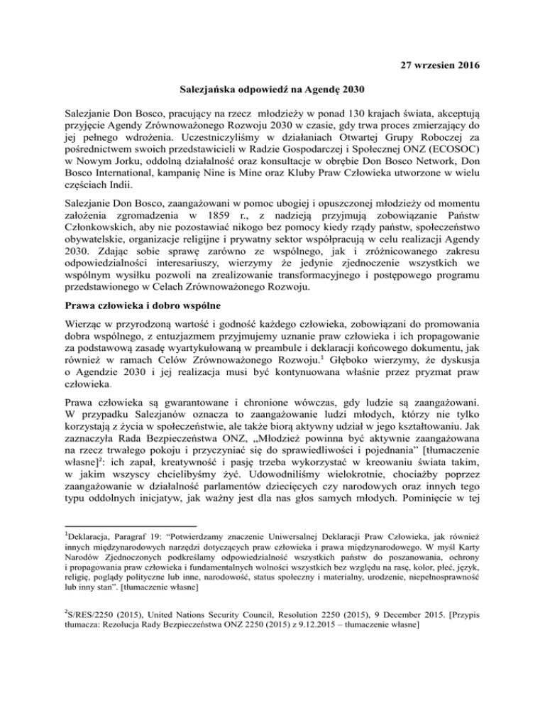 27 wrzesien 2016 Salezjańska odpowiedź na Agendę 2030 Salezjanie Don Bosco, pracujący na rzecz młodzieży w ponad 130 krajach świata, akceptują przyjęcie Agendy Zrównoważonego Rozwoju 2030 w czasie, gdy trwa proces zmierzający do jej pełnego wdrożenia. Uczestniczyliśmy w działaniach Otwartej Grupy Roboczej za pośrednictwem swoich przedstawicieli w Radzie Gospodarczej i Społecznej ONZ (ECOSOC) w Nowym Jorku, oddolną działalność oraz konsultacje w obrębie Don Bosco Network, Don Bosco International, kampanię Nine is Mine oraz Kluby Praw Człowieka utworzone w wielu częściach Indii. Salezjanie Don Bosco, zaangażowani w pomoc ubogiej i opuszczonej młodzieży od momentu założenia zgromadzenia w 1859 r., z nadzieją przyjmują zobowiązanie Państw Członkowskich, aby nie pozostawiać nikogo bez pomocy kiedy rządy państw, społeczeństwo obywatelskie, organizacje religijne i prywatny sektor współpracują w celu realizacji Agendy 2030. Zdając sobie sprawę zarówno ze wspólnego, jak i zróżnicowanego zakresu odpowiedzialności interesariuszy, wierzymy że jedynie zjednoczenie wszystkich we wspólnym wysiłku pozwoli na zrealizowanie transformacyjnego i postępowego programu przedstawionego w Celach Zrównoważonego Rozwoju. Prawa człowieka i dobro wspólne Wierząc w przyrodzoną wartość i godność każdego człowieka, zobowiązani do promowania dobra wspólnego, z entuzjazmem przyjmujemy uznanie praw człowieka i ich propagowanie za podstawową zasadę wyartykułowaną w preambule i deklaracji końcowego dokumentu, jak również w ramach Celów Zrównoważonego Rozwoju.1 Głęboko wierzymy, że dyskusja o Agendzie 2030 i jej realizacja musi być kontynuowana właśnie przez pryzmat praw człowieka. Prawa człowieka są gwarantowane i chronione wówczas, gdy ludzie są zaangażowani. W przypadku Salezjanów oznacza to zaangażowanie ludzi młodych, którzy nie tylko korzystają z życia w społeczeństwie, ale także biorą aktywny udział w jego kształtowaniu. Jak zaznaczyła Rada Bezpieczeństwa ONZ, „Młodzież powinna być aktywnie zaangażowana na rzecz trwałego pokoju i przyczyniać się do sprawiedliwości i pojednania” [tłumaczenie własne]2: ich zapał, kreatywność i pasję trzeba wykorzystać w kreowaniu świata takim, w jakim wszyscy chcielibyśmy żyć. Udowodniliśmy wielokrotnie, chociażby poprzez zaangażowanie w działalność parlamentów dziecięcych czy narodowych oraz innych tego typu oddolnych inicjatyw, jak ważny jest dla nas głos samych młodych. Pominięcie w tej 1 Deklaracja, Paragraf 19: “Potwierdzamy znaczenie Uniwersalnej Deklaracji Praw Człowieka, jak również innych międzynarodowych narzędzi dotyczących praw człowieka i prawa międzynarodowego. W myśl Karty Narodów Zjednoczonych podkreślamy odpowiedzialność wszystkich państw do poszanowania, ochrony i propagowania praw człowieka i fundamentalnych wolności wszystkich bez względu na rasę, kolor, płeć, język, religię, poglądy polityczne lub inne, narodowość, status społeczny i materialny, urodzenie, niepełnosprawność lub inny stan”. [tłumaczenie własne] 2 S/RES/2250 (2015), United Nations Security Council, Resolution 2250 (2015), 9 December 2015. [Przypis tłumacza: Rezolucja Rady Bezpieczeństwa ONZ 2250 (2015) z 9.12.2015 – tłumaczenie własne] debacie któregokolwiek z głównych interesariuszy, szczególnie młodych, z pewnością osłabiłoby nas wszystkich. Kluczem wysoki poziom edukacji, czyli poparcie dla Celu 4 Salezjanie Don Bosco prowadzą działalność duszpasterską i projekty związane z wieloma Celami Zrównoważonego Rozwoju. Chcemy jednak zwrócić szczególną uwagę na Cel 4, dotyczący edukacji. Wierzymy, że wysokiej jakości edukacja jest zarówno prawem, jak i potrzebą młodych ludzi. Jest także fundamentem społeczeństwa, które troszczy się o polepszenie warunków życia i dobrobyt swoich członków. Stawianie na jakość edukacji jest nie tylko fundamentem ludzkiego rozwoju, ale także głównym bodźcem do tworzenia lepszego świata. Edukacja pomaga młodym ludziom w realizacji ich intelektualnego, społecznego i duchowego potencjału, kształtując równocześnie ich charakter, zdolność podejmowania decyzji moralnych oraz daje możliwości awansu społecznego. My, Salezjanie Don Bosco, poprzez liczne (formalne i nieformalne) inicjatywy edukacyjne nieustannie towarzyszymy młodzieży na drodze rozwoju osobistego. Przybiera to najczęściej formę pracy w ich naturalnych środowiskach (szczególnie wśród młodzieży najbardziej potrzebującej) i wsłuchiwania się z uwagą w pytania i aspiracje, aby pomóc im dostrzec i zrealizować nowe możliwości, pojawiające się w ich życiu. Dzięki naszemu zróżnicowanemu systemowi edukacji, kształcimy obecnie ponad 1,2 miliona młodych ludzi w niemal 4000 placówkach - od poziomu przedszkolnego aż do edukacji uniwersyteckiej. Równocześnie pomagamy podobnej liczbie dzieci i młodzieży poprzez różnego typu kluby, centra i organizacje młodzieżowe, oparte o pracę wolontariuszy i rozmaite stowarzyszenia, organizujące im wolny czas. Zapewniamy zarówno szkolenia zawodowe, jak i akademickie (oba na poziomie formalnym i nieformalnym) – holistyczne i integralne, formujące ludzi prawych, gotowych do poświęcenia swojego czasu i talentu dla wzmocnienia rodzin i wspólnot. Kładziemy szczególny nacisk na rolę formacji moralnej i rozwój talentów artystycznych i praktycznych umiejętności w radosnym, otwartym i bezpiecznym środowisku. Dodatkowo uczymy pisania i czytania, prowadzimy kursy integracyjne, adaptacyjne dla osób niepełnosprawnych czy szkolenia z umiejętności praktycznych, jak również edukujemy w zakresie praw człowieka. W czasach, kiedy świat stał się globalną wioską, Salezjanie podkreślają wagę edukacji i mentoringu dzieci, młodzieży i dorosłych. Wyposażamy młodych ludzi w umiejętności, które sprawiają, że staj