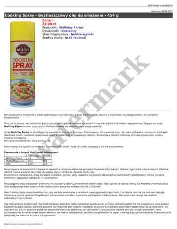 Informacje o produkcie Utworzono 03-03-2017 Cooking Spray - Beztłuszczowy olej do smażenia - 454 g Cena : 24,00 zł er m ar k Producent : Wellsley Farms Dostępność : Dostępny Stan magazynowy : bardzo wysoki Średnia ocena : brak recenzji Nie akceptujemy mieszanek z olejami palmowymi czy roślinnymi. Ceniąc sobie korzyści płynące z właściwości naszego produktu, nie uznajemy kompromisów. Tłuszcze to pyszny, ale najbardziej kaloryczny składnik potraw bo zawierają ponad 2 razy więcej kalorii niż białka i węglowodany. Sięgając po spray Wellsley Farms możesz przyrządzać ulubione potrawy nie martwiąc się o swoją sylwetkę. at Spray Wellsley Farms to bezkaloryczny preparat do smażenia w sprayu. Zastosowanie: do smażenia mięs, ryb, jajek, grilowania, pieczenia i przekąsek. Wspaniały smak i możliwość spożywania nawet w najbardziej wymagających dietach. Znakomity w dietach, eliminuje potrzebę użycia oleju, smalcu, tłuszczu, margaryny. Nie zawiera cholesterolu, sody ani tłuszczu. w Nisko kaloryczny sposób na smażenie. Zawiera o 95% kalorii mniej niż masło, margaryna lub olej na jednostkę. Porównanie z innymi tłuszczami kulinarnymi: Tłuszcz (g) Kalorie Wellsley Farms <1 7 Masło/Margaryna 11,5 104 Olej 13,6 122 Nie przywiera do powierzchni Sprawia że żywność w czasie smażenia nie przywiera do powierzchni naczyń. Ułatwia czyszczenie i mycie naczyń. Patelnie i sztućce można wycierać do czysta bez użycia płynu i skrobania. Zawiera czysty olej. Ekonomiczny i bezpieczny, łatwy do użycia na patelni, garnku, grillu i nawet w naczyniach używanych w kuchenkach mikrofalowych. Chroni naczynia teflonowe i zapobiega zadrapaniu ich powierzchni. Nie zastąpimy oleju magicznym środkiem, nie oszukamy natury zamiennikiem chemicznym, który sprawi że kalorie znikną. Ale możemy zminimalizować ilość podawanego oleju nawet o 97%, dzięki czemu gotujemy dietetycznie ALE I ZDROWO! Nasz Cooking Spray projektowaliśmy tak, aby nie było problemów z zaciekami, nieprzyjemnymi zapachami, czy żeby w puszcze nie zostawał olej gdy ciśnienie w puszce spadnie. Wszystko jest dopracowane na każdym poziomie użytkowania Cooking Spray. Nam pozostaje cieszyć się smakiem niskokalorycznych potraw. Aby maksymalnie wykorzystać moc Cooking Spray, polecamy lekko wstrząsnąć puszką przed użyciem, jednakże potem nie ma znaczenia w jakiej pozycji będziemy puszkę używać, pionowo, poziomo czy nawet do góry nogami. Odległość od patelni czy potrawy powinniśmy dostosować do jej rozmiarów. My zalecamy ok. 20 cm. Daje to największe bezpieczeństwo oraz gwarancje, że cała powierzchnia zostanie idealnie pokryta naszym produktem. Choć zastosowaliśmy wszelkie środki bezpieczeństwa, nie należy rozprowadzać produktu bezpośrednio na ogień. Cooking Spray przechowujemy w temperaturze pokojowej, na wierzchu na półce z przyprawami. Wygenerowano w programie www.oscGold.com er m ar k at w