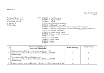Pakiet Nr 1 Załącznik Nr 1 do SIWZ część 1 Przedszkole Miejskie Nr 1 Dyrektor: Anna Szczepanik tel. (0-14) 68 – 12 – 586 ul. Szkotnia 10 39-200 Dębica Lp. CPV: 28520000 – 3 Wyroby metalowe 28528950 – 3 Regały metalowe 29720000 – 2 Sprzęt 29721100 – 0 Urządzenia do gotowania 29711110 – 0 Chłodziarko - zamrażarki 29721100 – 0 Urządzenia do gotowania używane w gospodarstwie domowym 28512000 – 4 Metalowe wyroby stołowe, kuchenne lub artykuły gospodarstwa domowego 28512210 – 9 Naczynia do gotowania 26133100 – 0 Szklana zastawa stołowa 26130000 – 8 Wyroby ze szkła naczyniowego 28512110 – 8 Tacki 28611110 – 2 Noże stołowe 28614000 – 9 Łyżki, widelce 28614100 – 0 Łyżki 28614200 – 1 Widelce Nazwa i szczegółowy opis przedmiotu zamówienia Jednostka miary Ilość jednostek 1 Wiadro ze stali nierdzewnej z pierścieniem i połyskiem – 10 L preferowane wzornictwo np. katalog STALGAST 1/2007 (nr kat. 092100) lub równoważny szt 5 2 Pokrywa do wiadra 10 L ze stali nierdzewnej preferowane wzornictwo np. katalog STALGAST 1/2007 (nr kat. 093100) lub równoważny szt 5 3 Termos metalowy typu „wojskowego” z kranem w całości wykonany ze stali szt 1 Lp. Nazwa i szczegółowy opis przedmiotu zamówienia Jednostka miary Ilość jednostek nierdzewnej; przeznaczony do przewożenia gorących napojów i zup. Pojemność około 25 L preferowane wzornictwo np. katalog internetowy www.robin.com.pl lub równoważny Taboret gazowy 2 – palnikowy GZ - 50 (przeznaczony do podgrzewania, smażenia i gotowania różnego rodzaju potraw, produktów i płynów spożywczych. Obudowa taboretu wykonana ze stali nierdzewnej odpornej na działanie wody i kwasów.) - zapalarka elektryczna; czujnik płomienia - ruszt emaliowany Wymiary około: 90 x 60 x 40 4 szt 2 szt 1 preferowane wzornictwo np. katalog internetowy www.robin.com.pl lub równoważny 5 Naświetlacz szufladowy do jaj - urządzenie do powierzchniowego odkażania jaj - dezynfekuje jednorazowo 30 sztuk jaj - dezynfekcje zapewniają lampy emitujące dawkę promieniowania UV - czas naświetlania ok 60 sekund - wymiary około: 20 x 50 x 40 Lp. Nazwa i szczegółowy opis przedmiotu zamówienia Jednostka miary Ilość jednostek preferowane wzornictwo np. katalog internetowy www.robin.com.pl lub równoważny 6 Chłodziarko – zamrażarka wolnostojąca (preferowane wzornictwo ELECTROLUX ERB 29003 W lub równoważny) - kolor: biały - klasa energetyczna: A - pozycja zamrażalnika dolna - wymiary min.: wysokość 155 +/- 5 cm x szerokość 55-60 x głębokość 55-60 - pojemność chłodziarki min. 200 L - ilość półek min.: 3 - pojemność zamrażarki min. 60 L - ilość komór min. 2 - automatyczne rozmrażanie komory chłodziarki - szklane półki np. szt 1 Lp. Nazwa i szczegółowy opis przedmiotu zamówienia Jednostka miary Ilość jednostek Stół ze stali nierdzewnej z półką dolną; rant tylni Wymiary około: szerokość 60 x wysokość 85 x długość 80 7 szt 1 szt 1 preferowane wzornictwo np. katalog internetowy www.robin.com.pl lub równoważny Stół ze stali nierdzewnej z półką dolną; rant tylni Wymiary około: szerokość 60 x wysokość 85 x długość 150 8 Lp. Nazwa i szczegółowy opis przedmiotu zamówienia Jednostka miary Ilość jednostek preferowane wzornictwo np. katalog internetowy www.robin.com.pl lub równoważny Stół ze stali nierdzewnej z blokiem dwóch szuflad i półką dolną; rant tylni Wymiary około: szerokość 60 x wysokość 85 x długość 110 9 szt 1 szt 1 Regał ze stali nierdzewnej 11 Wymiary około: szerokość 90, głębokość 40, wysokość 200 preferowane wzornictwo np. katalog internetowy www.robin.com.pl lub równoważny szt 1 Regał ze stali nierdzewnej 12 Wymiary około: szerokość 70, głębokość 40, wysokość 200 preferowane wzornictwo np. katalog internetowy www.robin.com.pl lub równoważny szt 2 Regał ze stali nierdzewnej 13 Wymiary około: szerokość 120, głębokość 40, wysokość 200 preferowane wzornictwo np. katalog internetowy www.robin.com.pl lub równoważny szt 1 preferowane wzornictwo np. katalog internetowy www.robin.com.pl lub równoważny Stół ze stali nierdzewnej z blokiem, 2 szufladami i półką dolną; rant tylni Wymiary około: szerokość 60 x wysokość 85 x długość 120 10 preferowane wzornictwo np. katalog internetowy www.robin.com.pl lub równoważny Lp. Nazwa i szczegółowy opis przedmiotu zamówienia Jednostka miary Ilość jednostek Stół ze stali nierdzewnej z szafką Wymiary około: szerokość 50, długość 110, wysokość 85 14 szt 2 szt 2 szt 1 szt 5 Szafka z drzwiami przesuwanymi oraz półką. preferowane wzornictwo np. katalog internetowy www.robin.com.pl lub równoważny Stół ze stali nierdzewnej z półką dolną Wymiary około: szerokość 50, długość 120, wysokość 85 15 preferowane wzornictwo np. katalog internetowy www.robin.com.pl lub równoważny Stół ze stali nierdzewnej z półką dolną Wymiary około: szerokość 50, długość 110, wysokość 85 16 preferowane wzornictwo np. katalog internetowy www.robin.com.pl lub równoważny 17 Garnek średni satynowany ze stali nierdzewnej, trójwarstwowe dno Lp. Nazwa i szczegółowy opis przedmiotu zamówienia Jednostka miary Ilość jednostek Wymiary około: Ø 24; pojemność 5 - 6 L preferowane wzornictwo np. katalog internetowy www.robin.com.pl lub równoważny Pokrywa do garnka, satynowana ze stali nierdzewnej; wymienionego w pozycji 18 nr 17 - Ø około 24 preferowane wzornictwo np. katalog internetowy www.robin.com.pl lub równoważny szt 5 szt 1 Garnek średni satynowany ze stali nierdzewnej 19 Wymiary około: Ø 40; pojemność 28 - 30 L preferowane wzornictwo np. katalog internetowy www.robin.com.pl lub równoważny Lp. Nazwa i szczegółowy opis przedmiotu zamówienia Pokrywa do garnka, satynowana ze stali nierdzewnej; wymienionego w pozycji 20 nr 19 - Ø około 40 preferowane wzornictwo np. katalog STALAST 1/2007 (nr kat. 019400