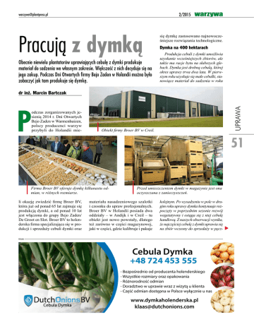 2/2015 [email protected] Pracują z dymką Obecnie niewielu plantatorów uprawiających cebulę z dymki produkuje materiał do sadzenia we własnym zakresie. Większość z nich decyduje się na jego zakup. Podczas Dni Otwartych firmy Bejo Zaden w Holandii można było zobaczyć jak tam produkuje się dymkę. warzywa się dymkę zastosowano najnowocześniejsze rozwiązania technologiczne. Dymka na 400 hektarach Produkcja cebuli z dymki umożliwia uzyskanie wcześniejszych zbiorów, ale także ma racje bytu na słabszych glebach. Dymka jest drobną cebulą, której okres uprawy trwa dwa lata. W pierwszym roku uzyskuje się małe cebulki, stanowiące materiał do sadzenia w roku P odczas zorganizowanych jesienią 2014 r. Dni Otwartych Bejo Zaden w Warmenhuizen, polscy producenci warzyw przybyli do Holandii mie- Obiekt firmy Broer BV w Creil. 51 Firma Broer BV oferuje dymkę kilkunastu odmian, w różnych rozmiarze. li okazję zwiedzić firmę Broer BV, która już od ponad 65 lat zajmuje się produkcją dymki, a od ponad 10 lat jest włączona do grupy Bejo Zaden/ De Groot en Slot. Broer BV to holenderska firma specjalizująca się w produkcji i sprzedaży cebuli dymki oraz UPRAWA dr inż. Marcin Bartczak Przed umieszczeniem dymki w magazynie jest ona oczyszczana z zanieczyszczeń. materiału nasadzeniowego szalotki i czosnku do upraw profesjonalnych. Broer BV w Holandii posiada dwa oddziały – w Andijk i w Creil – tu obiekt jest nowo powstały, dlatego też zarówno w części magazynowej, jaki w części, gdzie kalibruje i pakuje kolejnym. Po wysadzeniu w pole w drugim roku uprawy dymka kontynuuje rozpoczęty w poprzednim sezonie rozwój wegetatywny i osiąga się z niej cebulę handlową. Z naszych obserwacji wynika, że najczęściej cebulę z dymki uprawia się na zbiór wczesny do sprzedaży w pęcz- REKLAMA Cebula Dymka +48 724 453 555 - Bezpośrednio od producenta holenderskiego - Wszystkie rozmiary oraz opakowania - Różnorodność odmian - Doradztwo w uprawie wraz z wizytą u klienta - Część odmian dostępna w Polsce wyłącznie u nas www.dymkaholenderska.pl [email protected] UPRAWA 2/2015 52 [email protected] Towar przed wysyłką do klientów przechowywany jest w skrzyniopaletach. Sortowanie dymki jest zmechanizowane. Zdjęcia: M. Bartczak Troy F1 w kalibrażu 10–14 mm. Red Ray F1 w kalibrażu 14–21. kach z zielonym szczypiorem, a także na cebulę z suchą łuską zbieraną w okresie letnim lub jesiennym. Latem i jesienią cebule z zaschniętą szyjką i suchą łuską mogą być produktem dla przemysłu. Uprawa z dymki sprawia, że cebula jest stosunkowo tolerancyjna na niesprzyjające warunki klimatyczne i glebowe. Dotyczy to zwłaszcza rejonów, gdzie cebula z siewu nie znajduje optymalnych warunków wzrostu, gdyż opóźnienie siewu powoduje nieprawidłowe formowanie zgrubień oraz nierównomierne ich dojrzewanie – informował Henk Jonker, specjalista do spraw sprzedaży i produkcji w firmie Broer BV. REKLAMA CEBULA DYMKA Forum F1 ■ bardzo wczesna odmiana Hercules F1 ■ średni okres wegetacji Sturon ■ średni okres wegetacji SZALOTKA, ECHALION ROZSADY WARZYW ■ seler, por, kapusta, brokuł, kapusta pekińska NASIONA EKOLOGICZNE NASIONA WARZYW GRUNTOWYCH SPRZEDAŻ WYSYŁKOWA Spółka z ograniczoną odpowiedzialnością Sp.K. RADOSŁAW KOBERSKI, ul. Żabikowska 83, 62-052 Komorniki tel./fax: 61 810 85 18, kom. 602 66 16 20, e-mail: [email protected] www.dystrybucjanasion.pl Obiekt w Creil znajduje się kilkadziesiąt kilometrów od siedziby głównej firmy Bejo Zaden. Spółka produkuje cebulę dymkę na powierzchni około 400 ha, co daje produkcję na poziomie 30–40 tys. ton. Od 2012 r. firma Broer BV ma wyłączne prawo do produkcji wszystkich odmian dymki pochodzących z hodowli Bejo Zaden/De Grot en Slot. Są to odmiany: Jagro, Jetset F1, Centurion F1, Radar, Electric i oryginalny Red Baron. Oferta z nowego programu „Quality inside” jest bardzo szeroka i obejmuje kilka wczesnych odmian m.in. Forum F1 i Troy F1 oraz późniejsze kreacje, jak Dymka oznaczoną marką „Quality inside” Genetyka zebrana razem w najnowszych odmianach. Bejo Zaden/De Groot en Slot: rady od specjalistów. Precyzyjne kalibrowanie materiału wysadkowego umoż- liwia uzyskanie wyrównania na polu a co za tym idzie, optymalne dobranie terminów zabiegów ochrony. Ponadto ma wpływ na jednoczesne dojrzewanie i w konsekwencji uzyskanie wysokich plonów wyrównanych cebul. Rygorystycznie kontrolowany, zdrowy produkt. Uprawa pod nadzorem Naktuinbouw według ich standardów i procedur, dopełniona przez system Zarządzania Jakością Bejo: – Produkcja i dostawa pod ścisłym nadzorem. Wysyłana dymka ma pełną identyfikację partii, co jest dowodem kompletnego nadzoru całego procesu produkcji; od uprawy z nasion do zbioru dymki poprzez przechowanie aż do punktu dostarczenia. – Zdrowotność – wybór niezainfekowanych pól, kontrola upraw podczas wzrostu i pozbiorcze sprawdzenie jakości każdej partii w laboratorium. – Kontrola partii pod względem rozmiaru i nieprawidłowości przed wysyłką. – Informacja o ilości sztuk w kg. – Badanie reprezentatywnych próbek na własnym polu doświadczalnym na odrost szczypioru, zgodność z typem i zdrowotność. – Dostawa z certyfikatem jakości. 2/2015 warzywa REKLAMA [email protected] Dymka odmiany Forum F1 oznaczoną marką „Quality inside”. Hercules F1 i Stur BC 20, a także odmiany o czerwonej łusce: Red Light F1 i Red Ray F1. Specjalnością firmy są odmiany: Sherman oraz Hytech F1. W Holandii zbiory dymki przeprowadza się zazwyczaj w sierpniu. Po zbiorach plon dostarczany jest do zakładu, gdzie trafia na linię, która odseparowuje od niego wszelkie zanieczyszczenia. Na końcu tej linii dymka trafia do skrzyń paletowych, które po napełnieniu umieszczane są w magazynie. Tam dzięki systemowi wentylatorów początkowo powietrze jest osuszane przez usunięcie z niego wody, a następnie podgrzewane i do