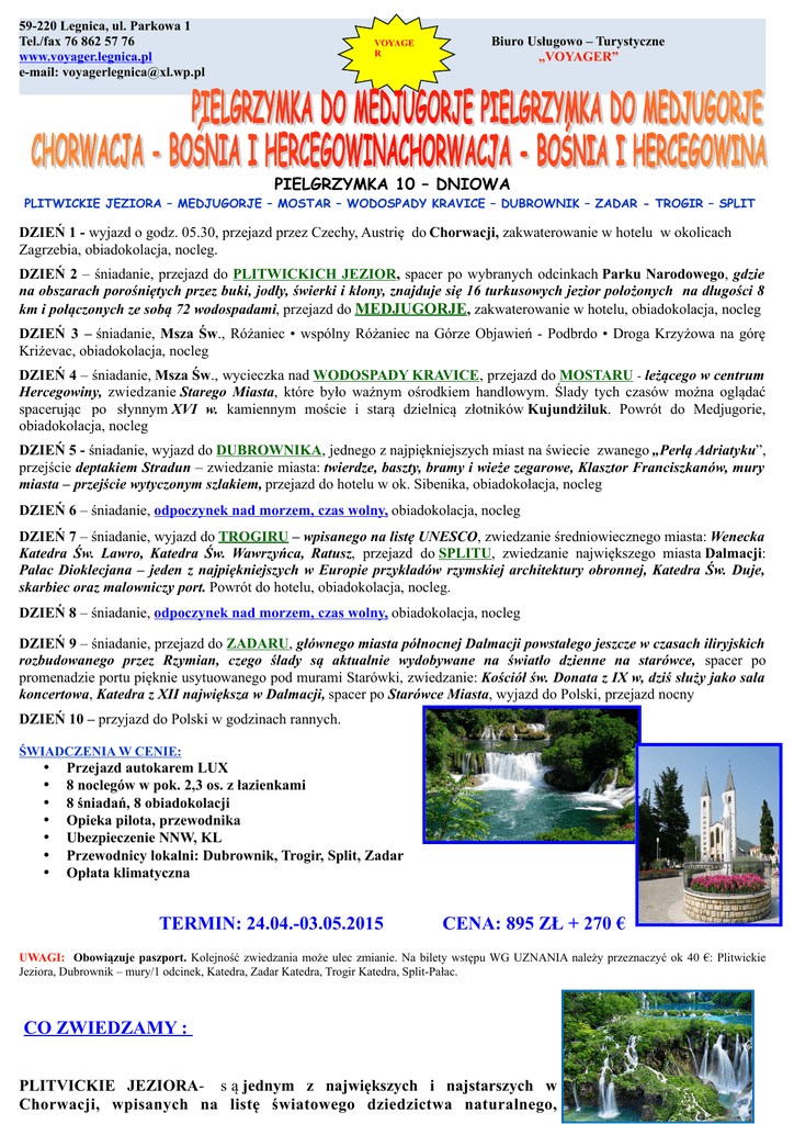 59-220 Legnica, ul. Parkowa 1 Tel./fax 76 862 57 76 www.voyager.legnica.pl e-mail: [email protected] VOYAGE R Biuro Usługowo – Turystyczne „VOYAGER” PIELGRZYMKA 10 – DNIOWA PLITWICKIE JEZIORA – MEDJUGORJE – MOSTAR – WODOSPADY KRAVICE – DUBROWNIK – ZADAR - TROGIR – SPLIT DZIEŃ 1 - wyjazd o godz. 05.30, przejazd przez Czechy, Austrię do Chorwacji, zakwaterowanie w hotelu w okolicach Zagrzebia, obiadokolacja, nocleg. DZIEŃ 2 – śniadanie, przejazd do PLITWICKICH JEZIOR, spacer po wybranych odcinkach Parku Narodowego, gdzie na obszarach porośniętych przez buki, jodły, świerki i klony, znajduje się 16 turkusowych jezior położonych na długości 8 km i połączonych ze sobą 72 wodospadami, przejazd do MEDJUGORJE, zakwaterowanie w hotelu, obiadokolacja, nocleg DZIEŃ 3 – śniadanie, Msza Św., Różaniec • wspólny Różaniec na Górze Objawień - Podbrdo • Droga Krzyżowa na górę Kriżevac, obiadokolacja, nocleg DZIEŃ 4 – śniadanie, Msza Św., wycieczka nad WODOSPADY KRAVICE, przejazd do MOSTARU - leżącego w centrum Hercegowiny, zwiedzanie Starego Miasta, które było ważnym ośrodkiem handlowym. Ślady tych czasów można oglądać spacerując po słynnym XVI w. kamiennym moście i starą dzielnicą złotników Kujundżiluk. Powrót do Medjugorie, obiadokolacja, nocleg DZIEŃ 5 - śniadanie, wyjazd do DUBROWNIKA, jednego z najpiękniejszych miast na świecie zwanego „Perłą Adriatyku”, przejście deptakiem Stradun – zwiedzanie miasta: twierdze, baszty, bramy i wieże zegarowe, Klasztor Franciszkanów, mury miasta – przejście wytyczonym szlakiem, przejazd do hotelu w ok. Sibenika, obiadokolacja, nocleg DZIEŃ 6 – śniadanie, odpoczynek nad morzem, czas wolny, obiadokolacja, nocleg DZIEŃ 7 – śniadanie, wyjazd do TROGIRU – wpisanego na listę UNESCO, zwiedzanie średniowiecznego miasta: Wenecka Katedra Św. Lawro, Katedra Św. Wawrzyńca, Ratusz, przejazd do SPLITU, zwiedzanie największego miasta Dalmacji: Pałac Dioklecjana – jeden z najpiękniejszych w Europie przykładów rzymskiej architektury obronnej, Katedra Św. Duje, skarbiec oraz malowniczy port. Powrót do hotelu, obiadokolacja, nocleg. DZIEŃ 8 – śniadanie, odpoczynek nad morzem, czas wolny, obiadokolacja, nocleg DZIEŃ 9 – śniadanie, przejazd do ZADARU, głównego miasta północnej Dalmacji powstałego jeszcze w czasach iliryjskich rozbudowanego przez Rzymian, czego ślady są aktualnie wydobywane na światło dzienne na starówce, spacer po promenadzie portu pięknie usytuowanego pod murami Starówki, zwiedzanie: Kościół św. Donata z IX w, dziś służy jako sala koncertowa, Katedra z XII największa w Dalmacji, spacer po Starówce Miasta, wyjazd do Polski, przejazd nocny DZIEŃ 10 – przyjazd do Polski w godzinach rannych. ŚWIADCZENIA W CENIE: Przejazd autokarem LUX 8 noclegów w pok. 2,3 os. z łazienkami 8 śniadań, 8 obiadokolacji Opieka pilota, przewodnika Ubezpieczenie NNW, KL Przewodnicy lokalni: Dubrownik, Trogir, Split, Zadar Opłata klimatyczna TERMIN: 24.04.-03.05.2015 CENA: 895 ZŁ + 270 € UWAGI: Obowiązuje paszport. Kolejność zwiedzania może ulec zmianie. Na bilety wstępu WG UZNANIA należy przeznaczyć ok 40 €: Plitwickie Jeziora, Dubrownik – mury/1 odcinek, Katedra, Zadar Katedra, Trogir Katedra, Split-Pałac. CO ZWIEDZAMY : PLITVICKIE JEZIORA- s ą jednym z największych i najstarszych w Chorwacji, wpisanych na listę światowego dziedzictwa naturalnego, 59-220 Legnica, ul. Parkowa 1 Tel./fax 76 862 57 76 www.voyager.legnica.pl e-mail: [email protected] VOYAGE R Biuro Usługowo – Turystyczne „VOYAGER” chronionego przez UNESCO. W parku, na długości ponad 8 km znajduje się 16 turkusowych jezior położonych tarasowo i połączonych ze sobą niezliczoną ilością wodospadów. Spacer po wybranych odcinkach Parku Narodowego. MEDJUGORIE – Medjugorie to miejscowość położona w południowej części Hercegowiny. Jest to bardzo znane i często odwiedzane miejsce pielgrzymkowe w Europie. Znajduje się tam kościół pod wezwaniem św. Jakuba, dom pomocy osobom uzależnionym oraz domy różnych wspólnot - Wspólnoty Błogosławieństw i Oazy Pokoju. Niedaleko tej miejscowości położone są dwa wzgórza: Wzgórze Objawień (Podbrdo), Wzgórze Krzyża (Kriżevac). W miejscach objawień znajdują się krzyże, do których przymocowane są obrazki lub kawałki papieru z życzeniami, obietnicami i prośbami pielgrzymów. Pierwsze objawienie miało miejsce 24. czerwca 1981 roku. MOSTAR - Zwiedzanie starego miasta, które w czasach panowania tureckiego było ważnym ośrodkiem handlowym. Ślady tych czasów możemy oglądać jeszcze dziś s pacerując po s łynnym kamiennym moś cie, s tarą dzielnicą złotników Kujundżiluk, zwiedzając meczet czy też zabytkowy dom turecki. DUBROWNIK- zwiedzanie jednego z najpiękniejszych miast na świecie zwanego „Perłą Adriatyku” wpisanego na listę UNESCO. Spacer urokliwymi uliczkami miasta, podczas którego poznamy jego historię, przejście deptakiem Stradun – zwiedzanie miasta: twierdze, baszty, bramy i wieże zegarowe, Klasztor Franciszkanów, mury Miasta. SPLIT I TROGIR- W Splicie zwiedzimy, wpisany na listę UNESCO pałac cesarza Dioklecjana (IV w.). Zobaczymy także słynne bramy rzymskie prowadzące do miasta, średniowieczny ratusz miejski oraz malowniczy port. Następnie przejazd do Trogiru, miasta wpisanego na listę UNESCO, które ze względu na liczne, cenne zabytki, nazywane jest muzeum pod gołym niebem. Zwiedzanie średniowiecznego miasta: Wenecka Katedra Św. Lawro, Katedra Św. Wawrzyńca, Ratusz. ZADAR- to główne miasto północnej Dalmacji, powstałe jeszcze w czasach iliryjskich rozbudowane przez Rzymian, czego ślady są aktualnie wydobywane na światło dzienne na Starówce, spacer po promenadzie portu pięknie usytuowanego pod murami Starówki, zwiedzanie: Kościół św. Donata z IX w, dziś służy jako sala koncertowa, Katedra z XII największa 