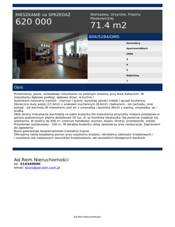 MIESZKANIE na SPRZEDAŻ 620 000 Warszawa, Ursynów, Filipiny Płaskowickiej 71.4 m2 604/5284/OMS Secondary ApartmentBlock 2008 3 4 3 Adjoining 1 Opis Przestronne, jasne, rozkładowe mieszkanie na zielonym Imielinu przy lesie Kabackim. W mieszkaniu dębowe podłogi, dębowe drzwi, w kuchni i łazienkach naturalny kamień - marmur i granit, wysokiej jakości meble i sprzęt kuchenny. Słoneczny duży pokój (27,4m2) z aneksem kuchennym (8,6m2) i balkonem - od zachodu, inne pokoje - od wschodu.W mieszkaniu jest wc z umywalką i łazienka (6m2) z wanną, umywalką, wc i pralką. Obie strony mieszkania wychodzą na patio budynku.Do mieszkania przynalży miejsce postojowe w garażu podziemnym płatne dodatkowo 20 tys. zł. ta komórka lokatorska. Na parterze znajduje się wózkarnia. W okolicy do 500 m: centrum handlowe, Auchan, basen, fitness, przedszkole, szkoła. Przystanek autobusowy - 100 m. W obrębie budynku sklep spożywczy oraz restauracje. Zapraszam do ogladania. Biuro gwarantuje bezpieczeństwo transakcji kupna. Oferujemy także bezpłatną pomoc przy uzyskaniu kredytu: określeniu zdolności kredytowych i i uzyskaniu jak najlepszych warunków kredytowania, we wszystkich dostępnych bankach. Ad Rem Nieruchomości tel. 514340000 email: [email protected] Ad Rem Nieruchomości Powered by TCPDF (www.tcpdf.org)