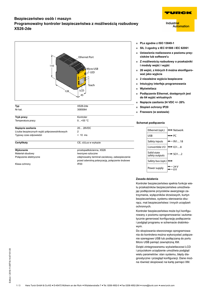 Bezpieczeństwo osób i maszyn Programowalny kontroler bezpieczeństwa z możliwością rozbudowy XS26-2de ■ PLe zgodne z ISO 13849-1 ■ SIL 3 zgodny z IEC 61508 i IEC 62061 ■ Ustawienia realizowane z poziomu przycisków lub software'u ■ Z możliwością rozbudowy o przekaźniki i moduły wejść i wyjść ■ 26 wejść, z których 8 można skonfigurować jako wyjścia ■ 2 niezależne wyjścia bezpieczne ■ Intuicyjny interfejs programowania ■ Wyświetlacz ■ Podłączenie Ethernet, dostępnych jest do 64 wyjść wirtualnych ■ Napięcie zasilania 24 VDC +/- 20% Typ Nr kat. XS26-2de 3085064 Tryb pracy Temperatura pracy Kontroler 0…+55 °C Napięcie zasilania Liczba bezpiecznych wyjść półprzewodnikowych Typowy czas odpowiedzi 20… 28VDC 2 < 10 ms Certyfikaty CE, cULus w wykazie Wykonanie Materiał obudowy Połączenie elektryczne prostopadłościenna, XS26 tworzywo sztuczne zdejmowalny terminal zaciskowy, zabezpieczenie przed odwrotną polaryzacją, połączenie śrubowe IP20 Klasa ochrony ■ Stopień ochrony IP20 ■ Freeware (w zestawie) Schemat podłączenia Zasada działania Kontroler bezpieczeństwa spełnia funkcje wielu przekaźników bezpieczeństwa umożliwiając podłączenie przycisków awaryjnego zatrzymania, wyłączników drzwiowych, kurtyn bezpieczeństwa, systemu sterowania oburącz, mat bezpieczeństwa i innych urządzeń ochronnych. Kontroler bezpieczeństwa może być konfigurowany z poziomu oprogramowania i automatycznie generować konfigurację podłączenia i podgląd programu w schemacie drabinkowym. Do skopiowania stworzonego oprogramowania do kontrolera można wykorzystać połączenie szeregowe USB lub podłączaną do portu Micro USB pamięć zewnętrzną XM. Edition • 2016-11-09T16:14:47+01:00 Dzięki zintegrowanemu wyświetlaczowi LCD i przyciskom urządzenie umożliwia podgląd wielu parametrów: stan systemu, błędy diagnostyczne i przegląd konfiguracji. Dane można również skopiować na kartę pamięci XM. 1/3 Hans Turck GmbH & Co.KG ñ D-45472 Mülheim an der Ruhr ñ Witzlebenstraße 7 ñ Tel. 0208 4952-0 ñ Fax 0208 4952-264 ñ [email protected] ñ www.turck.com Bezpieczeństwo osób i maszyn Programowalny kontroler bezpieczeństwa z możliwością rozbudowy XS26-2de Akcesoria - okablowanie Typ Nr kat. SC-TC2 3085078 Terminale klatkowe; 8 portów Rysunek wymiarowy SC-TS2 3085076 Terminale klatkowe; 8 portów SC-XMP2 3029482 Adapter programujący Akcesoria - funkcja Typ Nr kat. SC-USB2 3029480 Rysunek wymiarowy SC-XM2 3029481 Zewnętrzna karta pamięci, Micro-B; konfiguracja EEPROM Resource CD 3090443 CD-ROM, oprogramowanie konfiguracyjne, instrukcja uru- XS8si 3085070 Moduł wejść bezpieczeństwa (8 wejść) XS16si 3085069 Moduł wejść bezpieczeństwa (16 wejść) XS2so 3085072 Moduł wyjść bezpieczeństwa (2 wyjścia) XS4so 3085073 Moduł wyjść bezpieczeństwa (4 wyjścia) Przewód USB połączenia szeregowego, typ A do Micro-B; długość: 1,8m Edition • 2016-11-09T16:14:47+01:00 chomienia; 2/3 Hans Turck GmbH & Co.KG ñ D-45472 Mülheim an der Ruhr ñ Witzlebenstraße 7 ñ Tel. 0208 4952-0 ñ Fax 0208 4952-264 ñ [email protected] ñ www.turck.com Bezpieczeństwo osób i maszyn Programowalny kontroler bezpieczeństwa z możliwością rozbudowy XS26-2de Akcesoria - funkcja Nr kat. XS1ro 3085074 2-kanałowy przekaźnik bezpieczeństwa (1 wyjście) Rysunek wymiarowy XS2ro 3085075 2-kanałowy przekaźnik bezpieczeństwa (2 wyjścia) Edition • 2016-11-09T16:14:47+01:00 Typ 3/3 Hans Turck GmbH & Co.KG ñ D-45472 Mülheim an der Ruhr ñ Witzlebenstraße 7 ñ Tel. 0208 4952-0 ñ Fax 0208 4952-264 ñ [email protected] ñ www.turck.com