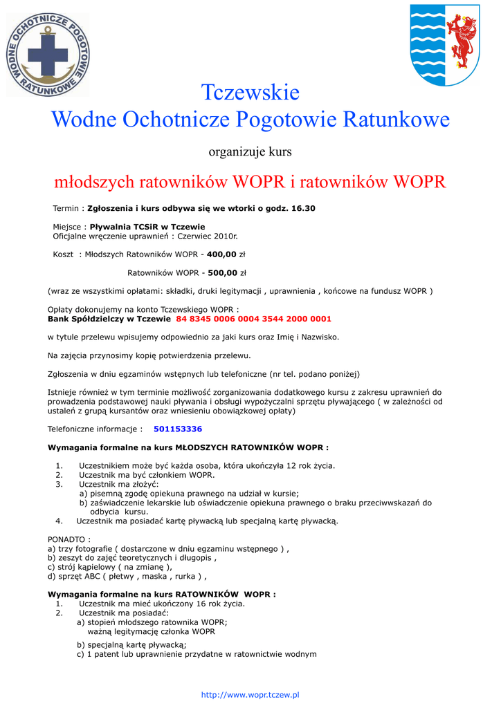 Tczewskie Wodne Ochotnicze Pogotowie Ratunkowe organizuje kurs młodszych ratowników WOPR i ratowników WOPR Termin : Zgłoszenia i kurs odbywa się we wtorki o godz. 16.30 Miejsce : Pływalnia TCSiR w Tczewie Oficjalne wręczenie uprawnień : Czerwiec 2010r. Koszt : Młodszych Ratowników WOPR - 400,00 zł Ratowników WOPR - 500,00 zł (wraz ze wszystkimi opłatami: składki, druki legitymacji , uprawnienia , końcowe na fundusz WOPR ) Opłaty dokonujemy na konto Tczewskiego WOPR : Bank Spółdzielczy w Tczewie 84 8345 0006 0004 3544 2000 0001 w tytule przelewu wpisujemy odpowiednio za jaki kurs oraz Imię i Nazwisko. Na zajęcia przynosimy kopię potwierdzenia przelewu. Zgłoszenia w dniu egzaminów wstępnych lub telefoniczne (nr tel. podano poniŜej) Istnieje równieŜ w tym terminie moŜliwość zorganizowania dodatkowego kursu z zakresu uprawnień do prowadzenia podstawowej nauki pływania i obsługi wypoŜyczalni sprzętu pływającego ( w zaleŜności od ustaleń z grupą kursantów oraz wniesieniu obowiązkowej opłaty) Telefoniczne informacje : 501153336 Wymagania formalne na kurs MŁODSZYCH RATOWNIKÓW WOPR : 1. 2. 3. 4. Uczestnikiem moŜe być kaŜda osoba, która ukończyła 12 rok Ŝycia. Uczestnik ma być członkiem WOPR. Uczestnik ma złoŜyć: a) pisemną zgodę opiekuna prawnego na udział w kursie; b) zaświadczenie lekarskie lub oświadczenie opiekuna prawnego o braku przeciwwskazań do odbycia kursu. Uczestnik ma posiadać kartę pływacką lub specjalną kartę pływacką. PONADTO : a) trzy fotografie ( dostarczone w dniu egzaminu wstępnego ) , b) zeszyt do zajęć teoretycznych i długopis , c) strój kąpielowy ( na zmianę ), d) sprzęt ABC ( płetwy , maska , rurka ) , Wymagania formalne na kurs RATOWNIKÓW WOPR : 1. Uczestnik ma mieć ukończony 16 rok Ŝycia. 2. Uczestnik ma posiadać: a) stopień młodszego ratownika WOPR; waŜną legitymację członka WOPR b) specjalną kartę pływacką; c) 1 patent lub uprawnienie przydatne w ratownictwie wodnym http://www.wopr.tczew.pl