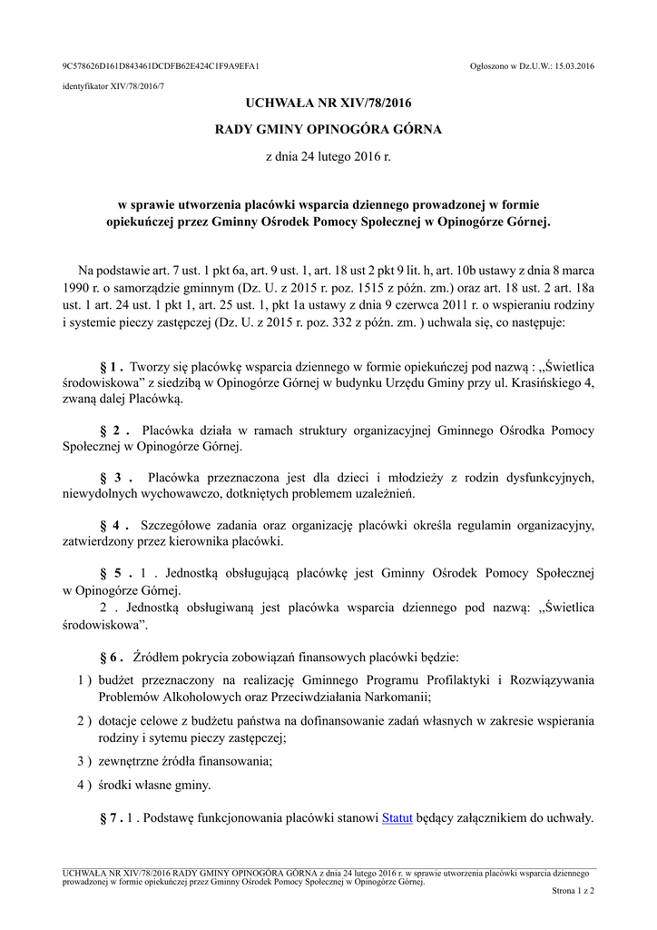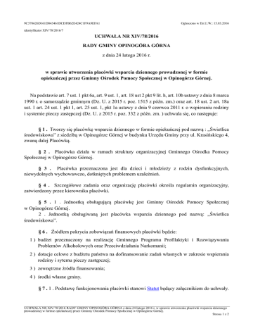 9C578626D161D843461DCDFB62E424C1F9A9EFA1 Ogłoszono w Dz.U.W.: 15.03.2016 identyfikator XIV/78/2016/7 UCHWAŁA NR XIV/78/2016 RADY GMINY OPINOGÓRA GÓRNA z dnia 24 lutego 2016 r. w sprawie utworzenia placówki wsparcia dziennego prowadzonej w formie opiekuńczej przez Gminny Ośrodek Pomocy Społecznej w Opinogórze Górnej. Na podstawie art. 7 ust. 1 pkt 6a, art. 9 ust. 1, art. 18 ust 2 pkt 9 lit. h, art. 10b ustawy z dnia 8 marca 1990 r. o samorządzie gminnym (Dz. U. z 2015 r. poz. 1515 z późn. zm.) oraz art. 18 ust. 2 art. 18a ust. 1 art. 24 ust. 1 pkt 1, art. 25 ust. 1, pkt 1a ustawy z dnia 9 czerwca 2011 r. o wspieraniu rodziny i systemie pieczy zastępczej (Dz. U. z 2015 r. poz. 332 z późn. zm. ) uchwala się, co następuje: § 1 . Tworzy się placówkę wsparcia dziennego w formie opiekuńczej pod nazwą : ,,Świetlica środowiskowa” z siedzibą w Opinogórze Górnej w budynku Urzędu Gminy przy ul. Krasińskiego 4, zwaną dalej Placówką. § 2 . Placówka działa w ramach struktury organizacyjnej Gminnego Ośrodka Pomocy Społecznej w Opinogórze Górnej. § 3 . Placówka przeznaczona jest dla dzieci i młodzieży z rodzin dysfunkcyjnych, niewydolnych wychowawczo, dotkniętych problemem uzależnień. § 4 . Szczegółowe zadania oraz organizację placówki określa regulamin organizacyjny, zatwierdzony przez kierownika placówki. § 5 . 1 . Jednostką obsługującą placówkę jest Gminny Ośrodek Pomocy Społecznej w Opinogórze Górnej. 2 . Jednostką obsługiwaną jest placówka wsparcia dziennego pod nazwą: ,,Świetlica środowiskowa”. § 6 . Źródłem pokrycia zobowiązań finansowych placówki będzie: 1 ) budżet przeznaczony na realizację Gminnego Programu Profilaktyki i Rozwiązywania Problemów Alkoholowych oraz Przeciwdziałania Narkomanii; 2 ) dotacje celowe z budżetu państwa na dofinansowanie zadań własnych w zakresie wspierania rodziny i sytemu pieczy zastępczej; 3 ) zewnętrzne źródła finansowania; 4 ) środki własne gminy. § 7 . 1 . Podstawę funkcjonowania placówki stanowi Statut będący załącznikiem do uchwały. _________________________________________________________________________________________________________________________ UCHWAŁA NR XIV/78/2016 RADY GMINY OPINOGÓRA GÓRNA z dnia 24 lutego 2016 r. w sprawie utworzenia placówki wsparcia dziennego prowadzonej w formie opiekuńczej przez Gminny Ośrodek Pomocy Społecznej w Opinogórze Górnej. Strona 1 z 2 9C578626D161D843461DCDFB62E424C1F9A9EFA1 Ogłoszono w Dz.U.W.: 15.03.2016 2 . Regulamin organizacyjny placówki wsparcia dziennego zatwierdza kierownik placówki. § 8 . Wykonanie uchwały powierza się Wójtowi Gminy Opinogóra Górna. § 9 . Uchwała wchodzi w życie po upływie 14 dni od dnia ogłoszenia w Dzienniku Urzędowym Województwa Mazowieckiego. Przewodniczący Rady Gminy Jolanta Grochowska Elektronicznie podpisany przez: Jolanta Grochowska Data: 2016.02.24 14:36:24 Odcisk palca certyfikatu: 8291 fda 8462 633d 610 89b4 70c3 9c4 e11f 4fac _________________________________________________________________________________________________________________________ UCHWAŁA NR XIV/78/2016 RADY GMINY OPINOGÓRA GÓRNA z dnia 24 lutego 2016 r. w sprawie utworzenia placówki wsparcia dziennego prowadzonej w formie opiekuńczej przez Gminny Ośrodek Pomocy Społecznej w Opinogórze Górnej. Strona 2 z 2