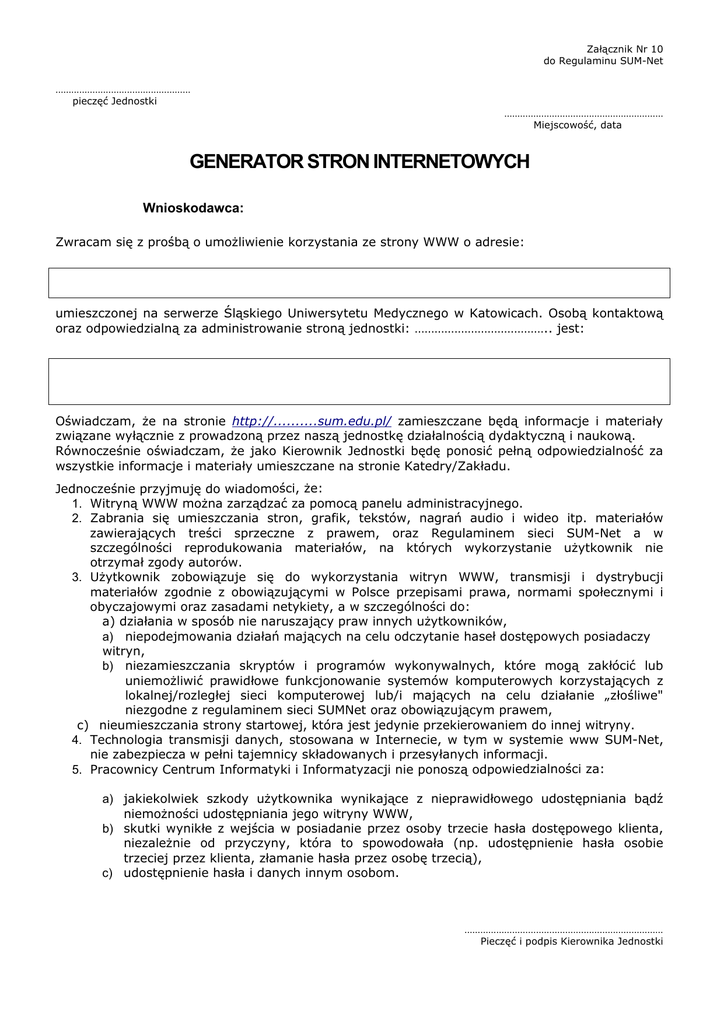 Załącznik Nr 10 do Regulaminu SUM-Net …………………………………………… pieczęć Jednostki …………………………………………………… Miejscowość, data GENERATOR STRON INTERNETOWYCH Wnioskodawca: Zwracam się z prośbą o umożliwienie korzystania ze strony WWW o adresie: umieszczonej na serwerze Śląskiego Uniwersytetu Medycznego w Katowicach. Osobą kontaktową oraz odpowiedzialną za administrowanie stroną jednostki: ………………………………….. jest: Oświadczam, że na stronie http://..........sum.edu.pl/ zamieszczane będą informacje i materiały związane wyłącznie z prowadzoną przez naszą jednostkę działalnością dydaktyczną i naukową. Równocześnie oświadczam, że jako Kierownik Jednostki będę ponosić pełną odpowiedzialność za wszystkie informacje i materiały umieszczane na stronie Katedry/Zakładu. Jednocześnie przyjmuję do wiadomości, że: 1. Witryną WWW można zarządzać za pomocą panelu administracyjnego. 2. Zabrania się umieszczania stron, grafik, tekstów, nagrań audio i wideo itp. materiałów zawierających treści sprzeczne z prawem, oraz Regulaminem sieci SUM-Net a w szczególności reprodukowania materiałów, na których wykorzystanie użytkownik nie otrzymał zgody autorów. 3. Użytkownik zobowiązuje się do wykorzystania witryn WWW, transmisji i dystrybucji materiałów zgodnie z obowiązującymi w Polsce przepisami prawa, normami społecznymi i obyczajowymi oraz zasadami netykiety, a w szczególności do: a) działania w sposób nie naruszający praw innych użytkowników, a) niepodejmowania działań mających na celu odczytanie haseł dostępowych posiadaczy witryn, b) niezamieszczania skryptów i programów wykonywalnych, które mogą zakłócić lub uniemożliwić prawidłowe funkcjonowanie systemów komputerowych korzystających z lokalnej/rozległej sieci komputerowej lub/i mających na celu działanie „złośliwe" niezgodne z regulaminem sieci SUMNet oraz obowiązującym prawem, c) nieumieszczania strony startowej, która jest jedynie przekierowaniem do innej witryny. 4. Technologia transmisji danych, stosowana w Internecie, w tym w systemie www SUM-Net, nie zabezpiecza w pełni tajemnicy składowanych i przesyłanych informacji. 5. Pracownicy Centrum Informatyki i Informatyzacji nie ponoszą odpowiedzialności za: a) jakiekolwiek szkody użytkownika wynikające z nieprawidłowego udostępniania bądź niemożności udostępniania jego witryny WWW, b) skutki wynikłe z wejścia w posiadanie przez osoby trzecie hasła dostępowego klienta, niezależnie od przyczyny, która to spowodowała (np. udostępnienie hasła osobie trzeciej przez klienta, złamanie hasła przez osobę trzecią), c) udostępnienie hasła i danych innym osobom. ………………………………………………………………… Pieczęć i podpis Kierownika Jednostki