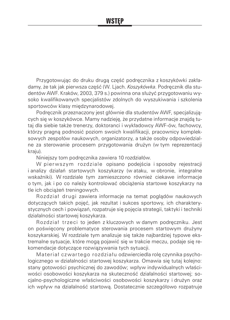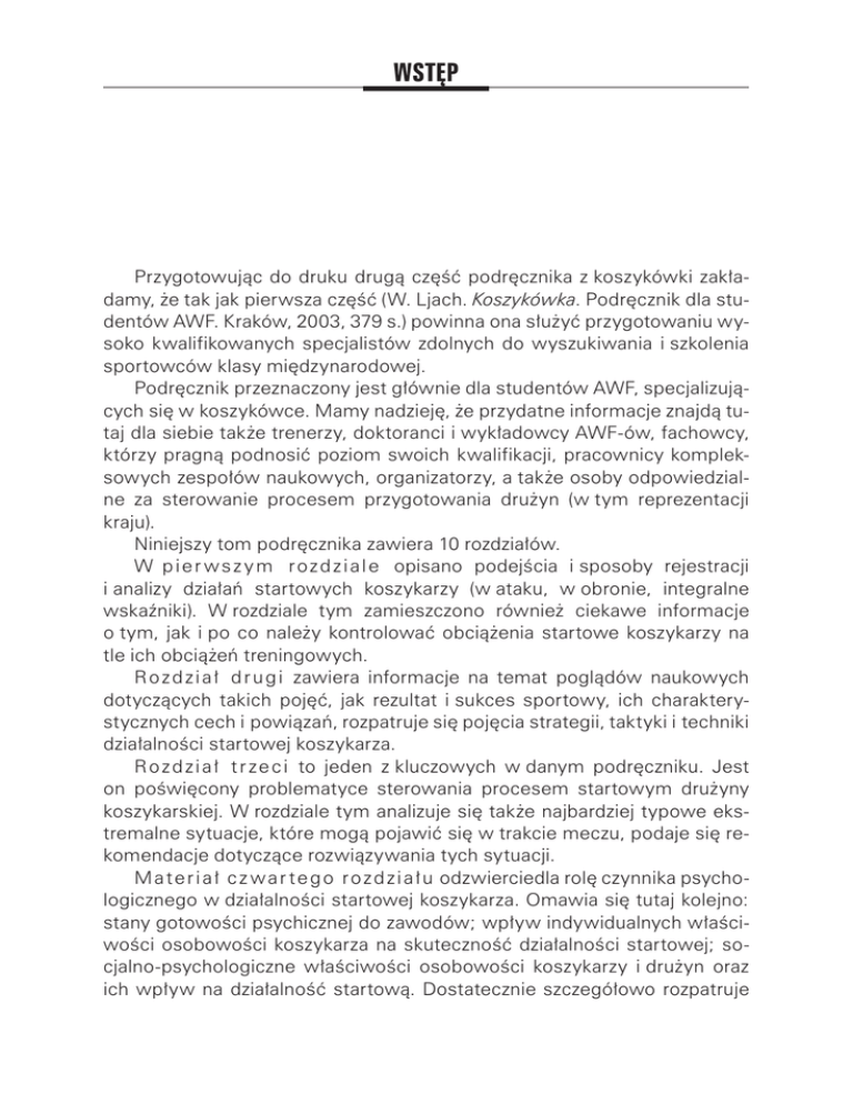 WSTĘP Przygotowując do druku drugą część podręcznika z koszykówki zakładamy, że tak jak pierwsza część (W. Ljach. Koszykówka. Podręcznik dla studentów AWF. Kraków, 2003, 379 s.) powinna ona służyć przygotowaniu wysoko kwalifikowanych specjalistów zdolnych do wyszukiwania i szkolenia sportowców klasy międzynarodowej. Podręcznik przeznaczony jest głównie dla studentów AWF, specjalizujących się w koszykówce. Mamy nadzieję, że przydatne informacje znajdą tutaj dla siebie także trenerzy, doktoranci i wykładowcy AWF-ów, fachowcy, którzy pragną podnosić poziom swoich kwalifikacji, pracownicy kompleksowych zespołów naukowych, organizatorzy, a także osoby odpowiedzialne za sterowanie procesem przygotowania drużyn (w tym reprezentacji kraju). Niniejszy tom podręcznika zawiera 10 rozdziałów. W p i e r w s z y m r ozd z i a l e opisano podejścia i sposoby rejestracji i analizy działań startowych koszykarzy (w ataku, w obronie, integralne wskaźniki). W rozdziale tym zamieszczono również ciekawe informacje o tym, jak i po co należy kontrolować obciążenia startowe koszykarzy na tle ich obciążeń treningowych. Rozd z i a ł d r u g i zawiera informacje na temat poglądów naukowych dotyczących takich pojęć, jak rezultat i sukces sportowy, ich charakterystycznych cech i powiązań, rozpatruje się pojęcia strategii, taktyki i techniki działalności startowej koszykarza. Rozd z i a ł t r ze c i to jeden z kluczowych w danym podręczniku. Jest on poświęcony problematyce sterowania procesem startowym drużyny koszykarskiej. W rozdziale tym analizuje się także najbardziej typowe ekstremalne sytuacje, które mogą pojawić się w trakcie meczu, podaje się rekomendacje dotyczące rozwiązywania tych sytuacji. M a te r i a ł c z w a r te g o r ozd z i a ł u odzwierciedla rolę czynnika psychologicznego w działalności startowej koszykarza. Omawia się tutaj kolejno: stany gotowości psychicznej do zawodów; wpływ indywidualnych właściwości osobowości koszykarza na skuteczność działalności startowej; socjalno-psychologiczne właściwości osobowości koszykarzy i drużyn oraz ich wpływ na działalność startową. Dostatecznie szczegółowo rozpatruje 8 WSTĘP się stosunki interpersonalne w systemach „koszykarz – koszykarz”, „trener – koszykarz”, a także analizuje się problem lidera w drużynach koszykarskich. W r ozd z i a l e p i ą t y m zebrano interesujący materiał na temat działalności trenera w koszykówce. Pokazano w jakim celu należy i jak powinno się badać osobowość trenera. Poczyniono próbę przedstawienia najbardziej znaczących cech zawodowych i cech osobowości wybitnych trenerów (głównie tych, którzy doprowadzili swoich zawodników do złotych medali olimpijskich). Zaprezentowano hierarchię cech trenerów na podstawie ocen profesjonalnych graczy, zamieszcza się empiryczny materiał dotyczący wpływu stresu podczas zawodów na uzewnętrznianie się emocji w postaci reakcji sytemu sercowo-naczyniowego trenerów; analizuje się cechy osobowościowe trenerów – kobiet. Niniejszy rozdział kończy się przedstawieniem ważnych dla szkoleniowców zaleceń w zakresie ich przygotowania psychologicznego i podnoszenia kwalifikacji. W r ozd z i a l e s zó s t y m zebrano wszystko, co wiąże się z przeprowadzaniem zawodów w koszykówce. S i ó d my r ozd z i a ł zawiera materiał o organizacji i funkcjonowaniu sztabu drużyny koszykarskiej w ekstraklasie, a r ozd z i a ł ó s my o sprzęcie i wyposażeniu bazy klubu koszykarskiego. W przedostatnim – d z i e w i ą t y m r ozd z i a l e – podano informacje dotyczące problematyki rankingu i jego przydatności w koszykówce, a także przykłady z praktyki. Rozd z i a ł d z i e s i ą t y jest jednym z ważniejszych, przede wszystkim dla studentów, doktorantów i trenerów, którzy chcą się zajmować pracą naukowo-badawczą. Omówiono w nim tutaj współczesne treści i etapy pracy naukowo-badawczej; podaje się jak najlepiej i w sposób prawidłowy dokonać wyboru tematu przyszłej pracy magisterskiej i doktorskiej; od czego należy zacząć i jak pracować z literaturą. Przedstawiono też charakterystykę metod badań stosowanych w kontroli działalności treningowej i startowej koszykarzy itd. Zdajemy sobie sprawę, że nie wszystkie problemy szczególnie związane z walką sportową zostały kompletnie i wszechstronnie omówione w proponowanym podręczniku. Dokonanie tego w jednej książce i przez jednego autora jest praktycznie niemożliwe, chociażby dlatego, że w wielu aspektach działalności treningowej i startowej koszykarzy prowadzone są różnorodne badania przez licznych naukowców z różnych państw. Jako autorowi, jest mi szczególnie żal, że czytelnik nie znajdzie w podręczniku wyników badań naukowców argentyńskich, włoskich, hiszpańskich, greckich i francuskich. A przecież drużyny z tych państw, szczególnie w ostatnim okresie WSTĘP 9 pretendują do miana wiodących w Europie i na świecie. No cóż, będziemy doskonalić materiał podręcznika w przyszłości wspólnie z naszymi uczniami. Trzeba natomiast podkreślić, że w drugiej części podręcznika o wiele obszerniej i pełniej niż w pierwszej przedstawiono rezultaty badań polskich specjalistów, którym wyrażamy nasze podziękowania. Tych zaś, na których nie powoływaliśmy się w podręczniku, a których poglądy powinny były się tutaj znaleźć, pragniemy szczerze przeprosić. Jednakże i jednych i drugich prosimy o przesłanie pod adresem redakcji swoich uwag i wskazówek, za które z góry dziękujemy. Zostaną one uwzględnione w kolejnym wydaniu podręcznika. Autor