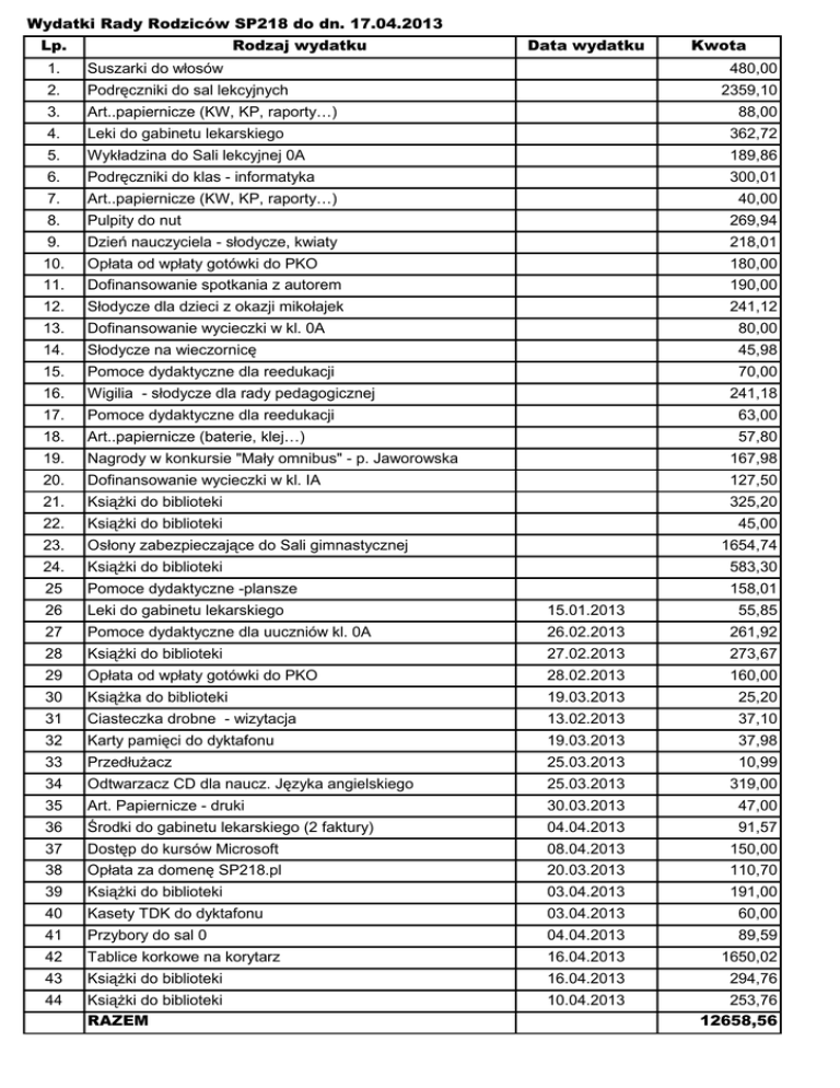 Lista wydatków Rady Rodziców do dn 17.04.2013