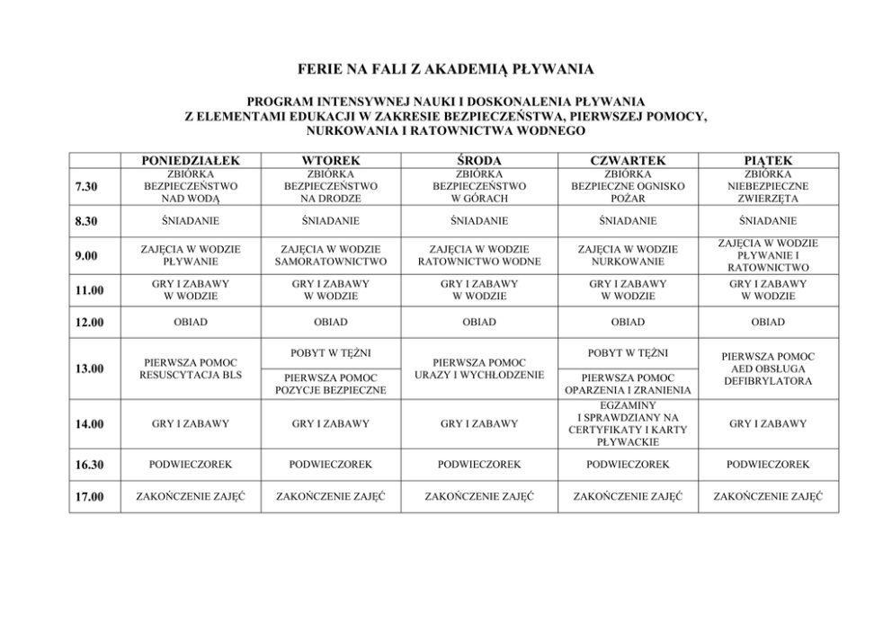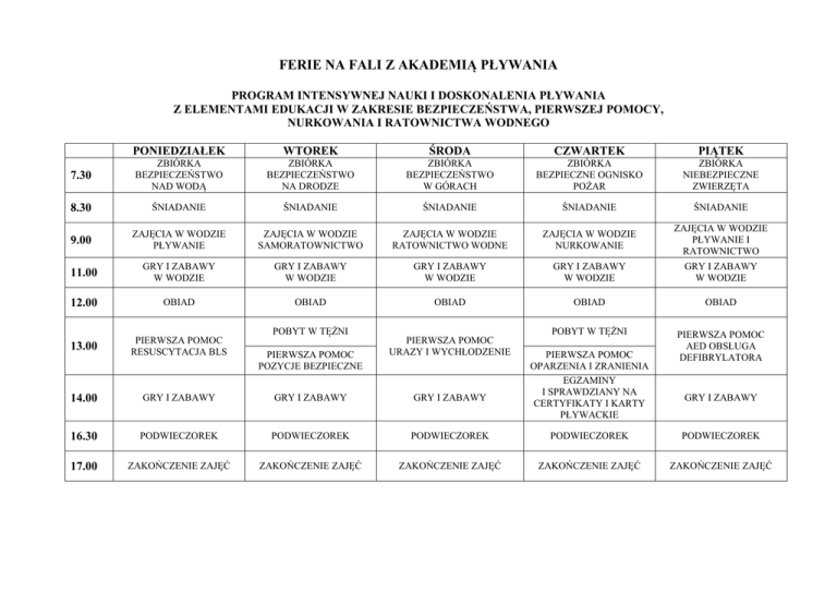 FERIE NA FALI Z AKADEMIĄ PŁYWANIA PROGRAM INTENSYWNEJ NAUKI I DOSKONALENIA PŁYWANIA Z ELEMENTAMI EDUKACJI W ZAKRESIE BEZPIECZEŃSTWA, PIERWSZEJ POMOCY, NURKOWANIA I RATOWNICTWA WODNEGO PONIEDZIAŁEK WTOREK ŚRODA CZWARTEK PIĄTEK 7.30 ZBIÓRKA BEZPIECZEŃSTWO NAD WODĄ ZBIÓRKA BEZPIECZEŃSTWO NA DRODZE ZBIÓRKA BEZPIECZEŃSTWO W GÓRACH ZBIÓRKA BEZPIECZNE OGNISKO POŻAR ZBIÓRKA NIEBEZPIECZNE ZWIERZĘTA 8.30 ŚNIADANIE ŚNIADANIE ŚNIADANIE ŚNIADANIE ŚNIADANIE 9.00 ZAJĘCIA W WODZIE PŁYWANIE ZAJĘCIA W WODZIE SAMORATOWNICTWO ZAJĘCIA W WODZIE RATOWNICTWO WODNE ZAJĘCIA W WODZIE NURKOWANIE ZAJĘCIA W WODZIE PŁYWANIE I RATOWNICTWO 11.00 GRY I ZABAWY W WODZIE GRY I ZABAWY W WODZIE GRY I ZABAWY W WODZIE GRY I ZABAWY W WODZIE GRY I ZABAWY W WODZIE 12.00 OBIAD OBIAD OBIAD OBIAD OBIAD 13.00 PIERWSZA POMOC RESUSCYTACJA BLS 14.00 GRY I ZABAWY GRY I ZABAWY GRY I ZABAWY 16.30 PODWIECZOREK PODWIECZOREK PODWIECZOREK PODWIECZOREK PODWIECZOREK 17.00 ZAKOŃCZENIE ZAJĘĆ ZAKOŃCZENIE ZAJĘĆ ZAKOŃCZENIE ZAJĘĆ ZAKOŃCZENIE ZAJĘĆ ZAKOŃCZENIE ZAJĘĆ POBYT W TĘŻNI PIERWSZA POMOC POZYCJE BEZPIECZNE PIERWSZA POMOC URAZY I WYCHŁODZENIE POBYT W TĘŻNI PIERWSZA POMOC OPARZENIA I ZRANIENIA EGZAMINY I SPRAWDZIANY NA CERTYFIKATY I KARTY PŁYWACKIE PIERWSZA POMOC AED OBSŁUGA DEFIBRYLATORA GRY I ZABAWY ZAJĘCIA W WODZIE – intensywna nauka i doskonalenie pływania przez dwie godziny dziennie od poniedziałku do piątku. Nauka nurkowania ze sprzętem ABC (maska, „fajka”, płetwy), pokaz nurkowania z aqualungiem i dla chętnych próba pod indywidualnym nadzorem instruktora. Nauka bezpiecznych zachowań nad wodą, elementy samoratownictwa w wodzie i ratownictwa wodnego - użycie rzutki, koła i pasa ratowniczego oraz boi Słoneczny Patrol. Profilaktyka utonięć i urazów kręgosłupa. GRY I ZABAWY W WODZIE – czas przeznaczony na zabawy i gry prowadzone przez instruktora: rybak i ryby, wyścigi zaprzęgów, gra w piłkę wodną, koszykówkę i siatkówkę, korzystanie za zjeżdżalni, basenu z falą, kurtyn i gejzerów. PIERWSZA POMOC I BEZPIECZEŃSTWO – zajęcia mają na celu nauczenie postępowania w sytuacji zagrożenia zdrowia lub życia. Zajęcia przeprowadzane będą przy użyciu manekinów do nauki resuscytacji krążeniowo-oddechowej zgodnie z nowymi wytycznymi Europejskiej Rady Resuscytacji. Nauczany algorytm BLS obejmuje: zapewnienie sobie i poszkodowanemu bezpieczeństwa, ocenę przytomności i oznak życia (sprawdzenie oddechu), wezwanie pomocy, prowadzenie prawidłowych uciśnięć klatki piersiowej oraz podanie oddechu życia po udrożnieniu dróg oddechowych. Uczestnicy zajęć opanują także ułożenie osoby nieprzytomnej oddychającej w pozycji bezpiecznej. Nauczymy postępowania w przypadku zadławienia, złamań, zranień i oparzeń. Zaprezentujemy i każdy z uczestników będzie mógł po opanowaniu algorytmu BLS nauczyć się także obsługi AED – defibrylatora. W toku zajęć pojawią się elementy edukacji w zakresie bezpieczeństwa (zachowanie nad wodą, na drodze, w górach, przy ognisku, postępowanie w przypadku ataku psa i pożaru. GRY I ZABAWY PRZY WODZIE ORAZ W OBIEKCIE – proponujemy: kalambury, gry planszowe, naukę tańca, malowanie i rysowanie, orgiami wewnątrz obiektu. EGZAMINY I SPRAWDZIANY NA CERTYFIKATY I KARTY PŁYWACKIE – wysiłki uczestników kursu na polu nauki i doskonalenia umiejętności pływackich zostaną zwieńczone możliwością sprawdzenia swoich sił podczas egzaminów i sprawdzianów. W ramach kursu uczestnicy będą mogli przystąpić do sprawdzianów na wewnętrzne certyfikaty Akademii Pływania (nieodpłatnie) lub też poddać się egzaminowi na jedną z kart pływackich wystawianych przez WOPR. Karty pływackie dostępne są z dodatkowa opłatą. „Kartę – już pływam” może uzyskać osoba, która zda egzamin obejmujący: przepłynięcie 25 m w wodzie stojącej i wykonanie dowolnego rodzaju skoku do wody. Cena „Karty – już pływam” wynosi 15 złotych. „Kartę pływacką” może uzyskać osoba, która zda egzamin obejmujący: przepłynięcie 200 m w wodzie stojącej dowolnym stylem, w tym co najmniej 50 m na plecach, wykonanie skoku do wody z wysokości co najmniej 0,7 m i przepłynięcie pod wodą co najmniej 5 m. Cena wynosi 25 złotych. „Specjalną kartę pływacką” może uzyskać osoba, która zda egzamin obejmujący: przepłynięcie 1500 m w wodzie stojącej co najmniej dwoma stylami, w tym co najmniej po 200 m stylem dowolnym i grzbietowym; wykonanie skoku do wody z wysokości co najmniej 0,7 m i przepłynięcie pod wodą 15 m. Opłata za egzamin i wystawienie karty wynosi 40 złotych. Organizatorzy zastrzegają sobie prawo do zamiany poszczególnych modułów.
