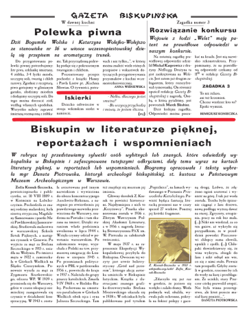W dawnej kuchni Zagadka numer 3 Polewka piwna Rozwiązanie konkursu Wojowie z łodzi „Welet” mają paDziś Bogumiła Wolska i Katarzyna Wołejko-Wołejszo tent na prawidłowe odpowiedzi w ze stanowiska nr 16 w wiosce wczesnopiastowskiej dzie- naszym konkursie. lą się przepisem na aromatyczny trunek. Na ostatnią zagadkę pra- kać na kraalu. Jest nią nazwiDo przygotowania polewki piwnej potrzebujemy: litr piwa, szklankę śmietany, 4 żółtka, 3-4 łyżki miodu, szczyptę soli, twaróg i chleb razowy. Zgodnie z recepturą, piwo gotujemy w glinianym garnku, słodzimy miodem i dodajemy szczyptę soli. Do tego można dorzucić ziół, według własnych upodobań. Wszystko należy zaprawić śmietaną rozmąconą z żółtka- widłowej odpowiedzi udzielił Michał Kasprowicz z drużyny Nidhogg. Drużyna ta jest zaokrętowana na Welecie. Jest zatem już drugim załogantem, który rozszyfroANNA WIŚNIEWSKA wał rymowankę. On również opuścił redakcję Gazety Bi- Nelko, dlaczego jesteś skupińskiej z nagrodą. OsoIskierki bą, o którą pytaliśmy, jest smutna? Dziecko odtwórców w - Bo wszyscy przychodzą powroźnik Marek Skubisz. stroju wikińskim siedzi w i mówią, że jestem śliczna. Dziś kolejna zagadka. namiocie. (mj) Odpowiedzi można poszu- mi. Tak przyrządzoną polewkę podaje się z pokruszonym twarogiem i chlebem. Prezentowany przepis pochodzi z książki Hanny i Pawła Lisów pt. „Kuchnia Słowian. O żywności, potra- wach i nie tylko...”, w której można znaleźć wiele różnych przepisów i wskazówek dotyczących przygotowywania przysmaków z kuchni wczesnośredniowiecznej. sko rekonstruktora. Przypominamy, że na prawidłową odpowiedź czekamy od 1100 w redakcji Gazety Biskupińskiej. ZAGADKA 3 To nie żelazo, ani też krzemień. Chcesz wiedzieć kto to? Epoki wymień. REMIGIUSZ KONIECZKA Biskupin w literaturze pięknej, reportażach i wspomnieniach W rubryce tej przedstawiamy sylwetki osób wybitnych lub znanych, które odwiedziły wykopaliska w Biskupinie i zafascynowane tutejszymi odkryciami, dały temu wyraz na kartach literatury pięknej, w reportażach lub wspomnieniach. Biogramy opracowała i teksty wybrała mgr Danuta Piotrowska, historyk archeologii biskupińskiej, st. kustosz w Państwowym Muzeum Archeologicznym w Warszawie. Zofia Kossak-Szczucka, powieściopisarka i publicystka, ur. 10 VIII 1889 r. w Kośminie na Lubelszczyźnie. Pochodziła ze znanej rodziny malarskiej, była siostrą stryjeczną Magdaleny Samozwaniec i poetki Marii Pawlikowskiej-Jasnorzewskiej. Studiowała malarstwo w warszawskiej Szkole Sztuk Pięknych, a następnie rysunek w Genewie. Po wyjściu za mąż za Stefana Szczuckiego w 1915 r. osiadła na Wołyniu. Po śmierci męża w 1922 r. zamieszkała w Górkach Wielkich na Śląsku Cieszyńskim. Ponownie wyszła za mąż za Zygmunta Szatkowskiego, oficera WP. W 1939 r. przeniosła się do Warszawy, gdzie w czasie okupacji niemieckiej zaangażowała się czynnie w działalność konspiracyjną. W 1943 r. zosta- ła aresztowana pod innym nazwiskiem i wywieziona do obozu koncentracyjnego Auschwitz-Birkenau, a następnie po stwierdzeniu jej prawdziwego nazwiska przewieziona do Warszawy, osadzona na Pawiaku i tam skazana na śmierć. Dzięki staraniom władz podziemia uwolniona w lipcu 1944 r. Wzięła czynny udział w powstaniu warszawskim. Po zakończeniu wojny, wyjechała z Polski na tzw. przymusową emigrację do Londynu w sierpniu 1945 r. Po przemianach politycznych w PRL w październiku 1956 r., powróciła do kraju w 1957 r. Należała do grupy pisarzy katolickich. Zmarła 9 IV 1968 r. w Bielsku-Białej. Pochowana na cmentarzu parafialnym w Górkach Wielkich obok ojca i syna Juliusza Szczuckiego. Tam też znajduje się muzeum jej imienia. Główny dorobek Z. Kossak to powieści historyczne. Najsłynniejsza z nich to „Krzyżowcy”. Pisarka uhonorowana została w 1936 r. Złotym Wawrzynem Polskiej Akademii Literatury, a w 1956 r. nagrodą literacką Stowarzyszenia PAX im. W. Pietrzaka za całokształt twórczości. W maju 1937 r. na zaproszenie Ekspedycji Wykopaliskowej przybyła do Biskupina. Owocem tej wizyty jest utwór beletrystyczny „Gród nad jeziorem”, którego akcję autorka umieściła w Biskupinie łużyckim. Książka z ilustracjami znanego grafika-drzeworytnika Stefana Mrożewskiego ukazała się w 1938 r. W odcinkach była publikowana pod tytułem „Popielnice”, na łamach wydawanego w Poznaniu Przewodnika Katolickiego. Powieść będąca fantazją literacką przenosi nas w czasy sprzed 27 wieków. Poniżej jej krótki fragment. Z. Kossak-Szczucka w 1933 r. wikipedia.org./wiki/ Zofia_Kossak-Szczucka „Zdarzyło się już raz w grodzie, że jezioro się wzdęło i zalało domy. Woda podmyła wał, obaliła, wyrwała pale ochronne, pokryła na łokieć polepy i gaco- ną drogę. Ledwo, że zdążono ogień uratować i wynieść na górę. I tak już woda została. Trzeba było śpiesznie ciągnąć z lasu drzewo, nową podłogę wyższą dawać na starej. Zgryzoty, utrapienia, pracy na rok bez mała. (...) Nikt nie wiedział, za co ten gniew, aż wykryło się przypadkiem, że w przeddzień powodzi Piszczorowi chłopcy suma złowili, upiekli i zjedli. (...) Chłopaki dowiedziawszy się, że wina wykryta, zbiegli do lasu i nikt odtąd nie wie, co się z nimi stało. Pewnie tam przepadli. Gdyby zostali w grodzie, rzucono by ich do wody na karę i przebłaganie. Że uciekli, stary Piszczor córkę pozwolił utopić. Nie była winna przestępstwu, ale ktoś przecie musiał karę ponieść...”. DANUTA PIOTROWSKA