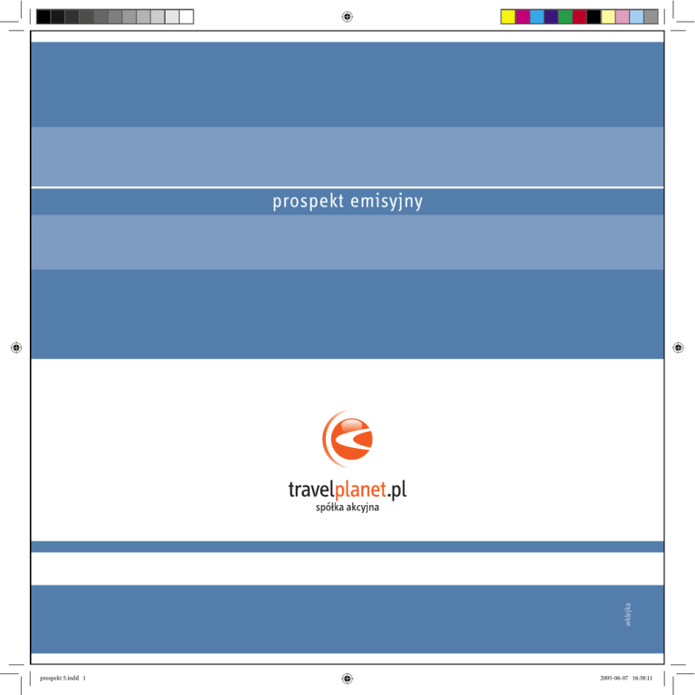 wklejka prospekt emisyjny prospekt 5.indd 1 2005-06-07 16:38:11 PROSPEKT EMISYJNY AKCJI Travelplanet.pl S.A., z siedzibą we Wrocławiu www.travelplanet.pl Podmiotem dominującym wobec Emitenta jest MCI Management S.A. Wprowadza się do publicznego obrotu: 500.000 akcji zwykłych na okaziciela serii A, o wartości nominalnej 1 zł każda; 1.218.100 akcji zwykłych na okaziciela serii B, o wartości nominalnej 1 zł każda; 57.270 akcji zwykłych na okaziciela serii C, o wartości nominalnej 1 zł każda; nie mniej niż 154.320 i nie więcej niż 370.370 akcji zwykłych na okaziciela serii D, o wartości nominalnej 1 zł każda. Oferuje się w publicznym obrocie: 370.370 akcji zwykłych na okaziciela serii D, o wartości nominalnej 1 zł każda. Dopuszczenie do publicznego obrotu Akcji serii D będzie równoznaczne z dopuszczeniem do publicznego obrotu praw do tych Akcji. Planuje się wprowadzić do obrotu giełdowego 370.370 Praw do Akcji serii D. Akcje serii D (w zł) – przy objętych 370.370 akcji Cena emisyjna* Prowizje subemitentów i inne koszty** Rzeczywiste wpływy Emitenta Na jednostkę - 1,78 - Razem akcje serii D - 660.000,00 - *Ostateczna cena emisyjna zostanie ustalona i podana do publicznej wiadomości przed rozpoczęciem Subskrypcji w trybie określonym w art. 81 ust.1 Ustawy. **Wskazana wartość ma charakter szacunkowy. Ostateczne koszty zostaną przekazane do publicznej wiadomości po zakończeniu Subskrypcji w trybie art. 81 ust. 1 Ustawy. Osobami uprawnionymi do składania zapisów są wszyscy zainteresowani Inwestorzy. Przyjmowane będą zapisy na ilość Akcji Oferowanych. Zapisy na większą liczbę Akcji Oferowanych niż dostępna będą uważane za zapisy na maksymalna liczbę Oferowanych Akcji i będą podlegać redukcji zgodnie z zasadami opisanymi w rozdziale III Prospektu. W momencie składania zapisu na Akcje serii D, Inwestor lub jego pełnomocnik może złożyć nieodwołalną dyspozycję deponowania Akcji serii D, która umożliwia zapisanie na jego rachunku papierów wartościowych wszystkich Akcji serii D, które zostały mu przydzielone. Inwestorzy są uprawnieni do objęcia Akcji serii D za pośrednictwem pełnomocnika. Przydział Akcji nastąpi w oparciu o przyjęte zapisy. Jeżeli łączna liczba oferowanych Akcji, na jakie Inwestorzy złożą zapisy, będzie większa od liczby Oferowanych Akcji, zapisy Inwestorów będą podlegać redukcji. Redukcja będzie proporcjonalna dla wszystkich subskrybentów, z zastrzeżeniem podanych niżej preferencji dla uczestników „Book – building’u”. Warunkiem skorzystania z preferencji przez Inwestorów jest złożenie deklaracji w procesie „Book - building’u” na liczbę oferowanych Akcji nie mniejszą niż 10 sztuk, po cenie, która się okaże wyższa lub równa ostatecznej cenie emisyjnej. Następnie, w ramach subskrypcji należy złożyć zapis na liczbę Akcji równą, co najmniej liczbie zadeklarowanej. Preferencje będą polegać na dwukrotnie większej alokacji zapisów na Akcje, w stosunku do Inwestorów nie objętych preferencjami. Preferencja dotyczy tylko tej liczby akcji, którą zadeklarowano w procesie „Book-building’u” na wskazanych powyżej warunkach. W przypadku przeprowadzania Book-building’u, informacja na temat przedziału cenowego w ramach którego będzie się mieściła cena nabycia wskazana w Deklaracjach Nabycia składanych przez Inwestorów, zostanie przekazana do publicznej informacji przed terminem rozpoczęcia „Book-building’u”, w trybie art. 81 ust. 1 Ustawy. Przeprowadzenie Subskrypcji nie nastąpi w trybie wykonania umowy o subemisję usługową. Nie planuje się zawierania umowy o subemisję inwestycyjną. Przed rozpoczęciem Publicznej Subskrypcji przeprowadzone zostaną działania marketingowe zwane procesem budowania księgi popytu – „Book – building”. Deklaracje Nabycia będą zbierane od 22 czerwca 2005 r. do 23 czerwca 2005 r. do godziny 14.00, za pośrednictwem POK Oferującego, których lista jest przedstawiona w rozdziale pt. „Załączniki” niniejszego Prospektu. prospekt 5.indd 3 okładka Dniem otwarcia Publicznej Subskrypcji jest 27 czerwca 2005 r. Zapisy na Akcje Oferowane będą przyjmowane od 27 czerwca 2005 r. do 30 czerwca 2005 r. Dniem zamknięcia Publicznej Subskrypcji jest 1 lipca 2005 r. Przydział Akcji zostanie dokonany przez Zarząd Emitenta do 7 dni roboczych po dniu zamknięcia Publicznej Subskrypcji. Zarząd zastrzega sobie prawo do zmiany podanych wyżej terminów. W wypadku zmiany terminu, stosowna informacja zostanie podana do publicznej wiadomości, przed upływem danego terminu, w sposób opisany w art. 81 ust. 1 Ustawy. 2005-06-07 16:38:15 Emitent nie wyklucza możliwości powołania w drodze odpowiedniej umowy konsorcjum dystrybucyjnego, w celu przeprowadzenia Publicznej Subskrypcji. W przypadku powołania konsorcjum dystrybucyjnego stosowna informacja zostanie przekazana w trybie art. 81 ust. 1 Ustawy przed rozpoczęciem Subskrypcji. Emitent może podjąć decyzję, iż nie będzie przeprowadzał procesu „Book – building’u”. W takim wypadku, informacja zostanie podana do publicznej wiadomości przed terminem planowanego rozpoczęcia „Book – building’u”, w trybie określonym w art. 81 ust. 1 Ustawy. W związku z Publiczną Subskrypcją będzie realizowany Program Lojalnościowy, o którym mowa w Załączniku nr IV. Akcje Emitenta nie były do tej pory przedmiotem obrotu na rynku urzędowym. Zarząd Emitenta zamierza, niezwłocznie po spełnieniu przez Emitenta wszystkich wymaganych przepisami warunków wystąpić o dopuszczenie Akcji serii A, B, C i D do obrotu giełdowego. Zamiarem Emitenta jest aby akcje serii A, B, C i D były przedmiotem obrotu na rynku urzędowym na przełomie II i III kwartału 2005 r. Zamiarem Emitenta jest aby do tego czasu był możliwy obrót prawami do Akcji serii D. Emitent planuje pierwsze notowanie PDA niezwłocznie, po podjęciu przez KDPW uchwały dotyczącej 