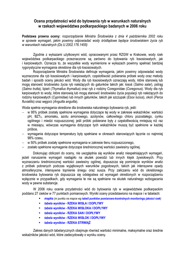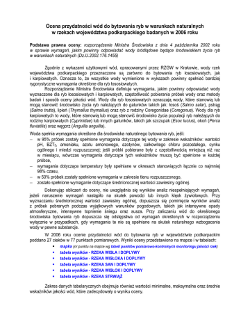 Ocena przydatności wód do bytowania ryb w warunkach naturalnych w rzekach województwa podkarpackiego badanych w 2006 roku Podstawa prawna oceny: rozporządzenie Ministra Środowiska z dnia 4 października 2002 roku w sprawie wymagań, jakim powinny odpowiadać wody śródlądowe będące środowiskiem życia ryb w warunkach naturalnych (Dz.U.2002.176.1455) Zgodnie z wykazami użytkowymi wód, opracowanymi przez RZGW w Krakowie, wody rzek województwa podkarpackiego przeznaczone są zarówno do bytowania ryb łososiowatych, jak i karpiowatych. Oznacza to, że wszystkie wody wymienione w wykazach powinny spełniać bardziej rygorystyczne wymagania określone dla ryb łososiowatych. Rozporządzenie Ministra Środowiska definiuje wymagania, jakim powinny odpowiadać wody wyznaczone dla ryb łososiowatych i karpiowatych, częstotliwość pobierania próbek wody oraz metody badań i sposób oceny jakości wód. Wody dla ryb łososiowatych oznaczają wody, które stanowią lub mogą stanowić środowisko życia ryb należących do gatunków takich jak: łosoś (Salmo salar), pstrąg (Salmo trutta), lipień (Thymallus thymallus) oraz ryb z rodziny Coregonidae (Coregonus). Wody dla ryb karpiowatych to wody, które stanowią lub mogą stanowić środowisko życia populacji ryb należących do rodziny karpiowatych (Cyprinidae) lub innych gatunków, takich jak szczupak (Esox lucius), okoń (Perca fluviatilis) oraz węgorz (Anguilla anguilla). Woda spełnia wymagania określone dla środowiska naturalnego bytowania ryb, jeśli: − w 95% próbek zostały spełnione wymagania dotyczące tej wody w zakresie wskaźników: wartości pH, BZT5, amoniaku, azotu amonowego, azotynów, całkowitego chloru pozostałego, cynku ogólnego i miedzi rozpuszczonej; jeśli próbki pobierane były z częstotliwością mniejszą niż raz w miesiącu, wówczas wymagania dotyczące tych wskaźników muszą być spełnione w każdej próbce, − wymagania dotyczące temperatury były spełniane w okresach stanowiących łącznie co najmniej 98% czasu, − w 50% próbek zostały spełnione wymagania w zakresie tlenu rozpuszczonego, − zostało spełnione wymaganie dotyczące średniorocznej wartości zawiesiny ogólnej. Dokonując obliczeń do oceny, nie uwzględnia się wyników analiz niespełniających wymagań, jeżeli naruszenie wymagań nastąpiło na skutek powodzi lub innych klęsk żywiołowych. Przy wyznaczaniu średniorocznej wartości zawiesiny ogólnej, dopuszcza się pominięcie wyników analiz z próbek pobranych podczas wyjątkowych warunków pogodowych, takich jak intensywne opady atmosferyczne, intensywne topnienie śniegu oraz susza. Przy zaliczaniu wód do określonego środowiska bytowania ryb dopuszcza się odstępstwa od wymagań określonych w rozporządzeniu wyłącznie w przypadkach, gdy wymagania te nie są spełniane na skutek naturalnego wzbogacania wody w pewne substancje. W 2006 roku ocenie przydatności wód do bytowania ryb w województwie podkarpackim poddano 27 cieków w 77 punktach pomiarowych. Wyniki oceny przedstawiono na mapce i w tabelach: mapka (nr punktu na mapce wg tabeli punktów pomiarowo-kontrolnych monitoringu jakości rzek) tabela wyników - RZEKA WISŁA I DOPŁYWY tabela wyników - RZEKA WISŁOKA I DOPŁYWY tabela wyników - RZEKA SAN I DOPŁYWY tabela wyników - RZEKA WISŁOK I DOPŁYWY tabela wyników - RZEKA STRWIĄŻ Zakres danych tabelarycznych obejmuje również wartości minimalne, maksymalne oraz średnie wskaźników jakości wód, które zadecydowały o wyniku oceny. Na podstawie badań stwierdzono, że w punkcie pomiarowym Rajskie, położonym na rzece San na dopływie do zbiornika zaporowego Solina, spełnione były wymagania jakości określone dla ryb łososiowatych i karpiowatych. W 7 punktach (9,1% łącznej ilości punktów pomiarowych) wody oceniono jako przydatne dla bytowania ryb karpiowatych. Punkty te rozmieszczone są górnych biegach: Wisłoki (2 punkty), Sanu (2 punkty) i Wisłoka (1 punkt) oraz w dolnych biegach Solinki i Osławy (zlewnia Sanu). W pozostałych punktach pomiarowych, stanowiących 89,6% ogółu punktów sieci monitoringowej, woda nie spełniała kryteriów określonych w rozporządzeniu. Wskaźnikami degradującym wody najczęściej były: azotyny (97,3% punktów pomiarowych), fosfor ogólny (71,1% punktów pomiarowych), azot amonowy (40,8% punktów pomiarowych), niejonowy amoniak (26,3% punktów pomiarowych), BZT5 (17,1% punktów pomiarowych), tlen rozpuszczony (10,5% punktów pomiarowych).