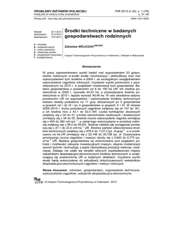 PROBLEMY INŻYNIERII ROLNICZEJ PIR 2013 (I–III): z. 1 (79) s. 31–40 PROBLEMS OF AGRICULTURAL ENGINEERING Wersja pdf: www.itep.edu.pl/wydawnictwo Wpłynęło Zrecenzowano Zaakceptowano 28.11.2012 r. 18.12.2012 r. 10.01.2013 r. A – koncepcja B – zestawienie danych C – analizy statystyczne D – interpretacja wyników E – przygotowanie maszynopisu F – przegląd literatury ISSN 1231-0093 Środki techniczne w badanych gospodarstwach rodzinnych Zdzisław WÓJCICKI ABCDEF Instytut Technologiczno-Przyrodniczy w Falentach, Oddział w Warszawie Streszczenie W pracy zaprezentowano wyniki badań nad wyposażeniem 53 gospodarstw rodzinnych w środki trwałe mechanizacji i elektryfikacji oraz nad wykorzystaniem tych środków w 2009 r. ze szczególnym uwzględnieniem wykorzystania ciągników rolniczych. Uzyskane wyniki porównano z przewidywanymi na 2015 r. w projektach modernizacji tych gospodarstw. Badano gospodarstwa o powierzchni od 8 do 150 ha UR. Ich średnia powierzchnia w 2009 r. wynosiła 44,23 ha, a przewidywana średnia powierzchnia w 2015 r. będzie wynosić 49,49 ha. W celu określania wpływu powierzchni UR na wyposażenie i wykorzystanie środków technicznych badane obiekty podzielono na 11 grup obszarowych po 5 gospodarstw w grupach od I do IX i po 4 gospodarstwa w grupach X i XI. W okresie 2009–2015 r. liczba posiadanych ciągników zwiększy się ze 157 do 161, a ich średnia moc z 43,1 do 52,5 kW. Liczba kombajnów zbożowych zwiększy się z 34 do 37, a liczba samochodów osobowych i dostawczych zmniejszy się z 59 do 55. Średnie roczne wykorzystanie ciągnika zmniejszy się z 405 do 382 cnh·szt.–1, a udział tego wykorzystania w produkcji roślinnej zwiększy się z 56,5 do 59,9%. Średnie nakłady siły pociągowej zmniejszą się z 27,1 do 23,4 cnh·ha–1 UR. Średnia wartość odtworzeniowa środków technicznych zwiększy się z 979,4 do 1127,3 tys. zł·gosp–1, a w przeliczeniu na ha UR zmniejszy się z 22,146 do 20,758 tys. zł. Oszacowana amortyzacja roczna ciągników i maszyn obniży się z 0,840 do 0,773 tys. zł·ha–1 UR. Badane gospodarstwa są zróżnicowane pod względem potrzeb i możliwości zakupów inwestycyjnych maszyn, stopnia modernizacji swoich technik i technologii, a także intensyfikacji produkcji roślinnej i zwierzęcej. Dlatego nie udało się określić istotnych współzależności między wskaźnikami eksploatacyjno-ekonomicznymi środków technicznych a zwiększającą się powierzchnią UR w badanych obiektach. Uzyskane wyniki analiz będą wykorzystane do aktualizacji dotychczasowych wskaźników eksploatacyjno-ekonomicznych ciągników i maszyn rolniczych. Słowa kluczowe: rolnictwo, gospodarstwo, wyposażenie techniczne, wykorzystanie ciągników, wskaźniki eksploatacyjno-ekonomiczne © Instytut Technologiczno-Przyrodniczy w Falentach, 2013 Zdzisław Wójcicki Wstęp Dobór maszyn i ich racjonalna eksploatacja w różnych grupach przedsiębiorstw rolniczych jest głównym tematem badań organizacji i ekonomiki gospodarstw rolnych w dyscyplinie inżynieria rolnicza [SZEPTYCKI, WÓJCICKI 2003]. Badania terenowe i ankietowe placówek naukowych oraz badania statystyczne [GUS 2011] są źródłem danych do określania poziomu wyposażenia w środki techniczne i stopnia ich wykorzystania w odpowiednich obiektach produkcji i usług rolniczych. Jednym z takich źródeł jest baza danych uzyskanych w trakcie realizacji projektu badawczo-rozwojowego NCBiR nr NR 120043 pt. „Technologiczna i ekologiczna modernizacja wybranych gospodarstw rodzinnych [WÓJCICKI, KUREK 2012]. Celem niniejszego opracowania jest analiza dotychczasowego (2009 r.) i planowanego (2015 r.) wyposażenia w środki techniczne oraz wykorzystania tych środków w 53 wybranych gospodarstwach rodzinnych. Wyniki tych analiz będą podstawą aktualizacji dotychczasowych parametrów eksploatacyjno-ekonomicznych ciągników i maszyn rolniczych [MUZALEWSKI 2010] i wprowadzeniu nowych. Mogą być też wykorzystane w nowelizacji metod doboru zestawów maszyn i modernizacji przedsiębiorstw rolniczych [MUZALEWSKI 2008; WÓJCICKI 2012]. Metody i przebieg badań Projekt badawczo-rozwojowy był realizowany w latach 2009–2012 przez specjalistów Instytutu Technologiczno-Przyrodniczego (ITP) w Warszawie, Poznaniu, Gdańsku i Tyliczu (26 gospodarstw) oraz przez specjalistów z uczelni rolniczych w Lublinie (9 gospodarstw), Krakowie (8 gospodarstw), Poznaniu (7 gospodarstw) i Siedlcach (3 gospodarstwa). Badania w 53 wybranych gospodarstwach rodzinnych prowadzone były według jednolitej wspólnie ustalonej metodyki [WÓJCICKI i in. 2009]. Do analiz porównawczych wyposażenia badanych gospodarstw w środki trwałe mechanizacji i elektryfikacji posłużyło sprawozdanie z badań wybranych obiektów w 2009 r. [WÓJCICKI, KUREK 2011] oraz sprawozdanie zbiorcze projektów modernizacji badanych gospodarstw do 2015 r. [WÓJCICKI 2010; WÓJCICKI, KUREK 2012]. Projekty modernizacji wybranych gospodarstw opracowywali pracownicy naukowi z aktywnym udziałem właścicieli tych gospodarstw. Badano wyposażenie i wykorzystanie środków technicznych w gospodarstwach o powierzchni od 8 do 150 ha UR podzielonych na 11 grup obszarowych po 5 gospodarstw w grupach od I do IX i po 4 gospodarstwa w grupach X i XI (tab. 1). Gospodarstwa grupowano według rosnącej powierzchni posiadanych w 2009 r. użytków rolnych (UR), zachowując taki sam podział na grupy na 2015 r., 32 © ITP w Falentach; PIR 2013 (I–III): z. 1 (79) Środki techniczne w badanych gospodarstwach rodzinnych Tabela 1. Powierzchnia użytków rolnych (UR) w badanych gospodarstwach rodzinnych Table 1. Acreage of agricultural land (AL) in the family farms under study Grupa obszarowa – liczba gospodarstw Acreage groups – number of farms I–5 II – 5 III – 5 IV – 5 V–5 VI – 5 VII – 5 VIII – 5 IX – 5 X–4 XI – 4 Razem 53 Total 53 razem total 65,35 94,77 117,13 129,58 153,29 171,11 219,62 268,84 322,02 316,06