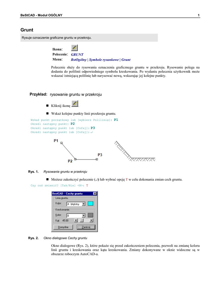 BeStCAD - Moduł OGÓLNY 1 Grunt Rysuje oznaczenie graficzne gruntu w przekroju. Ikona: Polecenie: GRUNT Menu: BstOgólny | Symbole rysunkowe | Grunt Polecenie służy do rysowania oznaczenia graficznego gruntu w przekroju. Rysowanie polega na dodaniu do polilinii odpowiedniego symbolu kreskowania. Po wydaniu polecenia użytkownik może wskazać istniejącą polilinię lub narysować nową, wskazując jej kolejne punkty. Przykład: rysowanie gruntu w przekroju n Kliknij ikonę . n Wskaż kolejne punkty linii przekroju gruntu. Wskaż punkt początkowy lub [wybierz Polilinię]: Określ następny punkt: P2 Określ następny punkt lub [Cofaj]: P3 Określ następny punkt lub [Cofaj]: ↵ Rys. 1. P1 Rysowanie gruntu w przekroju n Możesz zakończyć polecenie (↵) lub wybrać opcję T w celu dokonania zmian cech gruntu. Czy coś zmienić? [Tak/Nie] <N>: T Rys. 2. Okno dialogowe Cechy gruntu Okno dialogowe (Rys. 2), które pokaże się przed zakończeniem polecenia, pozwoli na zmianę koloru linii gruntu i kreskowania oraz kąta kreskowania. Zmiany dokonywane w oknie widoczne są w obszarze roboczym AutoCAD-a.