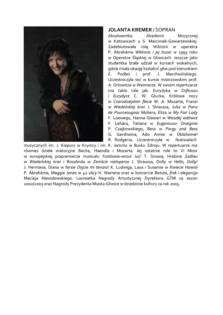 JOLANTA KREMER / SOPRAN Absolwentka Akademii Muzycznej w Katowicach u S. Marciniak-Gowarzewskiej. Zadebiutowała rolą Wiktorii w operetce P. Ábraháma Wiktoria i jej huzar w 1993 roku w Operetce Śląskiej w Gliwicach. Jeszcze jako studentka brała udział w kursach wokalnych, gdzie miała okazję kształcić głos pod kierunkiem E. Podleś i prof. J. Marchwińskiego. Uczestniczyła też w kursie mistrzowskim prof. A. Orlowitza w Weimarze. W swoim repertuarze ma takie role jak: Eurydyka w Orfeuszu i Eurydyce C. W. Glucka, Królowa nocy w Czarodziejskim flecie W. A. Mozarta, Franzi w Wiedeńskiej krwi J. Straussa, Julia w Panu de Pourceaugnac Moliera, Eliza w My Fair Lady F. Loewego, Hanna Glawari w Wesołej wdówce F. Lehára, Tatiana w Eugeniuszu Onieginie P. Czajkowskiego, Bess w Porgy and Bess G. Gershwina, Ado Annie w Oklahomie! R. Rodgersa. Uczestniczyła w festiwalach muzycznych im. J. Kiepury w Krynicy i im. K. Jamróz w Busku Zdroju. W repertuarze ma również dzieła oratoryjne Bacha, Haendla i Mozarta. Jej ostatnie role to Vi Moor w europejskiej prapremierze musicalu Footloose-wrzuć luz! T. Snowa, Hrabina Zedlau w Wiedeńskiej krwi i Rozalinda w Zemście nietoperza J. Straussa, Dolly w Hello, Dolly! J. Hermana, Diana w farsie Dajcie mi tenora! K. Ludwiga, Laya i Susanne w Kwiecie Hawaii P. Ábraháma, Maggie Jones w 42 ulicy H. Warrena oraz w koncercie Batuta, frak i elegancja Macieja Niesiołowskiego. Laureatka Nagrody Artystycznej Dyrektora GTM za sezon 2002/2003 oraz Nagrody Prezydenta Miasta Gliwice w dziedzinie kultury za rok 2003.