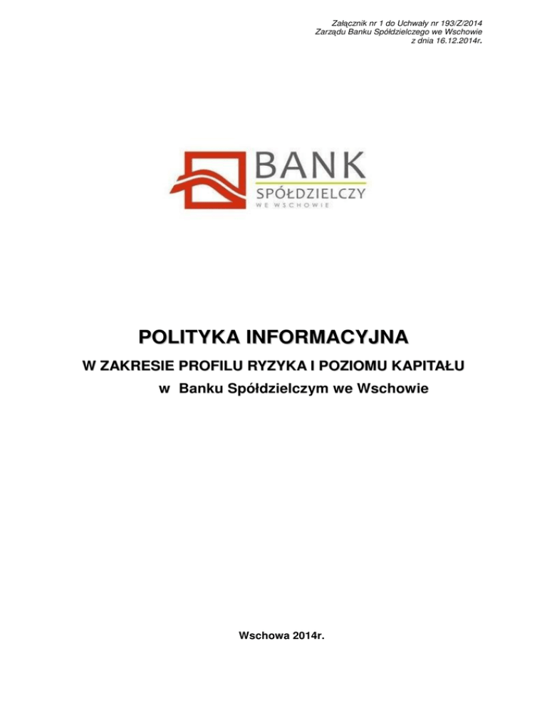 Załącznik nr 1 do Uchwały nr 193/Z/2014 Zarządu Banku Spółdzielczego we Wschowie z dnia 16.12.2014r. POLITYKA INFORMACYJNA W ZAKRESIE PROFILU RYZYKA I POZIOMU KAPITAŁU w Banku Spółdzielczym we Wschowie Wschowa 2014r. SPIS TREŚCI Rozdział 1 Przepisy ogólne 2 Zakres podmiotowy 2 Zadania organów Banku w zakresie polityki informacyjnej Ogłaszanie informacji o charakterze jakościowym i ilościowym Zakres ogłaszanych informacji 3 3 Częstotliwość, forma i miejsca ogłaszania informacji 4 Rozdział 3 Zasady weryfikacji ogłaszanych informacji 4 Rozdział 4 Weryfikacja Polityki Informacyjnej 5 Rozdział 2 1 3 Rozdział 1 Przepisy ogólne Przedmiotem niniejszej Polityki Informacyjnej jest proces ogłaszania przez Bank informacji wynikających z postanowień Uchwały, Rekomendacji oraz Pakietu CRD IV/CRR. Celem niniejszej Polityki Informacyjnej jest ustalenie szczegółowych reguł dotyczących: zakresu, częstotliwości, miejsc oraz formy ogłaszanych przez Bank informacji w celu realizacji polityki informacyjnej Banku poprzez udostępnianie osobom zewnętrznym, w szczególności klientom Banku oraz uczestnikom rynków finansowych, aktualnej i wiarygodnej informacji na temat Banku, umożliwiającej pełną ocenę jego stabilności finansowej, jak również wypełnienia postanowień prawnych wynikających regulacji zewnętrznych. §1 Ilekroć w treści niniejszej „Polityki informacyjnej w zakresie profilu ryzyka i poziomu kapitału w Banku Spółdzielczym we Wschowie” użyte są poniższe pojęcia, oznaczają one: 1) Bank – Bank Spółdzielczy we Wschowie, 2) Rada Nadzorcza – Rada Nadzorcza Banku Spółdzielczego we Wschowie, 3) Uchwała – uchwała Komisji Nadzoru Finansowego dotycząca szczegółowych zasad i sposobu ogłaszania przez banki informacji o charakterze jakościowym i ilościowym dotyczących adekwatności kapitałowej oraz zakresu informacji podlegających ogłaszaniu, 4) Rekomendacja – Rekomendacja operacyjnym w bankach, 5) placówki Banku we Wschowie, – Oddziały, M Punkty dotycząca kasowe zarządzania Banku ryzykiem Spółdzielczego 6) komórki organizacyjne – Wydziały, Działy, Zespoły znajdujące się w strukturze organizacyjnej Centrali Banku 7) Polityka Informacyjna – niniejsza regulacja „Polityka informacyjna w zakresie profilu ryzyka i poziomu kapitału w Banku Spółdzielczym we Wschowie” 8) Pakiet CRD IV/CRR- dyrektywa CRD IV (Dyrektywa Parlamentu Europejskiego i Rady 2013/36/UE z dnia 26 czerwca 2013r. w sprawie warunków dopuszczenia instytucji kredytowych do działalności oraz nadzoru ostrożnościowego nad instytucjami kredytowymi i firmami inwestycyjnymi) oraz rozporządzenie CRR (Rozporządzenie Parlamentu Europejskiego i Rady(UE) nr 575/2013 z dnia 26 czerwca 2013r. w sprawie wymogów ostrożnościowych dla instytucji kredytowych i firm inwestycyjnych). Zakres podmiotowy §2 1. Zasady określone w Polityce Informacyjnej mają zastosowanie do wszelkich czynności związanych z procesem ogłaszania przez Bank informacji wynikających z regulacji zewnętrznych. 2. Informacje do ujawnienia sporządza Zespół Ryzyk Bankowych i Analiz przy współpracy innych komórek organizacyjnych Banku. Zadania poszczególnych komórek opisane są w „Zasadach sporządzania informacji podlegających ogłaszaniu w Banku Spółdzielczym we Wschowie”. 2 3. Każdy pracownik, który zauważy sytuacje odbiegające bądź sprzeczne z przepisami niniejszej Polityki Informacyjnej, zobowiązany jest zgłosić to swojemu przełożonemu. Zadania organów Banku w zakresie polityki informacyjnej §3 1. Rada Nadzorcza Informacyjną. zatwierdza uchwaloną przez Zarząd Banku Politykę 2. Zarząd Banku: 1) odpowiada za kształtowanie zasad polityki informacyjnej, regulującej w szczególności: a) zakres ogłaszanych informacji, b) częstotliwość ogłaszania informacji, c) miejsca ogłaszania, d) zasady zatwierdzania i weryfikacji ogłaszanych informacji, e) zasady weryfikacji polityki informacyjnej, 2) zatwierdza każdorazowo informację do ogłoszenia. Rozdział 2 Ogłaszanie informacji o charakterze jakościowym i ilościowym Zakres ogłaszanych informacji §4 1. Zakres ogłaszanych informacji jest zgodny z wymogami regulacji zewnętrznych w obszarze mającym zastosowanie dla Banku. 2. Informacje w zakresie celów i zasad polityki zarządzania poszczególnymi rodzajami ryzyka obejmują: 1) strategie i procesy zarządzania poszczególnymi rodzajami ryzyka, 2) strukturę i organizację komórki monitorującej dane rodzaje ryzyka w Banku lub inne odpowiednie rozwiązania organizacyjne, 3) zakres i rodzaj systemów raportowania i pomiaru ryzyka, 4) zasady polityki stosowania zabezpieczeń i ograniczania ryzyka oraz strategie i procesy monitorowania skuteczności zabezpieczeń i metod ograniczania ryzyka, 3. Bank ogłasza informacje w zakresie: 1) norm ostrożnościowych, 2) funduszy własnych, 3) przestrzegania wymogów kapitałowych, 4) ryzyk: kredytowego, operacyjnego, stopy procentowej w portfelu bankowym, 5) polityki zmiennych składników wynagrodzeń osób zajmujących stanowiska kierownicze. 4. Szczegółowy zakres informacji podlegających ogłaszaniu zawierają „Zasady sporządzania informacji podlegających ogłaszaniu w Banku Spółdzielczym we Wschowie”. 5. Bank może, zgodnie z postanowieniami regulacji zewnętrznych, odstąpić od ogłaszania części informacji, jeżeli mają one charakter zastrzeżony, poufny lub nieistotny. 3 6. Przez informacje o charakterze zastrzeżonym Bank uznaje wszelkie informacje, których publiczne rozpowszechnienie osłabiłoby pozycję konkurencyjną Banku. 7. Przez informacje o charakterze poufnym Bank uznaje wszelkie informacje, co do których Bank zobowiązał się wobec klienta Banku lub innego kontrahenta do zachowania poufności. 8. Przez informacje o charakterze nieistotnym Bank uznaje wszelkie informacje, których pominięcie lub zniekształcenie nie może zmienić oceny wykorzystującej takie inf