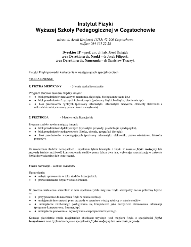 Instytut Fizyki Wy szej Szkoły Pedagogicznej w Cz stochowie adres: ul. Armii Krajowej 13/15; 42-200 Cz stochowa tel/fax: 034 361 22 28 Dyrektor IF – prof. zw. dr hab. Józef wi tek z-ca Dyrektora ds. Nauki – dr Jacek Filipecki z-ca Dyrektora ds. Nauczania – dr Stanisław Tkaczyk Instytut Fizyki prowadzi kształcenie w nast puj cych specjalno ciach: STUDIA DZIENNE 1) FIZYKA MEDYCYNY - 3-letnie studia licencjackie Program studiów zawiera mi dzy innymi: ♦ ♦ blok przedmiotów medycznych (anatomia, fizjologia, biologia medyczna itp.) ♦ ♦ blok przedmiotów fizycznych i chemicznych (podstawy fizyki, biofizyka, biochemia itp.) ♦ ♦ blok przedmiotów ogólnych (podstawy informatyki, informatyka medyczna, elementy elektroniki i mikroelektroniki, elementy prawa i teorii zarz dzania). 2) PRZYRODA - 3-letnie studia licencjackie Program studiów zawiera mi dzy innymi: ♦ ♦ blok przedmiotów dydaktycznych (dydaktyka przyrody, psychologia i pedagogika), ♦ ♦ blok przedmiotów podstawowych (fizyka, chemia, geografia i biologia), ♦ ♦ blok przedmiotów wspomagaj cych (podstawy informatyki, elektroniki, prawo o wiatowe, filozofia przyrody). Po uko czeniu studiów licencjackich i uzyskaniu tytułu licencjata z fizyki w zakresie fizyki medycyny lub przyrody istnieje mo liwo kontynuowania studiów przez dalsze dwa lata, wybieraj c specjalizacj w zakresie fizyki do wiadczalnej lub teoretycznej. Forma rekrutacji – konkurs wiadectw Uprawnienia: ♦ ♦ nabyte uprawnienia w toku studiów licencjackich, ♦ ♦ prawo nauczania fizyki w szkole redniej. W procesie kształcenia studentów w celu uzyskania tytułu magistra fizyki szczególny nacisk poło ony b dzie na: ♦ ♦ przygotowanie do nauczania fizyki w szkole redniej, ♦ ♦ umiej tno interpretacji praw przyrody w oparciu o wiedz zdobyt w trakcie studiów, ♦ ♦ umiej tno swobodnego posługiwania si komputerem jako narz dziem obrazowania informacji (programy komputerowe, Internet, itp.) ♦ ♦ umiej tno planowania i wykonywania eksperymentu fizycznego. Ko cz c pi cioletnie studia magisterskie absolwent uzyskuje tytuł magistra fizyki o specjalno ci fizyka komputerowa oraz dyplom licencjata o specjalno ci fizyka medycyny lub nauczanie przyrody. STUDIA PODYPLOMOWE 1) Fizyka z Informatyk Te studia podyplomowe przeznaczone s głównie dla nauczycieli - absolwentów kierunków cisłych wy szych uczelni pedagogicznych, technicznych i uniwersytetów. Celem ich jest nadanie nowych kwalifikacji, lub doskonalenie (w zale no ci od podstawowego kierunku wykształcenia) w zakresie w/w przedmiotów. Kadra Akademicka Katedra Fizyki Materiałów Organicznych Prof. dr hab. Józef wi tek - kierownik katedry, prof. zw. Prof. dr hab. Stefan Giller - prof. zw. Dr Anna Kwiatkowska - adiunkt Dr Henryk Kołodziej - st.wykładowca Dr Arkadiusz Mandowski - adiunkt Dr Stanisław Tkaczyk - adiunkt Mgr Ewa Mandowska - asystent Mgr Grzegorz Lach - asystent Pr. naukowo-techniczni Mgr Leszek Kokot Mgr in . Jerzy Kowalczyk Mgr Barbara Makowska Mgr Krzysztof Topoła Pr. in ynieryjno-techniczni Agnieszka Roch Piotr Sawicki Katedra Fizyki Ciała Stałego Dr hab. Janusz Berdowski - kierownik katedry, prof. WSP Dr hab. Ivan Kityk - prof. WSP Prof. dr hab. Michał Małachowski - prof. WSP Dr Ewa Berdowska - adiunkt Dr Małgorzata Makowska-Janusik - adiunkt Mgr Piotr Smok - asystent Mgr Izabela Fuks - asystent Mgr Anna Migalska-Zalas - asystent Pr.naukowo-techniczni Mgr Jarosław Krasowski Mgr Rafał Miedzi ski Zakład Dydaktyki Fizyki i Astronomii Dr hab. Marian Głowacki - kierownik zakładu, prof. WSP Dr Alina Domagała - adiunkt Dr Zygmunt Olesik - st.wykładowca Dr Bogdan Wszołek - adiunkt Mgr Jan Bieleninik - asystent Mgr Małgorzata Cie lak-Bieleninik - asystent Mgr Bogusław Kocik - asystent Pr.naukowo-techniczni In . Tadeusz Jasikowski Mgr Marek Orkisz Zakład Fizyki Teoretycznej Prof. dr hab. Bolesław Wysłocki - kierownik zakładu, prof. zw. Dr hab. Zygmunt B k - prof. WSP Dr hab. Jacek Kasperczyk - prof. WSP Dr Beata Białek - adiunkt Dr Piotr Br giel - adiunkt Dr Wojciech Gruhn - adiunkt Dr Michał Piasecki - adiunkt Zakład Fizyki rodowiska Dr hab. Zdzisław St pie - kierownik zakładu, prof. WSP Dr Jadwiga Olesik - adiunkt Dr Ewa Jakubczyk - adiunkt Dr Jacek W sik - adiunkt Mgr Agnieszka Tomaszewska - asystent Pr. naukowo-techniczni Mgr in . Ewa Banaszkiewicz Mgr in . Andrzej Kosmala Zakład Bada Strukturalnych Dr Jacek Filipecki - kierownik zakładu, adiunkt Prof. dr hab. Oleg Szpotiuk - prof. WSP Dr hab. Adam Dubik - prof. WSP Dr hab. Piotr Korzekwa - prof. WSP Dr Edmund Golis - adiunkt Mgr Małgorzata Hyla - asystent Pr. naukowo-techniczni Mgr in . Krystyna Dobrza ska Mgr Zygmunt Mandecki In . Aleksander Tarkowski Warsztat Elektroniczny Ryszard Prokop – kierownik pracowni Paweł Hanisz Grzegorz Skru d Sekretariat Teresa Klimek