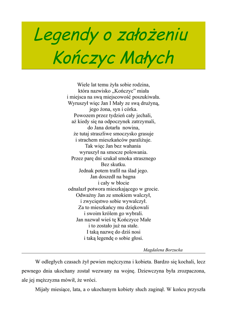 Legendy o założeniu Kończyc Małych Wiele lat temu żyła sobie rodzina, która nazwisko „Kończyc” miała i miejsca na swą miejscowość poszukiwała. Wyruszył więc Jan I Mały ze swą drużyną, jego żona, syn i córka. Powozem przez tydzień cały jechali, aż kiedy się na odpoczynek zatrzymali, do Jana dotarła nowina, że tutaj straszliwe smoczysko grasuje i strachem mieszkańców paraliżuje. Tak więc Jan bez wahania wyruszył na smocze polowania. Przez parę dni szukał smoka strasznego Bez skutku. Jednak potem trafił na ślad jego. Jan doszedł na bagna i cały w błocie odnalazł potwora mieszkającego w grocie. Odważny Jan ze smokiem walczył, i zwycięstwo sobie wywalczył. Za to mieszkańcy mu dziękowali i swoim królem go wybrali. Jan nazwał wieś tę Kończyce Małe i to zostało już na stałe. I taką nazwę do dziś nosi i taką legendę o sobie głosi. Magdalena Borzucka W odległych czasach żył pewien mężczyzna i kobieta. Bardzo się kochali, lecz pewnego dnia ukochany został wezwany na wojnę. Dziewczyna była zrozpaczona, ale jej mężczyzna mówił, że wróci. Mijały miesiące, lata, a o ukochanym kobiety słuch zaginął. W końcu przyszła wiadomość, że mężczyzna zginął w boju. Kobieta przysięgła, że już nigdy nie pokocha innego. Postanowiła wstąpić do klasztoru. Przed tym zdecydowała jednak obciąć swoje jasne włosy. Usiadła nad rzeką i płacząc ścinała białe loki i wrzucała je do wody. Z tych łez rzeka wylała na pobliskie łąki. Kiedy woda opadła, wśród trawy, ludzie zauważyli mnóstwo białych, pachnących kwiatków. To przyniesione przez wodę włosy dziewczyny zamieniły się w kwiaty koniczyny. Z czasem okazało się, że czterolistne koniczynki przynoszą szczęście, którego zabrakło tamtej kobiecie. Ludzie postanowili swoją osadę nazwać Kończyce Małe na cześć małego, niepozornego, ale szczęśliwego kwiatka. Marcelina Staniczek Żył sobie wieśniak o imieniu Mały. Był dobrym człowiekiem i nie bał się pracy. Ludzie go szanowali. Pewnego razu poszedł nad rzekę, przy której stała piękna dziewczyna o imieniu Kończanka. Przyglądała się rzecze. Kończanka była dobra i pracowita. Dbała o przyrodę. Mały zapragnął ożenić się z nią. Zdobył jej serce. Wzięli ślub. Wieśniacy uznali, że trzeba nazwać miejsce, w którym się osiedlili i wybrać przywódcę. Wybrali Małego i Kończankę, gdyż byli szlachetni i dobrzy. Kończanka i Mały, na pamiątkę tego zdarzenia, nazwali to miejsce Kończyce Małe, a rzekę, przy której się poznali, Piotrówką, gdyż ich syn miał na imię Piotr. Julia Walica W odległych czasach żył pewien król. Mieszkał w pięknym pałacu wraz z żoną Kończanką. Na świat miało przyjść dziecko pary królewskiej. Tak też się stało. Urodził się mały książę. Jego rodzice byli bardzo tym uradowani, nadali mu imię Kończyc. Cała rodzina wiodła spokojne życie. Gdy Kończyc skończył edukację i stał się dorosły, znalazł sobie piękną kandydatkę na żonę. Po paru miesiącach postanowili sie pobrać. Gdy wzięli ślub, po roku, urodziło im się dziecko. Był to chłopiec – mały książę. Kończyc i jego żona nazwali syna Kończyc II Mały. W wieku 14-15 lat książę otrzymał od swojego wspaniałego dziadka bardzo piękną ziemię. Uradowany Kończyc II Mały nazwał ją Kończycami Małymi. Daria Tomica