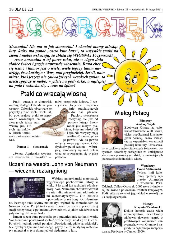 16 DLA DZIECI KURIER WILEŃSKI • Sobota, 22 — poniedziałek, 24 lutego 2014 r. Siemanko! Nie ma to jak słoneczko! I chociaż mamy miesiąc luty, który ma ponoć „ostro kute buty”, to wszystkie znaki na ziemi i niebie wskazują, że zbliża się WIOSNA! Przymrozki — rzecz normalna o tej porze roku, ale w ciągu dnia słońce świeci i grzeje naprawdę wiosennie. Rano chce się wstać i humor jest o wiele, wiele lepszy (mam nadzieję, że u każdego z Was, moi przyjaciele). Jeżeli, natomiast, ktoś jeszcze nie zauważył tych wesołych zmian, to niech spojrzy w niebo, wyjdzie na podwórko, a najlepiej na pole i wsłucha się… czas na śpiew! Ptaki co wracają wiosną Ptaki wracają z zimowisk według stałego kalendarza powrotów. Człowiek obserwuje te przyloty już od wielu, wielu lat, bo powracające ptaki to zapowiedź wiosennych zmian, cieszących także nas. Wiemy już, których gatunków w jakich terminach można się spodziewać. Numer 1 — skowronek „Święta Agnieszka wypuszcza skowronka z mieszka” — mówi przysłowie ludowe. I rzeczywiście, to jeden z najwcześniej przylatujących do nas ptaków. Przyloty skowronka zaczynają się już od połowy lutego. Skowronek jest małym ptakiem, żyjącym wśród pól i łąk. Nie wszyscy mają możliwość zauważyć jego powrót. Ale na pewno wszyscy znają jego śpiew, który słychać w pełni sezonu — wibrujący, wznoszący się nad polem wraz ze zrywającym się w górę ptakiem. Uczeni na wesoło: John von Neumann — wiecznie roztargniony Wybitny amerykański matematyk węgierskiego pochodzenia, który w wieku 8 lat znał już rachunek różniczkowy. Von Neumann charakteryzował się nie tylko niezwykłymi zdolnościami matematycznymi... Oto historie opowiadane przez żonę von Neumanna. Pewnego razu słynny matematyk wybrał się samochodem do Nowego Jorku. Po jakimś czasie dzwoni do żony z przydrożnej stacji benzynowej z pytaniem: „Powiedz mi, w jakim właściwie celu jadę do tego Nowego Jorku...”. Innym razem żona poprosiła go o przyniesienie szklanki wody. Von Neumann postanowił spełnić prośbę żony i udał się do kuchni. Po chwili jednak wrócił pytając: „Powiedz mi, gdzie są szklanki”. Nie byłoby w tym nic śmiesznego, gdyby nie to, że słynny matematyk mieszkał w tym domu już od siedemnastu lat... Wielcy Polacy Filmowcy Andrzej Wajda Zdobywca Oskara za całokształt twórczości w 2003 roku, ojciec współczesnej kinematografii polskiej, znany zwłaszcza ze wspaniałych ekranizacji polskiej literatury. Umieszczany w czołówce najwybitniejszych światowych reżyserów, doceniany szczególnie za umiejętność stworzenia poruszających dzieł, przemawiających jednocześnie do intelektu widza. Wynalazcy Ernest Malinowski Twórca linii kolejowej łączącej wybrzeże Atlantyku z wnętrzem Peru. Odcinek Callao-Oroya do 2005 roku był najwyżej na świecie położonym traktem kolejowym. Podkreśla się również jego wkład w rozwój nauk socjologicznych. Muzycy Krzysztof Penderecki Doktor honoris causa wielu uniwersytetów, wielokrotny zdobywca głównych nagród w prestiżowych konkursach muzycznych, w tym Grammy i nagrody na najlepszego kompozytora na Festiwalu w Cannes (2000). DLA DZIECI 17 KURIER WILEŃSKI • Sobota, 22 — poniedziałek, 24 lutego 2014 r. Pokoloruj Znajdź wyjście z labiryntu Wynalazki: Walkman W 1979 roku Sony wprowadził na rynek pierwszego walkmana. Na początku było mono. Pierwszy model, oznaczony symbolem TPS-L2, ważył „tylko” 390 gramów. Dziś nawet domorośli elektronicy potrafią zrobić lżejsze i mniejsze urządzenia… Pierwsze walkmany pozbawione były słuchawek, a ich dźwięk był... monofoniczny. Dopiero w 1981 roku dołączono do walkmana niewielkie słuchawki i ulepszono o dźwięk stereo. Z czasem walkmany stawały się coraz mniejsze i lżejsze. Kieszonkowy magnetofon. Początkowo nikt tego magnetofonu bez nagrywania nie nazy wa ł wa l kmanem. Na z wa ta obowiązywała jedynie na rynku... japońskim. W Anglii walkman nazywano „stowaway”, w Szwecji i Australii „freestyle”, a w Stanach Zjednoczonych słuchano muzyki z „soundabout”. Wkrótce jednak walkmanem zaczęto nazywać wszystkie kieszonkowe magnetofony. Do tej pory na świecie sprzedano 500 mln walkmanów. Są modele dla biznesmenów, sportowców czy pozłacane modele dla koronowanych głów. Dzisiejsze walkmany wyposażone są w radio, a nawet potrafią nagrać rozmowę. Kasety do lamusa. Najnowsze modele walkmanów nie odtwarzają muzyki z kaset magnetofonowych. Jest on zapamiętywana na niewielkiej karcie z krzemową pamięcią, tzw. Memory Stick, z której można odtwarzać pliki MP3. Książka to najlepszy przyjaciel Po nitce do kłębka To przysłowie czy powiedzenie jest dobrze wszystkim znane. Co oznacza? Ano znaczy tyle, że aby dotrzeć do ujawnienia czegoś, jakiejś tajemnicy, trzeba po drodze wyjaśnić kolejne zagadki, fakty. W mitologii kłębek nici wręczony przez Ariadnę Tezeuszowi, który go rozwijał, kiedy znalazł się w labiryncie, pomógł mu znaleźć wyjście po zabiciu Minotaura. W naszym wypadku, jeżeli w lesie trafimy na ślady dzików, to idąc za nimi, możemy je odnaleźć. Nić Ariadny, czyli po nitce do kłębka autorstwa Anny M. Komornickiej Edukacyjna książka dla dzieci, w której w zabawnych opowiadaniach wyja- śnione jest znaczenie i pochodzenie mitologicznych zwrotów i porzekadeł, takich jak pięta Achillesa, węzeł gordyjski, strzała Erosa...