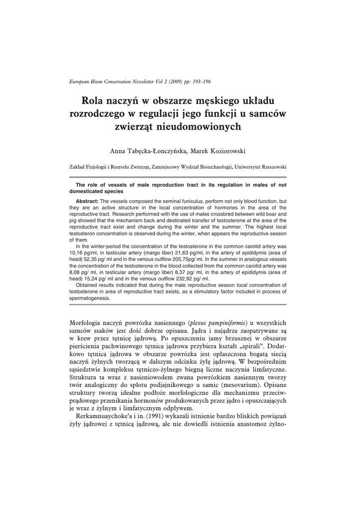 European Bison Conservation Newsletter Vol 2 (2009) pp: 193–196 Rola naczyń w obszarze męskiego układu rozrodczego w regulacji jego funkcji u samców zwierząt nieudomowionych Anna Tabęcka-Łonczyńska, Marek Koziorowski Zakład Fizjologii i Rozrodu Zwierząt, Zamiejscowy Wydział Biotechnologii, Uniwersytet Rzeszowski The role of vessels of male reproduction tract in its regulation in males of not domesticated species Abstract: The vessels composed the seminal funiculus, perform not only blood function, but they are an active structure in the local concentration of hormones in the area of the reproductive tract. Research performed with the use of males crossbred between wild boar and pig showed that the mechanism back and destinated transfer of testosterone at the area of the reproductive tract exist and change during the winter and the summer. The highest local testosteron concentration is observed during the winter, when appears the reproductive season of them. In the winter-period the concentration of the testosterone in the common carotid artery was 10,16 pg/ml, in testicular artery (margo liber) 21,63 pg/ml, in the artery of epididymis (area of head) 52,35 pg/ ml and in the venous outflow 205,75pg/ ml. In the summer in analogous vessels the concentration of the testosterone in the blood collected from the common carotid artery was 8,08 pg/ ml, in testicular artery (margo liber) 8,37 pg/ ml, in the artery of epididymis (area of head) 15,24 pg/ ml and in the venous outflow 232,92 pg/ ml. Obtained results indicated that during the male reproductive season local concentration of testosterone in area of reproductive tract exists, as a stimulatory factor included in process of spermatogenesis. Morfologia naczyń powrózka nasiennego (plexus pampiniformis) u wszystkich samców ssaków jest dość dobrze opisana. Jądra i najądrza zaopatrywane są w krew przez tętnicę jądrową. Po opuszczeniu jamy brzusznej w obszarze pierścienia pachwinowego tętnica jądrowa przybiera kształt „spirali”. Dodatkowo tętnica jądrowa w obszarze powrózka jest opłaszczona bogatą siecią naczyń żylnych tworzącą w dalszym odcinku żyłę jądrową. W bezpośrednim sąsiedztwie kompleksu tętniczo-żylnego biegną liczne naczynia limfatyczne. Struktura ta wraz z nasieniowodem zwana powrózkiem nasiennym tworzy twór analogiczny do splotu podjajnikowego u samic (mesovarium). Opisane struktury tworzą idealne podłoże morfologiczne dla mechanizmu przeciwprądowego przenikania hormonów produkowanych przez jądro i opuszczających je wraz z żylnym i limfatycznym odpływem. Rerkamnuaychoke’a i in. (1991) wykazali istnienie bardzo bliskich powiązań żyły jądrowej z tętnicą jądrową, ale nie dowiedli istnienia anastomoz żylno- 194 Rola naczyń w obszarze męskiego układu rozrodczego -tętniczych. Wykazali również, że bariera anatomiczna pomiędzy tętnicami i żyłami ogranicza się do dwóch warstw komórek a niekiedy tylko do jednej, co wydaje się być sprzyjające dla przenikania drobnocząsteczkowych substancji jakimi np. są hormony steroidowe. Podobne obserwacje opisali Einer-Jensen i Waites (1977) podając, że żyły splotu wiciowatego łączą się przydankami (tunica adventita) z tętnicą jądrową bez bezpośrednich połączeń (anastomoz). W dostępnym piśmiennictwie nie znaleziono zbyt wielu prac, których autorzy zgłębiliby fizjologiczną funkcję struktury naczyniowej powrózka. Waites i Moule (1960; 1961) sugerowali że charakterystyczna budowa powrózka nasiennego służy do tłumienia pulsów tętniącej krwi oraz do schładzania krwi tętniczej, poprzez wymianę ciepła z krwią żylną. W latach siedemdziesiątych ubiegłego wieku pojawiły się pierwsze prace o przenikaniu hormonów z żyły jądrowej do tętnicy. Przepływ znakowanego testosteronu między tętnicą jądrową a żyłą wykazany został u szczura (Free i in. 1973; Free, Jaffe 1975), u pawiana (Free, Tilson 1976), u tryka i kangura (Jacks, Setchell 1973). Przenikanie endogennego testosteronu z żyły jądrowej do tętnicy wykazano u szczura (Free i in. 1973; Free, Tilson 1976), u królika i świnki morskiej (Free 1977), u tryka (Ginther i in. 1974), u buhaja (Amann, Ganjam 1976), u małp rezus (Dierschke i in. 1975), oraz u człowieka (Bayard i in. 1975) (za Free & Jaffe 1978). Einer-Jensen i Waites (1976) udowodnili przenikanie z żyły jądrowej do tętnicy znakowanego trytem testosteronu oraz radioaktywnego kryptonu. Krzymowski i in. (2005) wykazali u szczurów przenikanie do naczyń limfatycznych w powrózku i krezce powrózka nasiennego barwnika wstrzykiwanego do jądra. Setchell i in. (1983) oraz Koziorowski i in. (pers. comm.) wykazali wysokie poziomy testosteronu w limfie opuszczającej jądro i płynącej naczyniami wzdłuż powrózka. Krzymowski i in. (2005) sugerują, że limfa opuszczająca jądro dociera bezpośrednio do gruczołów dodatkowych, takich jak prostata i gruczoły pęcherzykowe, będąc jednym ze źródeł zaopatrujących te gruczoły w hormony steroidowe jądra. Autorzy Ci sugerują także przenikanie hormonów z limfy odpływającej z jądra do krwi w obszarze powrózka i zwrotny ich transport do jądra, a także do najądrzy i nasieniowodów. W Zakładzie Fizjologii i Rozrodu Zwierząt Uniwersytetu Rzeszowskiego podjęto kompleksowe badania nad sezonowymi zmianami w zwrotnym i docelowym transferze hormonów steroidowych w naczyniach narządów rozrodczych samca świniodzika. Uzyskane wyniki jednoznacznie wskazują, że istnieje istotna różnica, zależna od sezonu, intensywności zwrotnego i docelowego transferu hormonów steroidowych w obszarze naczyniowym układu rozrodczego. Do badań użyto 8 dojrzałych płciowo samców świniodzika w okresie zimowym (grudzień – sezon rozrodczy u dzików) oraz latem (czerwiec – okres anestrus). Do analiz koncentracji testosteronu krew pobierano przez 2 godziny w odstępach 10 minutowych z tętnicy szyjnej wspólnej (