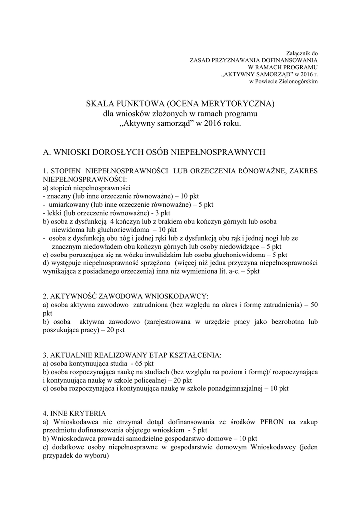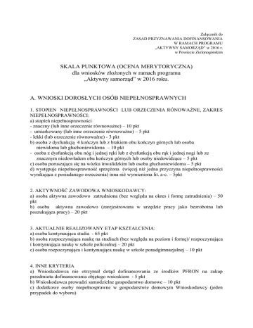 Załącznik do ZASAD PRZYZNAWANIA DOFINANSOWANIA W RAMACH PROGRAMU „AKTYWNY SAMORZĄD” w 2016 r. w Powiecie Zielonogórskim SKALA PUNKTOWA (OCENA MERYTORYCZNA) dla wniosków złożonych w ramach programu „Aktywny samorząd” w 2016 roku. A. WNIOSKI DOROSŁYCH OSÓB NIEPEŁNOSPRAWNYCH 1. STOPIEN NIEPEŁNOSPRAWNOŚCI LUB ORZECZENIA RÓNOWAŻNE, ZAKRES NIEPEŁNOSPRAWNOŚCI: a) stopień niepełnosprawności - znaczny (lub inne orzeczenie równoważne) – 10 pkt - umiarkowany (lub inne orzeczenie równoważne) – 5 pkt - lekki (lub orzeczenie równoważne) - 3 pkt b) osoba z dysfunkcją 4 kończyn lub z brakiem obu kończyn górnych lub osoba niewidoma lub głuchoniewidoma – 10 pkt - osoba z dysfunkcją obu nóg i jednej ręki lub z dysfunkcją obu rąk i jednej nogi lub ze znacznym niedowładem obu kończyn górnych lub osoby niedowidzące – 5 pkt c) osoba poruszająca się na wózku inwalidzkim lub osoba głuchoniewidoma – 5 pkt d) występuje niepełnosprawność sprzężona (więcej niż jedna przyczyna niepełnosprawności wynikająca z posiadanego orzeczenia) inna niż wymieniona lit. a-c. – 5pkt 2. AKTYWNOŚĆ ZAWODOWA WNIOSKODAWCY: a) osoba aktywna zawodowo zatrudniona (bez względu na okres i formę zatrudnienia) – 50 pkt b) osoba aktywna zawodowo (zarejestrowana w urzędzie pracy jako bezrobotna lub poszukująca pracy) – 20 pkt 3. AKTUALNIE REALIZOWANY ETAP KSZTAŁCENIA: a) osoba kontynuująca studia - 65 pkt b) osoba rozpoczynająca naukę na studiach (bez względu na poziom i formę)/ rozpoczynająca i kontynuująca naukę w szkole policealnej – 20 pkt c) osoba rozpoczynająca i kontynuująca naukę w szkole ponadgimnazjalnej – 10 pkt 4. INNE KRYTERIA a) Wnioskodawca nie otrzymał dotąd dofinansowania ze środków PFRON na zakup przedmiotu dofinansowania objętego wnioskiem - 5 pkt b) Wnioskodawca prowadzi samodzielne gospodarstwo domowe – 10 pkt c) dodatkowe osoby niepełnosprawne w gospodarstwie domowym Wnioskodawcy (jeden przypadek do wyboru) - w przypadku jednej osoby - 5 pkt - w przypadku więcej niż jedna osoba – 10 pkt d) szczególne utrudnienia Wnioskodawcy – 5 pkt e) uzasadnienie wyboru danego przedmiotu dofinansowania w odniesieniu do posiadanych zasobów; uzasadnienie wniosku wskazujące, że wnioskowany przedmiot dofinansowania podniesie jakość wykonywanej pracy lub poziom wykształcenia – 10 pkt f) wniosek dotyczy obszaru C Zadania nr 3 - 40 g) wniosek był kompletny – 5 pkt W 2016 r. wyznacza się minimalny próg punktowy dla Wnioskodawców pełnoletnich, umożliwiający bieżące udzielenie dofinansowania na poziomie – inwestycyjne 60 pkt. Bieżące – 40 pkt. Udzielenie dofinansowania wnioskodawcom, których wnioski uzyskały ocenę poniżej ustalonego minimalnego progu punktowego, uzależnione będzie od możliwości wynikających z ostatecznej puli przekazanych środków PFRON. B. WNIOSKI NIEPEŁNOLETNICH OSÓB NIEPEŁNOSPRAWNYCH 1. ZAKRES NIEPEŁNOSPRAWNOŚCI PODOPIECZNEGO WNIOSKODAWCY: 1) osoba z dysfunkcją czterech kończyn lub z brakiem obu kończyn górnych lub osoba niewidoma –10 pkt a) osoba z dysfunkcja obu nóg i jednej ręki lub dysfunkcją obu rąk i jednej nogi lub znacznym niedowładem obu kończyn górnych , osoba niedowidząca – 5 pkt b) podopieczny jest osoba po 16 roku życia, posiadającą znaczny stopień niepełnosprawności – 10 pkt c) niepełnosprawność podopiecznego jest sprzężona ( więcej niż jedna przyczyna niepełnosprawności wynikająca z posiadanego orzeczenia) inna niż wymieniona w pkt 1 a-b 5 pkt. 2. AKTUALNIE REALIZOWANY ETAP KSZTAŁCENIA: a) podopieczny pobiera naukę w szkole ponadgimnazjalnej – 50 pkt b) podopieczny pobiera naukę w gimnazjum – 30 pkt c) podopieczny pobiera naukę w szkole podstawowej –25 pkt d) podopieczny pobiera naukę w szkole specjalnej – 15pkt 3. INNE KRYTERIA a) Wnioskodawca, w tym jego podopieczny nie otrzymał dotąd dofinansowania ze środków PFRON na zakup przedmiotu dofinansowania objętego wnioskiem – 5 pkt b) dodatkowe osoby niepełnosprawne w gospodarstwie domowym Wnioskodawcy (jeden przypadek do wyboru): - w przypadku jednej osoby - 5 pkt - w przypadku więcej niż jedna osoba – 10 pkt c) szczególne utrudnienia Wnioskodawcy i podopiecznego – 5 pkt d) uzasadnienie wyboru danego przedmiotu dofinansowania w odniesieniu do posiadanych zasobów, uzasadnienie wniosku wskazujące, że wnioskowany przedmiot dofinansowania podniesie jakość wykonywanej pracy lub poziom wykształcenia lub podopieczny jest osobą aktywną zawodowo – 10 pkt e) wniosek był kompletny w dniu przyjęcia – 5 pkt. W 2016 r. wyznacza się minimalny próg punktowy dla Wnioskodawców składających wniosek na rzecz swojego podopiecznego, umożliwiający bieżące udzielenie dofinansowania na poziomie – inwestycyjne 60 pkt, bieżące 40 pkt. Udzielenie dofinansowania wnioskodawcom, których wnioski przeszły pozytywną ocenę merytoryczną i uzyskały ocenę poniżej ustalonego minimalnego progu punktowego, uzależnione będzie od możliwości wynikających z ostatecznej puli przekazanych środków PFRON.