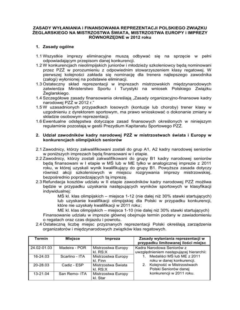 ZASADY WYŁANIANIA i FINANSOWANIA REPREZENTACJI POLSKIEGO ZWIĄZKU ŻEGLARSKIEGO NA MISTRZOSTWA ŚWIATA, MISTRZOSTWA EUROPY i IMPREZY RÓWNORZĘDNE w 2012 roku 1. Zasady ogólne 1.1 Wszystkie imprezy eliminacyjne muszą odbywać się na sprzęcie w pełni odpowiadającym przepisom danej konkurencji. 1.2 W konkurencjach nieolimpijskich juniorów i młodzieży szkoleniowcy będą nominowani przez PZŻ w porozumieniu z odpowiednim stowarzyszeniem klasy regatowej. W pierwszej kolejności zakłada się nominację dla trenera najlepszego zawodnika (załogi) wyłonionej na podstawie eliminacji. 1.3 Ostateczny skład reprezentacji w imprezach mistrzowskich międzynarodowych zatwierdza Ministerstwo Sportu i Turystyki na wniosek Polskiego Związku Żeglarskiego. 1.4 Szczegółowe zasady finansowania określają „Zasady organizacyjno-finansowe kadry narodowej PZŻ w 2012 r.” 1.5 W uzasadnionych przypadkach losowych (kontuzje lub choroby) trener klasy w uzgodnieniu z dyrektorem sportowym, ma prawo wnioskować o dokonanie zmiany w składzie osobowym reprezentacji. 1.6 Ewentualne odstępstwa dotyczące zasad finansowych określonych w niniejszym regulaminie pozostają w gestii Prezydium Kapitanatu Sportowego PZŻ. 2. Udział zawodników kadry narodowej PZŻ w mistrzostwach świata i Europy w konkurencjach olimpijskich seniorów 2.1 Zawodnicy, którzy zakwalifikowani zostali do grup A1, A2 kadry narodowej seniorów w poniższych imprezach będą finansowani w I etapie. 2.2 Zawodnicy, którzy zostali zakwalifikowani do grupy B1 kadry narodowej seniorów będą finansowani w I etapie w MŚ lub w ME tylko w analogicznej imprezie z 2011 roku, w której uzyskali wynik kwalifikujący do grupy B1. Powyższa zasada dotyczy również akcji szkoleniowych w miejscu rozgrywania imprezy mistrzowskiej, bezpośrednio poprzedzających tą imprezę. 2.3 Refundacja kosztów udziału w II etapie zawodników kadry narodowej PZŻ możliwa będzie w przypadku uzyskania następujących wyników sportowych w klasyfikacji indywidualnej: MŚ kl. klas olimpijskich – miejsca 1-12 (nie dalej niż 30% stawki startujących) lub uzyskanie kwalifikacji olimpijskiej dla Polski w przypadku konkurencji, które nie uzyskały kwalifikacji w 2011 roku; ME kl. klas olimpijskich – miejsca 1-10 (nie dalej niż 30% stawki startujących) Finansowanie udziału w imprezie głównej obejmuje termin podany w zawiadomieniu o regatach oraz czas dojazdu i powrotu. 2.4 Ostateczną liczbę miejsc przyznanych reprezentacji Polski określają zarządzenia organizatorów i międzynarodowych związków klas regatowych. Termin Miejsce 24.02-01.03 Madeira - POR 16-24.03 Scarlino - ITA 20-28.03 Cadiz - ESP 13-21.04 San Remo- ITA Impreza Mistrzostwa Europy kl. RS:X Mistrzostwa Europy kl. Finn Mistrzostwa Świata kl. RS:X Mistrzostwa Europy kl. Star Zasady wyłaniania reprezentacji w przypadku limitowanej ilości miejsc Kadra Narodowa Seniorów z uwzględnieniem następującej hierarchii: 1. Medaliści MŚ lub ME z 2011 roku w danej konkurencji. 2. Kolejność w Mistrzostwach Polski Seniorów danej konkurencji w 2011 roku. 03-12.05 Hyeres - FRA 04-10.05 04-13.05 Boltenhagen GER Zadar - CRO 10-19.05 Barcelona - ESP 11-18.05 Falmouth - GBR 13-20.05 25.06-03.07 Boltenhagen GER Largs - GBR 30.06-07.07 Hourtin - FRA 9-15.09 Riva del Garda ITA Mistrzostwa Świata kl. Star Mistrzostwa Świata kl. Laser Mistrzostwa Świata kl. 49er Mistrzostwa Świata kl. 470 Mistrzostwa Świata kl. Finn Mistrzostwa Świata kl. Laser Radial Mistrzostwa Europy kl. 470 Mistrzostwa Europy kl. Laser, Las. Radial Mistrzostwa Europy kl. 49er O kolejności startu w imprezach decyduje aktualny ranking kwalifikacji olimpijskich zawodników PZŻ danej konkurencji na podstawie regulaminu „kwalifikacje zawodników PZŻ do IOl Londyn 2012” Impreza eliminacyjna: 1) 25-27.05 – Puchar PZŻ, Puck Impreza eliminacyjna: 1) 18-20.05 – Puchar PZŻ, Puck (Laser) 2) 25-27.05 – Puchar PZŻ, Puck (Radial) Kadra Narodowa Seniorów 3. Udział zawodników kadry narodowej PZŻ w regatach Pucharu Świata będących jedocześnie kwalifikacjami zawodników PZŻ do IOl w 2012 roku 3.1 W regatach Pucharu Świata będących jednocześnie kwalifikacjami zawodników PZŻ do Igrzysk Olimpijskich w 2012 roku kolejność startu będzie następująca: Termin Miejsce Impreza Planowany skład reprezentacji i zasady jej wyłaniania 31.03-06.04 Palma de Mallorca Trofeo SAR Princessa Kadra Narodowa Seniorów z - ESP Sofia Maphre uwzględnieniem następującej hierarchii: 1. Medaliści MŚ lub ME z 2011 roku w danej konkurencji. 2. Kolejność w Mistrzostwach Polski Seniorów danej konkurencji w 2011 roku. 20-27.04 Hyeres - FRA Semaine Olympique O kolejności startu decyduje aktualny Francaise ranking kwalifikacji olimpijskich zawodników PZŻ danej konkurencji na podstawie regulaminu „kwalifikacje zawodników PZŻ do IOl Londyn 2012” 4. Udział zawodników kadry narodowej PZŻ w mistrzostwach świata i Europy w konkurencjach młodzieżowych, juniorskich i nieolimpijskich oraz w imprezach głównych, których udział jest limitowany 4.1 Udział w poniższych imprezach finansowany będzie wg poniższych zasad: Finansowanie w I etapie - medaliści analogicznych imprez w poprzednim roku oraz trener w konkurencjach juniorskich i młodzieżowych; Finansowanie zadań w II etapie stanowi zwrot kosztów dla zawodników kadry narodowej, którzy w poniższych imprezach zajęli w klasyfikacji końcowej miejsca 1-8 i nie dalej niż w 25% stawki sklasyfikowanych. 4.2 Finansowanie udziału w imprezie głównej obejmuje termin podany w zawiadomieniu o regatach oraz czas dojazdu i powrotu. 4.3 W konkurencjach nieolimpijskich w kategorii seniorów nie przewiduje się finansowania kosztów trenera. Finansowanie kosztów trenerów w pozostałych imprezach wymagać będzie realizacji zadań wynikowych przez konkurencję ustalonych podczas indywidualnych konsultacji Pionu Sportu PZŻ z przedstawicielami stowarzyszeń klas regatowych