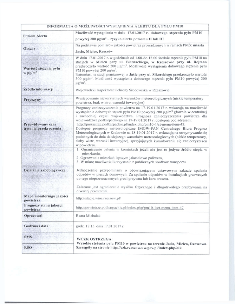 I N F O R M A C J A O MOŻLIWOŚCI WYSTĄPIENIA A L E R T U D L A PYŁU PM10 Możliwość wystąpienia w dniu 17.01.2017 r. dobowego stężenia pyłu PM10 Poziom Alertu 3 powyżej 200 u.g/m - ryzyko alertu poziomu II lub I I I Na podstawie pomiarów jakości powietrza prowadzonych w ramach PMS: miasta Obszar Jasło, Mielec, Rzeszów W dniu 17.01.2017 r. w godzinach od 1.00-do 12.00 średnie stężenie pyłu PM 10 na stacjach w Mielcu przy ul. Biernackiego, w Rzeszowie przy ul. Rejtana przekroczyło wartość 200 ug/m . Możliwość wystąpienia dobowego stężenia pyłu PM 10 powyżej 200 ug/m . Natomiast na stacji pomiarowej w Jaśle przy ul. Sikorskiego przekroczyło wartość 300 ug/m . Możliwość wystąpienia dobowego stężenia pyłu PM 10 powyżej 300 Mg/m . 3 Wartość stężenia pyłu w fig/m 3 3 3 3 Źródło informacji Wojewódzki Inspektorat Ochrony Środowiska w Rzeszowie Przyczyny Występowanie niekorzystnych warunków meteorologicznych (niskie temperatury powietrza, brak wiatru, warunki inwersyjne) Prognozy zanieczyszczenia powietrza na 17-19.01.2017 r. wskazują na możliwość wystąpienia dobowych stężeń pyłu PM 10 powyżej 200 ug/m głównie w centralnej i zachodniej części województwa. Prognoza zanieczyszczenia powietrza dla województwa podkarpackiego na 17-19 01.2017 r. dostępna pod adresem: http://powietrze.podkarpackie.pl/index.php/pm 10-1 /ct-menu-item-47. Dostępne prognozy meteorologiczne IMGW-PAN Centralnego Biura Prognoz Meteorologicznych w Krakowie na 18-19.01.2017 r. wskazują na utrzymywanie się podobnych do dnia dzisiejszego warunków meteorologicznych (niskie temperatury, słaby wiatr, warunki inwersyjne), sprzyjających kumulowaniu się zanieczyszczeń w powietrzu. 1. Ograniczenie palenia w kominkach jeżeli nie jest to jedyne źródło ciepła w mieszkaniu, 2. Ogrzewanie mieszkań lepszym jakościowo paliwem, 3. W miarę możliwości korzystanie z publicznych środków transportu. 3 Przewidywany czas trwania przekroczenia Działania zapobiegawcze Jednocześnie przypominany o obowiązującym ustawowym zakazie spalania odpadów w piecach domowych. Za spalanie odpadów w instalacjach grzewczych do tego nieprzeznaczonych grozi grzywna lub kara aresztu. Zalecane jest ograniczenie wysiłku fizycznego i długotrwałego przebywania na otwartej przestrzeni. Mapa monitoringu jakości powietrza http://stacje.wios.rzeszow.pl/ Prognozy stanu jakości powietrza http://powietrze.podkarpackie.pl/index.php/pm 10-1 /ct-menu-item-47 Opracował Beata Michalak Godzina i data godz. 12.15 dnia 17.01.2017 r. SMS RSO WCZK OSTRZEGA: Wysokie stężenia pyłu PM 10 w powietrzu na terenie Jasła, Mielca, Rzeszowa. Szczegóły na stronie http://czk.rzeszow.uw.gov.pl/index.php/oik