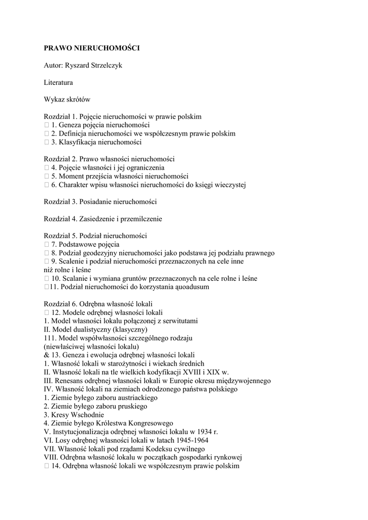 PRAWO NIERUCHOMOŚCI Autor: Ryszard Strzelczyk Literatura Wykaz skrótów Rozdział 1. Pojęcie nieruchomości w prawie polskim 1. Geneza pojęcia nieruchomości 2. Definicja nieruchomości we współczesnym prawie polskim 3. Klasyfikacja nieruchomości Rozdział 2. Prawo własności nieruchomości 4. Pojęcie własności i jej ograniczenia 5. Moment przejścia własności nieruchomości 6. Charakter wpisu własności nieruchomości do księgi wieczystej Rozdział 3. Posiadanie nieruchomości Rozdział 4. Zasiedzenie i przemilczenie Rozdział 5. Podział nieruchomości 7. Podstawowe pojęcia 8. Podział geodezyjny nieruchomości jako podstawa jej podziału prawnego 9. Scalenie i podział nieruchomości przeznaczonych na cele inne niż rolne i leśne 10. Scalanie i wymiana gruntów przeznaczonych na cele rolne i leśne 11. Podział nieruchomości do korzystania ąuoadusum Rozdział 6. Odrębna własność lokali 12. Modele odrębnej własności lokali 1. Model własności lokalu połączonej z serwitutami II. Model dualistyczny (klasyczny) 111. Model współwłasności szczególnego rodzaju (niewłaściwej własności lokalu) & 13. Geneza i ewolucja odrębnej własności lokali 1. Własność lokali w starożytności i wiekach średnich II. Własność lokali na tle wielkich kodyfikacji XVIII i XIX w. III. Renesans odrębnej własności lokali w Europie okresu międzywojennego IV. Własność lokali na ziemiach odrodzonego państwa polskiego 1. Ziemie byłego zaboru austriackiego 2. Ziemie byłego zaboru pruskiego 3. Kresy Wschodnie 4. Ziemie byłego Królestwa Kongresowego V. Instytucjonalizacja odrębnej własności lokalu w 1934 r. VI. Losy odrębnej własności lokali w latach 1945-1964 VII. Własność lokali pod rządami Kodeksu cywilnego VIII. Odrębna własność lokalu w początkach gospodarki rynkowej 14. Odrębna własność lokali we współczesnym prawie polskim I. Ustawa o własności lokali z 1994 r II. Definicja lokalu III. Miejsca garażowe (postojowe) IV. Balkony i loggie V. Podział lokali na mieszkalne i te o innym przeznaczeniu VI. Samodzielność lokalu VII. Status prawny lokali niewyodrębnionych VIII. Powstanie odrębnej własności lokalu 1. Zagadnienia ogólne 2. Umowa o ustanowienie odrębnej własności lokalu 3. Jednostronna czynność prawna właściciela nieruchomości 4. Umowa o wybudowanie lokalu 5. Powstanie odrębnej własności lokalu ex legę IX. Wspólnota mieszkaniowa X. Ustanie odrębnej własności lokali & 15. Obrót lokalami mieszkalnymi i lokalami o innym przeznaczeniu I. Specyfika obrotu nieruchomościami lokalowymi II. Rozporządzenie prawem do lokalu przed wpisem jego własności do księgi wieczystej Rozdział 7. Spółdzielcze własnościowe prawo do lokalu 16. Geneza i ewolucja spółdzielczych praw do lokali w prawie polskim I. Lokale spółdzielcze w okresie międzywojennym II. Spółdzielczość mieszkaniowa po II wojnie światowej III. Powrót odrębnej własności lokali do spółdzielczości mieszkaniowej w 1982 r IV. Nowe oblicze spółdzielczości mieszkaniowej po 2000 r 17. Spółdzielcze lokatorskie prawo do lokalu 18. Spółdzielcze własnościowe prawo do lokalu 19. Ekspektatywa odrębnej własności lokalu w budynkach spółdzielni mieszkaniowych 20. Asymetryczna konwergencja praw do lokali 21. Obrót spółdzielczymi własnościowymi prawami do lokali Rozdział 8. Użytkowanie wieczyste 22. Prawo zabudowy jako antenat użytkowania wieczystego 23. Przedmiot, podmioty i treść użytkowania wieczystego 24. Wygaśnięcie prawa użytkowania wieczystego 25. Obrót użytkowaniem wieczystym Rozdział 9. Obciążanie nieruchomości ograniczonymi prawami rzeczowymi 26. Katalog ograniczonych praw rzeczowych & 27. Użytkowanie I. Przedmiot i treść użytkowania II. Obowiązki stron III. Użytkowanie przez rolnicze spółdzielnie produkcyjne IV. Użytkowanie nieruchomości na zasadzie timesharingu & 28. Służebności I. Pojęcie i rodzaje służebności II. Służebność gruntowa III. Służebność osobista IV. Służebność przesyłu 29. Hipoteka I. Wiadomości ogólne II. Hipoteka umowna III. Hipoteka łączna IV. Hipoteka przymusowa V. Hipoteka ustawowa VI. Skutki zniesienia podziału hipoteki na zwykłą i kaucyjną VII. Rozporządzenie opróżnionym miejscem hipotecznym VIII. Wygaśnięcie hipoteki IX. Hipoteka zabezpieczająca odwrócony kredyt hipoteczny (uwagi de legę ferenda) Rozdział 10. Umowy zobowiązujące i rozporządzające 30. Prawa obligacyjne i rzeczowe związane ze stosunkami między ludźmi 31. Prawa skuteczne bezwzględnie (erga omnes) i względnie (inter partes). Rozszerzona skuteczność niektórych praw obligacyjnych 32. Skutki prawne umów zobowiązujących i rozporządzających 33. Umowa warunkowa a umowa przedwstępna 34. Kauzalność materialna i formalna Rozdział 11. Akt notarialny jako szczególna forma czynności prawnej 35. Geneza aktu notarialnego i jego rola w obrocie nieruchomościami I. Przenoszenie własności nieruchomości na ziemiach byłego zaboru austriackiego II. Przenoszenie własności nieruchomości na ziemiach byłego zaboru pruskiego III. Przenoszenie własności nieruchomości na Kresach Wschodnich IV. Przenoszenie własności nieruchomości na ziemiach byłego Królestwa Kongresowego 36. Akt notarialny we współczesnym prawie polskim & 37. Tryb sporządzania aktu notarialnego 38. Elementy aktu notarialnego Rozdział 12. Rodzaje umów w obrocie nieruchomościami 39. Umowa sprzedaży nieruchomości 40. Umowa zamiany nieruchomości 41. Umowa darowizny nieruchomości 42. Umowa o dożywocie 43. Umowa o zniesienie współwłasności nieruchomości 44. Umowa o dział spadku obejmującego nieruchomość 45. Powiernicze (fiducjarne) nabycie nieruchomości 46. Przeniesienie własności nieruchomości na zabezpieczenie 47. Wniesienie nieruchomości jako aportu do spółki I. Zdolność aportowa II. Nieruchomość jako aport do spółki cywilnej III. Nieruchomość jako aport do spółki oso