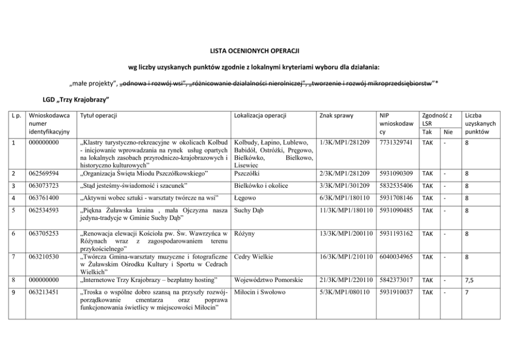 LISTA OCENIONYCH OPERACJI wg liczby uzyskanych punktów zgodnie z lokalnymi kryteriami wyboru dla działania: „małe projekty”, „odnowa i rozwój wsi”, „różnicowanie działalności nierolniczej”, „tworzenie i rozwój mikroprzedsiębiorstw”* LGD „Trzy Krajobrazy” L p. Wnioskodawca numer identyfikacyjny Tytuł operacji Lokalizacja operacji 1 000000000 2 062569594 „Klastry turystyczno-rekreacyjne w okolicach Kolbud - inicjowanie wprowadzania na rynek usług opartych na lokalnych zasobach przyrodniczo-krajobrazowych i historyczno kulturowych” „Organizacja Święta Miodu Pszczółkowskiego” 3 063073723 4 Znak sprawy NIP wnioskodaw cy Zgodnośd z LSR Tak Nie Liczba uzyskanych punktów Kolbudy, Łapino, Lublewo, 1/3K/MP1/281209 Babidół, Ostróżki, Pręgowo, Bielkówko, Bielkowo, Lisewiec Pszczółki 2/3K/MP1/281209 7731329741 TAK - 8 5931090309 TAK - 8 „Stąd jesteśmy-świadomość i szacunek” Bielkówko i okolice 3/3K/MP1/301209 5832535406 TAK - 8 063761400 „Aktywni wobec sztuki - warsztaty twórcze na wsi” Łęgowo 6/3K/MP1/180110 5931708146 TAK - 8 5 062534593 „Piękna Żuławska kraina , mała Ojczyzna nasza Suchy Dąb jedyna-tradycje w Gminie Suchy Dąb” 11/3K/MP1/180110 5931090485 TAK - 8 6 063705253 13/3K/MP1/200110 5931193162 TAK - 8 7 063210530 16/3K/MP1/210110 6040034965 TAK - 8 8 000000000 „Renowacja elewacji Kościoła pw. Św. Wawrzyńca w Różyny Różynach wraz z zagospodarowaniem terenu przykościelnego” „Twórcza Gmina-warsztaty muzyczne i fotograficzne Cedry Wielkie w Żuławskim Ośrodku Kultury i Sportu w Cedrach Wielkich” „Internetowe Trzy Krajobrazy – bezpłatny hosting” Województwo Pomorskie 21/3K/MP1/220110 5842373017 TAK - 7,5 9 063213451 „Troska o wspólne dobro szansą na przyszły rozwój- Miłocin i Swołowo porządkowanie cmentarza oraz poprawa funkcjonowania świetlicy w miejscowości Miłocin” 5/3K/MP1/080110 5931910037 TAK - 7 10 063018346 063018346 11 12 047947921 13 063650340 14 063762525 15 063862952 16 063018346 17 063073723 18 063213451 19 063018346 20 063018346 21 000000000 „Warsztaty historyczne dla dzieci i młodzieży z Granicznej Wsi” „Doposażenie świetlicy wiejskiej oraz organizacji warsztatów plastyczno-historycznych dla mieszkańców wsi Cząstkowo” „Warsztaty dla dzieci w wieku szkolnym(szkoły podstawowe)ze szkół Gminy Pruszcz Gdański –teren LGD. Temat szkolenia: „Od ziarenka do bochenka” „Wyposażenie i prowadzenie scholii dziecięco– młodzieżowej w Mierzeszynie” „Międzypokoleniowe gotowanie piekielnych potraw w świetlicy wiejskiej w Rokitnicy” „Wiklinowa wieś-warsztaty wyplatania wikliny, trzciny oraz słomy w miejscowości Giemlice” „Warsztaty taneczne dla dzieci w wieku 6-13 lat w Trąbkach Wielkich” „Wyznaczanie i oznakowanie ścieżki rowerowej na terenie Gminy Kolbudy” „Remont świetlicy w miejscowości Trzcinisko wraz z organizacją warsztatów plastycznych” „Festyn i warsztaty artystyczne jako forma aktywizacji społecznej mieszkańców Postołowa „Zagospodarowanie terenu sportowo-rekreacyjnego w Gołębiewku poprzez nasadzenia zieleni i zakup sprzętu” „Festyn w Mierzeszynie” Graniczna Wieś 7/3K/MP1/180110 6040021514 TAK - 7 Cząstkowo 9/3K/MP1/180110 6040021514 TAK - 7 Gmina Pruszcz Gdański 12/3K/MP1/190110 5931010345 TAK - 7 Mierzeszyn 14/3K/MP1/200110 5921564088 TAK - 7 Rokitnica 15/3K/MP1/210110 6040110608 TAK - 7 Giemlice 17/3K/MP1/210110 6040092997 TAK - 7 Trąbki Wielkie 18/3K/MP1/210110 6040021514 TAK - 7 od 19/3K/MP1/210110 5832535406 TAK - 7 4/3K/MP1/080110 5931910037 TAK - 6 Postołowo 8/3K/MP1/180110 6040021514 TAK - 6 Gołębiewko 10/3K/MP1/180110 6040021514 - NIE - Mierzeszyn 20/3K/MP1/220110 6040055039 - NIE - Gmina Kolbudy Czapielska do Otomina Trzcinisko, Miłocin *niepotrzebne skreślid …………………………….. …………………………………………………. Miejscowośd , data podpis Przewodniczącego Rady