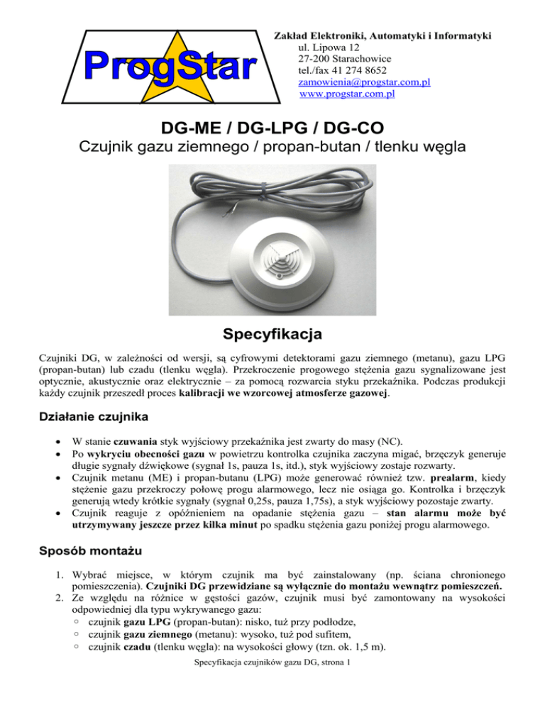 Zakład Elektroniki, Automatyki i Informatyki ul. Lipowa 12 27-200 Starachowice tel./fax 41 274 8652 [email protected] www.progstar.com.pl DG-ME / DG-LPG / DG-CO Czujnik gazu ziemnego / propan-butan / tlenku węgla Specyfikacja Czujniki DG, w zależności od wersji, są cyfrowymi detektorami gazu ziemnego (metanu), gazu LPG (propan-butan) lub czadu (tlenku węgla). Przekroczenie progowego stężenia gazu sygnalizowane jest optycznie, akustycznie oraz elektrycznie – za pomocą rozwarcia styku przekaźnika. Podczas produkcji każdy czujnik przeszedł proces kalibracji we wzorcowej atmosferze gazowej. Działanie czujnika W stanie czuwania styk wyjściowy przekaźnika jest zwarty do masy (NC). Po wykryciu obecności gazu w powietrzu kontrolka czujnika zaczyna migać, brzęczyk generuje długie sygnały dźwiękowe (sygnał 1s, pauza 1s, itd.), styk wyjściowy zostaje rozwarty. Czujnik metanu (ME) i propan-butanu (LPG) może generować również tzw. prealarm, kiedy stężenie gazu przekroczy połowę progu alarmowego, lecz nie osiąga go. Kontrolka i brzęczyk generują wtedy krótkie sygnały (sygnał 0,25s, pauza 1,75s), a styk wyjściowy pozostaje zwarty. Czujnik reaguje z opóźnieniem na opadanie stężenia gazu – stan alarmu może być utrzymywany jeszcze przez kilka minut po spadku stężenia gazu poniżej progu alarmowego. Sposób montażu 1. Wybrać miejsce, w którym czujnik ma być zainstalowany (np. ściana chronionego pomieszczenia). Czujniki DG przewidziane są wyłącznie do montażu wewnątrz pomieszczeń. 2. Ze względu na różnice w gęstości gazów, czujnik musi być zamontowany na wysokości odpowiedniej dla typu wykrywanego gazu: ◦ czujnik gazu LPG (propan-butan): nisko, tuż przy podłodze, ◦ czujnik gazu ziemnego (metanu): wysoko, tuż pod sufitem, ◦ czujnik czadu (tlenku węgla): na wysokości głowy (tzn. ok. 1,5 m). Specyfikacja czujników gazu DG, strona 1 3. Zdjąć pokrywę czujnika, obracając ją w kierunku zgodnym z ruchem wskazówek zegara. 4. Przykręcić podstawę do powierzchni montażowej za pomocą wkrętów lub kołków rozporowych. 5. Ułożyć przewód połączeniowy, doprowadzając go do monitorującego urządzenia (np. modułu SMS-4, SMS-3 lub MPS-1). Przewód można przedłużyć za pomocą dowolnego 3-żyłowego kabla na odległość do 100 metrów. 6. Zamknąć obudowę czujnika, nakładając właściwie zorientowaną pokrywę i obracając ją w kierunku przeciwnym do ruchu wskazówek zegara. 7. Po całkowitym podłączeniu i skonfigurowaniu obsługi czujnika należy wykonać test, kierując na czujnik testową mieszankę gazów przez ok. 10 sekund. Kiedy stężenie gazu przekroczy próg detekcyjny, czujnik powinien zadziałać, sygnalizując alarm akustycznie oraz kontrolką LED. Uwagi 1. Nie zaleca się montowania czujników DG w pomieszczeniach z instalacjami o charakterze przemysłowym. 2. Nie należy montować czujnika w środowiskach zapylonych, zakurzonych lub zanieczyszczonych. 3. Po włączeniu zasilania czujnik sygnalizuje uruchomienie trzema krótkimi sygnałami akustycznymi i mignięciami kontrolki LED. 4. W trakcie pracy czujnika detektor gazu nagrzewa się. 5. W czasie rozruchu czujnika możliwe jest wygenerowanie fałszywego alarmu – jest to naturalny efekt związany z wygrzewaniem detektora. 6. Możliwe jest wyłączenie alarmu akustycznego (brzęczyka) przez zdjęcie zworki znajdującej się wewnątrz obudowy czujnika. 7. Kolor kontrolki LED zależy od typu wykrywanego gazu: ME: żółta, LPG: zielona, CO: czerwona. Wyprowadzenia czujnika Przewód biały: linia zasilania; połączyć z biegunem „+” napięcia zasilania 12 V prądu stałego. Przewód zielony: styk wyjściowy czujnika; połączyć z linią L1L8 modułu SMS-4 / L1L10 SMS-3 / L1L16 MPS-1. Przewód brązowy: masa; połączyć z linią GND (G) modułu SMS-4 / SMS-3 / MPS-1. Parametry techniczne Znamionowe napięcie zasilania Pobór prądu w stanie czuwania Czas rozruchu po włączeniu zasilania Wymiary obudowy Masa (bez przewodu połączeniowego) Długość przewodu połączeniowego 12 V DC 15% typ. 30 mA, max. 50 mA 60 s Średnica 97 mm, wysokość 36 mm 63 g 2m Specyfikacja czujników gazu DG, strona 2