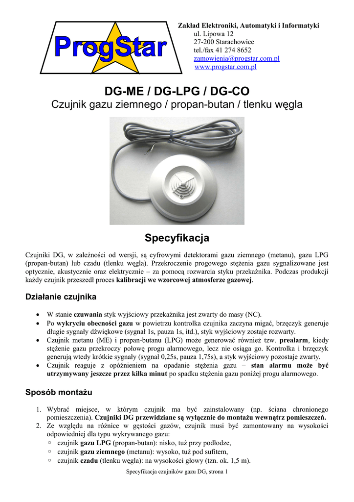 Specyfikacja czujnika gazu DG-ME/LPG/CO