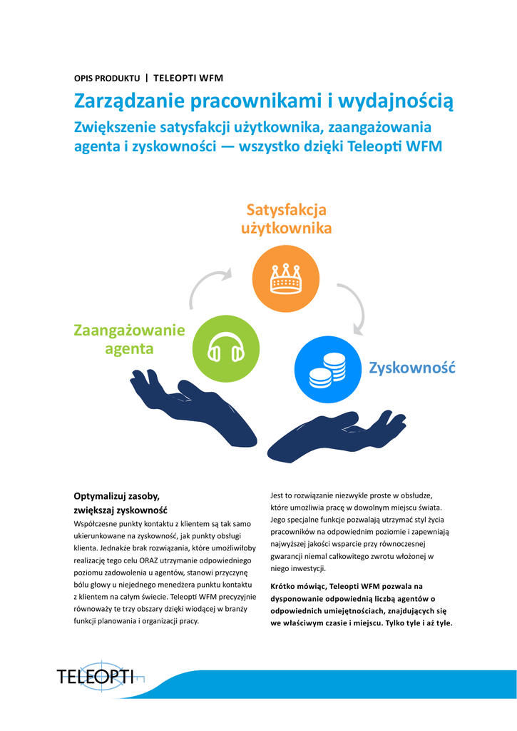 OPIS PRODUKTU | TELEOPTI WFM Zarządzanie pracownikami i wydajnością Zwiększenie satysfakcji użytkownika, zaangażowania agenta i zyskowności — wszystko dzięki Teleopti WFM Satysfakcja użytkownika Zaangażowanie agenta Optymalizuj zasoby, zwiększaj zyskowność Współczesne punkty kontaktu z klientem są tak samo ukierunkowane na zyskowność, jak punkty obsługi klienta. Jednakże brak rozwiązania, które umożliwiłoby realizację tego celu ORAZ utrzymanie odpowiedniego poziomu zadowolenia u agentów, stanowi przyczynę bólu głowy u niejednego menedżera punktu kontaktu z klientem na całym świecie. Teleopti WFM precyzyjnie równoważy te trzy obszary dzięki wiodącej w branży funkcji planowania i organizacji pracy. Zyskowność Jest to rozwiązanie niezwykle proste w obsłudze, które umożliwia pracę w dowolnym miejscu świata. Jego specjalne funkcje pozwalają utrzymać styl życia pracowników na odpowiednim poziomie i zapewniają najwyższej jakości wsparcie przy równoczesnej gwarancji niemal całkowitego zwrotu włożonej w niego inwestycji. Krótko mówiąc, Teleopti WFM pozwala na dysponowanie odpowiednią liczbą agentów o odpowiednich umiejętnościach, znajdujących się we właściwym czasie i miejscu. Tylko tyle i aż tyle. Do wszystkich typów pracy — w biurze lub z wykorzystaniem chmury danych Użytkownicy Teleopti zarządzają różnymi grupami agentów — od kilku do kilku tysięcy — w ponad 80 krajach. Niezależnie od branży czy rozmiaru punktu kontaktu z klientem, wyzwanie pozostaje to samo: dokładne zaplanowanie i zorganizowanie pracy oraz zapewnienie jej wykonania. Niezależnie od sytuacji, Teleopti WFM można dostosować do każdego rodzaju wymagań – pracy w biurze lub z użyciem chmury danych – stwarzając znaczącą przewagę nad konkurencją. WFM Oprzyj się na solidnych fundamentach! Jak zaplanować przyszłość, która jest nieprzewidywalna? Oto jest pytanie. Odpowiedź jest prosta: Teleopti WFM stanowi najwydajniejsze na rynku narzędzie do prognozowania. Pozwala ono pracować za pośrednictwem wszystkich kanałów kontaktu z klientem: sieć telefoniczną (wewnętrzną i zewnętrzną), czaty, pocztę e-mail i media społecznościowe. Stwarzając możliwość łatwej integracji z każdą platformą technologiczną, pozwala na przeanalizowanie historii działań — z uwzględnieniem sezonowości, analizą tendencji i kampanii — w celu zaplanowania przyszłych działań. Dzięki możliwości stworzenia prognoz dla dowolnego przedziału czasu — czy to będzie jutrzejszy dzień, czy też kolejny rok — i wprowadzenia natychmiastowych zmian w planie, dysponujesz przygotowaniem, które pozwoli zmierzyć się z przyszłością. Oprogramowanie używane w punkcie kontaktu z klientem musi zapewniać możliwość gromadzenia, oceny i analizowania danych w interakcji agent-klient, stwarzając odpowiednią możliwość podjęcia właściwych działań. OPIS PRODUKTU | TELEOPTI WFM | 2 ROZWIĄZANIE TELEOPTI WFM LIFESTYLE Outbound Manager Shift Trader Vacation Planner NOTIFY MyTime - for Agents Teams - for Team leaders Multichannel Forecasting Gamification Overtime Availability Real Time Adherence Performance Manager Intraday Management Multiskill Scheduling Calendar Link SMS Link CTI Connectors ASM Shifts Competence Manager Training Planner Budgeting People Standard Reports Desktop Analytics CRM, HR, QM Connectors Jest to moment, w którym zaczyna się magia: organizujący pracę na podstawie dokładnej prognozy może od razu przydzielić agentów do poszczególnych zadań. Pracujesz w wielu miejscach nad wieloma zadaniami? Nie ma problemu: Teleopti WFM pozwoli zoptymalizować Twój harmonogram pracy. Każdy rodzaj obowiązujących Cię zasad — krajowe przepisy prawa pracy, wymogi kontraktowe, preferencje agentów — można uwzględnić w procesie automatycznego planowania zadań. Teleopti WFM umożliwia zorganizowanie dowolnie długiego harmonogramu pracy, dzięki czemu, z pomocą dodatkowych zasobów, każdemu najgorętszemu okresowi pracy będzie poświęcona jednakowa ilość uwagi. Zaangażuj agentów w planowanie pracy Teleopti WFM funkcjonuje przy założeniu, że agenci stanowią najcenniejszy z Twoich zasobów. KONIECZNE jest zatem wyposażenie się w narzędzie dostępne na każdym nowoczesnym urządzeniu, które zapewni agentom wgląd we własny harmonogram pracy, odbieranie wiadomości, dokonywanie modyfikacji w zmianach roboczych, składanie wniosków o czas wolny, wpisywanie preferencji dotyczących statusu i określanie swojej dostępności w kwestii nadgodzin — a wszystko to przy mniejszej redukcji personelu. Co więcej, Payroll Export INTEGRATIONS Teleopti WFM składa się z podstawowego produktu i opcjonalnych, dodatkowych modułów/pakietów, które można łatwo dostosować i rozszerzyć odpowiednio do własnych potrzeb. Zdobądź najbogatsze w funkcje rozwiązanie dostępne na rynku, znajdujące się zawsze w awangardzie nowatorskich rozwiązań! Planowanie i optymalizacja 3rd Party Apps SDK dostępne funkcje grywalizacji i samooceny zwiększają zaangażowanie agentów i pomagają w osiągnięciu przez nich lepszej ogólnej wydajności. Uzupełniaj i ulepszaj Punkty kontaktu z klientem są jednym z najbardziej dynamicznych obszarów pracy w wielu organizacjach. Teleopti WFM wspomaga ich dynamiczną strukturę, zapewniając możliwość pełnego uaktualniania danych na bieżąco i dostosowywanie zadań odpowiednio do wymogów czasu. Zmiany wprowadza się jednym kliknięciem myszy. Rozwiązanie pozwala na wypełnianie dowolnego z wielu dostępnych raportów lub tworzenie nowych raportów, raportów postępu i kart wyników w zaledwie kilka sekund. Dostępne jest również narzędzie oznaczania obszarów wymagających ulepszenia podczas dokonywania oceny. Po zakończeniu oceny masz jeszcze wystarczająco dużo czasu, aby stworzyć i wdrożyć kolejne ulepszenia! Otwarte dane i integracja Zestaw Teleopti Softwa