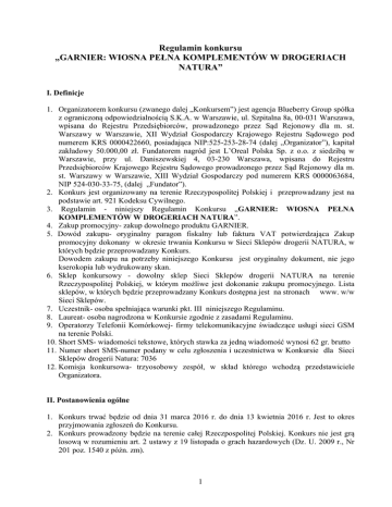 Regulamin konkursu „GARNIER: WIOSNA PEŁNA KOMPLEMENTÓW W DROGERIACH NATURA” I. Definicje 1. Organizatorem konkursu (zwanego dalej „Konkursem”) jest agencja Blueberry Group spółka z ograniczoną odpowiedzialnością S.K.A. w Warszawie, ul. Szpitalna 8a, 00-031 Warszawa, wpisana do Rejestru Przedsiębiorców, prowadzonego przez Sąd Rejonowy dla m. st. Warszawy w Warszawie, XII Wydział Gospodarczy Krajowego Rejestru Sądowego pod numerem KRS 0000422660, posiadająca NIP:525-253-28-74 (dalej „Organizator”), kapitał zakładowy 50.000,00 zł. Fundatorem nagród jest L’Oreal Polska Sp. z o.o. z siedzibą w Warszawie, przy ul. Daniszewskiej 4, 03-230 Warszawa, wpisana do Rejestru Przedsiębiorców Krajowego Rejestru Sądowego prowadzonego przez Sąd Rejonowy dla m. st. Warszawy w Warszawie, XIII Wydział Gospodarczy pod numerem KRS 0000063684, NIP 524-030-33-75, (dalej „Fundator”). 2. Konkurs jest organizowany na terenie Rzeczypospolitej Polskiej i przeprowadzany jest na podstawie art. 921 Kodeksu Cywilnego. 3. Regulamin - niniejszy Regulamin Konkursu „GARNIER: WIOSNA PEŁNA KOMPLEMENTÓW W DROGERIACH NATURA”. 4. Zakup promocyjny- zakup dowolnego produktu GARNIER. 5. Dowód zakupu- oryginalny paragon fiskalny lub faktura VAT potwierdzająca Zakup promocyjny dokonany w okresie trwania Konkursu w Sieci Sklepów drogerii NATURA, w których będzie przeprowadzany Konkurs. Dowodem zakupu na potrzeby niniejszego Konkursu jest oryginalny dokument, nie jego kserokopia lub wydrukowany skan. 6. Sklep konkursowy - dowolny sklep Sieci Sklepów drogerii NATURA na terenie Rzeczypospolitej Polskiej, w którym możliwe jest dokonanie zakupu promocyjnego. Lista sklepów, w których będzie przeprowadzany Konkurs dostępna jest na stronach www. w/w Sieci Sklepów. 7. Uczestnik- osoba spełniająca warunki pkt. III niniejszego Regulaminu. 8. Laureat- osoba nagrodzona w Konkursie zgodnie z zasadami Regulaminu. 9. Operatorzy Telefonii Komórkowej- firmy telekomunikacyjne świadczące usługi sieci GSM na terenie Polski. 10. Short SMS- wiadomości tekstowe, których stawka za jedną wiadomość wynosi 62 gr. brutto 11. Numer short SMS-numer podany w celu zgłoszenia i uczestnictwa w Konkursie dla Sieci Sklepów drogerii Natura: 7036 12. Komisja konkursowa- trzyosobowy zespół, w skład którego wchodzą przedstawiciele Organizatora. II. Postanowienia ogólne 1. Konkurs trwać będzie od dnia 31 marca 2016 r. do dnia 13 kwietnia 2016 r. Jest to okres przyjmowania zgłoszeń do Konkursu. 2. Konkurs prowadzony będzie na terenie całej Rzeczpospolitej Polskiej. Konkurs nie jest grą losową w rozumieniu art. 2 ustawy z 19 listopada o grach hazardowych (Dz. U. 2009 r., Nr 201 poz. 1540 z póżn. zm). 1 III. Warunki uczestnictwa w Konkursie 1 2 3. 4. 5. 6. Uczestnikiem Konkursu może być każda pełnoletnia, posiadająca pełną zdolność do czynności prawnych osoba fizyczna, będąca konsumentem w rozumieniu art. 221 Kodeksu cywilnego. Warunkiem przystąpienia do Konkursu jest posiadanie aktywnego telefonu komórkowego w sieci GSM jednego z polskich operatorów, działających na terytorium Polski. Zgłoszenie udziału w Konkursie odbywa się dokładnie w sposób wskazany w Regulaminie. Niespełnienie któregokolwiek z warunków zgłoszenia udziału będzie skutkowało unieważnieniem zgłoszenia. W Konkursie nie mogą brać udziału pracownicy Organizatora, Fundatora zlecającego przeprowadzenie Konkursu, sklepów konkursowych, osoby współpracujące z Organizatorem bezpośrednio na podstawie umów cywilnoprawnych, oraz członkowie ich rodzin. Przez członków rodziny rozumie się: wstępnych, zstępnych, rodzeństwo, małżonków, rodziców małżonków i osoby pozostające w stosunku przysposobienia. Uczestnik przed wzięciem udziału w Konkursie zobowiązany jest zapoznać się z Regulaminem. Uczestnik biorąc udział w Konkursie oświadcza, iż zapoznał się z Regulaminem i akceptuje Regulamin. IV. Zasady udziału w Konkursie 1. Zgłoszenia do Konkursu mogą być wysyłane codziennie w okresie od godziny 00:00:00 dnia 31 marca 2016 r. do godziny 23:59:59 dnia 13 kwietnia 2016 r. wyłącznie po dokonaniu zakupu promocyjnego. 2. Warunkiem uczestnictwa w Konkursie jest zastosowanie się do następującej procedury: - dokonanie Zakupu promocyjnego w trakcie trwania Konkursu (od 31 marca 2016 do 13 kwietnia 2016) w Sieci Sklepów drogerii NATURA, w których jest przeprowadzany Konkurs i zachowanie oryginalnego dowodu zakupu; - wysłanie SMS-a zawierającego prefiks GARNIER3. oraz odpowiedź na pytanie: Jak kosmetyki Garnier pomagają Ci dbać o siebie? pod numer 7036 3. Treść SMS-a nie może przekroczyć 160 znaków ze spacjami. Treść nie może zawierać polskich znaków. 4. Zgłoszenie udziału w Konkursie na podstawie zakupu promocyjnego może mieć miejsce wyłącznie po dokonaniu tego zakupu, tj. chwila zakupu (data i godzina uwidoczniona na dowodzie zakupu) musi być wcześniejsza, niż chwila wysłania wiadomości SMS. 5. W przypadku utraty lub zniszczenia oryginału dowodu Zakupu konkursowego Uczestnikowi nie przysługują żadne roszczenia wobec Organizatora. 6. Uczestnik może wysłać wiele zgłoszeń konkursowych , przy czym każde zgłoszenie winno być udokumentowane odrębnym, oryginalnym dowodem zakupu produktu GARNIER oraz oddzielnym zgłoszeniem SMS. W przypadku braku odpowiedniego dowodu zakupu w miejsce wykluczonego Uczestnika, nagrody przechodzą do dyspozycji organizatora. 7. Odpowiedź na pytanie konkursowe stworzona przez Uczestnika powinna być efektem jego własnej twórczości, nie może naruszać praw osób trzecich w tym w szczególności praw autorskich. 2 V. Nagrody i sposób ich przyznawania 1. W Konkursie zostaną przyznane w kolejności oceny zgłoszeń przez komisję konkursową: 10 (dziesięć) nagród I Stopnia, 30 (trzydzieści) nagród II Stopnia i 50 (pięćdziesiąt) nagród III stopnia przy czym: a) Dziesięć (10) nagród rzeczowych I stopni