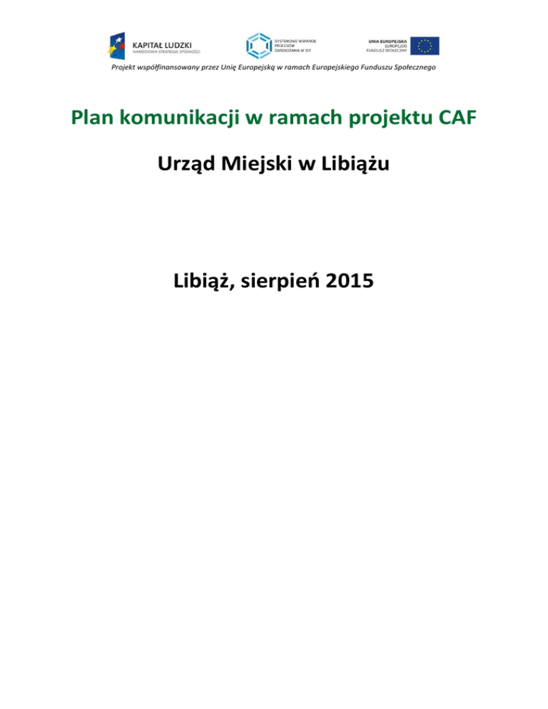 Projekt współfinansowany przez Unię Europejską w ramach Europejskiego Funduszu Społecznego Plan komunikacji w ramach projektu CAF Urząd Miejski w Libiążu Libiąż, sierpień 2015 WPROWADZENIE Celem niniejszego dokumentu jest określenie planu komunikacji dla projektu wdrożenia metody CAF w Urzędzie Miejskim w Libiążu (woj. Małopolskie). W szczególności w dokumencie określone zostaną: cele projektu wdrożenia metody CAF, strony zainteresowane projektem oraz ich potrzeby komunikacyjne, sposób, forma i częstotliwość informacji na temat realizowanego projektu przekazywanych poszczególnym grupom odbiorców, 1. Projekt wdrożenia metody CAF w Urzędzie Wspólna Metoda Oceny – CAF (ang. Common Assessment Framework) jest narzędziem przeznaczonym dla jednostek administracji publicznej, mającym na celu poprawę zarządzania. Model skupia się przeprowadzeniu samooceny, identyfikacji obszarów doskonalenia oraz wprowadzaniu wymaganych usprawnień zarządczych. Metoda samooceny proponowana w ramach CAF opiera się na założeniu, że doskonałe wyniki organizacji osiągane są poprzez przywództwo ukierunkowane na strategię i planowanie, pracowników, partnerstwo, zasoby i procesy. Dzięki CAF organizacje wyrażające chęć wdrożenia systematycznego procesu doskonalenia swoich działań uzyskują proste, przystosowane do specyfiki sektora administracji publicznej, narzędzie samooceny. Samoocena oparta o model CAF dostarcza informacji będących podstawą do doskonalenia funkcjonowania urzędu, poprzez: identyfikację mocnych stron, identyfikację obszarów do doskonalenia, opracowanie i wdrożenie zbioru dobrych praktyk, możliwość porównania wyników z innymi jednostkami administracji publicznej z terenu Polski oraz innych państw członkowskich Unii Europejskiej (benchmarking), przygotowanie urzędu do aplikowania o nagrody jakości. Podstawowe cele krótkoterminowe związane z projektem samooceny CAF to: uzyskanie w wyniku samooceny informacji o stanie różnych elementów systemu zarządzania oraz wynikach organizacji, identyfikacja obszarów doskonalenia, określenie i wdrożenie działań doskonalących służących poprawie systemu zarządzania, uzyskanie przez pracowników urzędu wiedzy i umiejętności związanych z procesem samooceny CAF. Podstawowe cele długoterminowe związane z projektem samooceny CAF to: poprawa usług publicznych dostarczanych przez urząd w wyniku wdrożenia działań doskonalących, usprawnienie systemu zarządzania w urzędzie w zakresie przywództwa, planowania, zarządzania pracownikami, procesami i zasobami oraz rozwoju relacji partnerskich, 2 poprawa zarządzania wynikami organizacji przez określenie oraz realizowanie celów i wskaźników wyników w zakresie wyników kluczowych oraz relacjach z klientami, pracownikami i społeczeństwem, budowa wizerunku urzędu jako profesjonalnej i doskonalącej się organizacji wykonującej działania na rzecz wspólnoty samorządowej. 2. Plan komunikacji wdrożenia metody CAF w Urzędzie Uwaga ogólna: plan komunikacji powinien opisywać zarówno komunikację pomiędzy bezpośrednimi uczestnikami projektu wdrożenia metody CAF w Urzędzie (w szczególności: kierownictwo Urzędu, Koordynator ds. CAF, członkowie grup samooceny, członkowie zespołów wdrażających projekty usprawnień), jak również pomiędzy uczestnikami projektu a jego otoczeniem (pozostali pracownicy Urzędu, społeczeństwo itp.). W przypadku opisywania sposobu komunikacji (potrzeby informacyjne, częstotliwość komunikowania się, metody komunikacji) pomiędzy uczestnikami projektu, uwzględnić należy działania realizowane w ramach kolejnych kroków wdrażania CAF (w tym np. opracowywane dokumenty nt. projektu, sprawozdania z samooceny i planu doskonalenia itp.). 2.1. Zainteresowane strony W poniższej tabeli przedstawieni zostali wszyscy interesariusze projektu (adresaci działań, dostawcy informacji). Wyodrębnienia grup dokonano w związku ze zróżnicowaniem działań komunikacyjnych i narzędzi, jakie będą wobec nich stosowane. Określono również zakres potrzeb informacyjnych każdej z grup w postaci przypisania im realizowanych wobec nich celów komunikacyjnych projektu (określających potrzeby informacyjne). Zainteresowani projektem Potrzeby informacyjne 1. Wewnętrzni partnerzy Kierownictwo 1,2,3,4,5 Koordynator projektu 1,2,3,4 Grupa samooceny 1,3,4,5 Wszyscy pracownicy 1,2,3,4,5 Zewnętrzni partnerzy Konsultant z ramienia MSAP w Krakowie Ministerstwo Cyfryzacji Administracji Potrzeby informacyjne szczegółowe cele komunikacji i Opinia publiczna, w szczególności petenci Urzędu Miejskiego w Libiążu, 2,4,5 – Informowanie o celach i zasadach CAF 2. Informowanie o przebiegu realizacji CAF w urzędzie, w tym poszczególnych etapów projektu 3. Mobilizacja do udziału aktywnego 4. Zapewnienie właściwego obiegu informacji – efektywności wdrażania 2,5 1,2,5 5. Budowanie wizerunku Urzędu Miejskiego w Libiążu jako urzędu doskonalącego się. 3 organizacje pozarządowe, mśp, media 2.2. Potrzeby informacyjne i oczekiwane korzyści Zainteresowana strona Kierownictwo Urzędu Samorządowy Zespół ds. CAF Wszyscy pracownicy Urzędu Klienci Urzędu i media lokalne Organizacje pozarządowe organizacyjne gminy i inne Oczekiwane korzyści Informacja o celach, przebiegu i wynikach samooceny CAF dla Urzędu Informacja o wynikach wdrażania działań doskonalących Informacja o działaniach podejmowanych w ramach projektu, ich harmonogramie i zakresach odpowiedzialności Mobilizacja do aktywnego udziału i zaangażowania w działania projektu Informacja o szczegółowych planach realizacji usprawnień Mobilizacja do aktywnego udziału i zaangażowania w działania doskonalące Informacja o zasadach i korzyściach samooceny CAF Zapewnienie współpracy z Zespołem ds. CAF dla zapewnienia kompletności dowodów w procesie samooceny Informacja o wynikach realizacji działań doskonalących Budowa wize