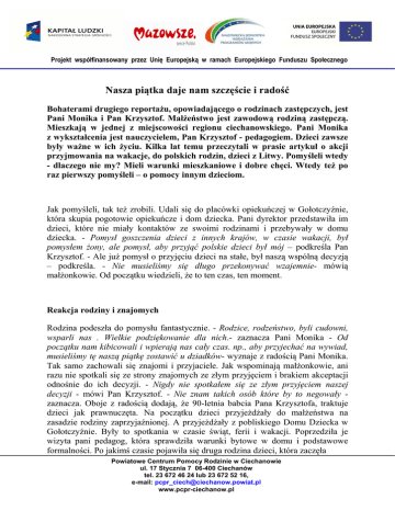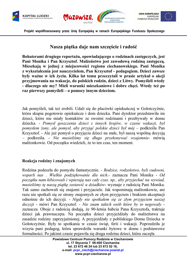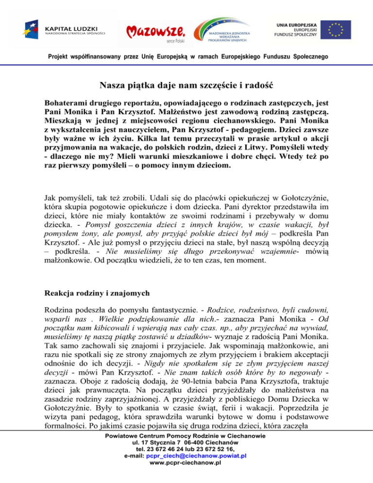 Projekt współfinansowany przez Unię Europejską w ramach Europejskiego Funduszu Społecznego Nasza piątka daje nam szczęście i radość Bohaterami drugiego reportażu, opowiadającego o rodzinach zastępczych, jest Pani Monika i Pan Krzysztof. Małżeństwo jest zawodową rodziną zastępczą. Mieszkają w jednej z miejscowości regionu ciechanowskiego. Pani Monika z wykształcenia jest nauczycielem, Pan Krzysztof - pedagogiem. Dzieci zawsze były ważne w ich życiu. Kilka lat temu przeczytali w prasie artykuł o akcji przyjmowania na wakacje, do polskich rodzin, dzieci z Litwy. Pomyśleli wtedy - dlaczego nie my? Mieli warunki mieszkaniowe i dobre chęci. Wtedy też po raz pierwszy pomyśleli – o pomocy innym dzieciom. Jak pomyśleli, tak też zrobili. Udali się do placówki opiekuńczej w Gołotczyźnie, która skupia pogotowie opiekuńcze i dom dziecka. Pani dyrektor przedstawiła im dzieci, które nie miały kontaktów ze swoimi rodzinami i przebywały w domu dziecka. - Pomysł goszczenia dzieci z innych krajów, w czasie wakacji, był pomysłem żony, ale pomysł, aby przyjąć polskie dzieci był mój – podkreśla Pan Krzysztof. - Ale już pomysł o przyjęciu dzieci na stałe, był naszą wspólną decyzją – podkreśla. - Nie musieliśmy się długo przekonywać wzajemnie- mówią małżonkowie. Od początku wiedzieli, że to ten czas, ten moment. Reakcja rodziny i znajomych Rodzina podeszła do pomysłu fantastycznie. - Rodzice, rodzeństwo, byli cudowni, wsparli nas . Wielkie podziękowanie dla nich.- zaznacza Pani Monika - Od początku nam kibicowali i wpierają nas cały czas. np., aby przyjechać na wywiad, musieliśmy tę naszą piątkę zostawić u dziadków- wyznaje z radością Pani Monika. Tak samo zachowali się znajomi i przyjaciele. Jak wspominają małżonkowie, ani razu nie spotkali się ze strony znajomych ze złym przyjęciem i brakiem akceptacji odnośnie do ich decyzji. - Nigdy nie spotkałem się ze złym przyjęciem naszej decyzji - mówi Pan Krzysztof. - Nie znam takich osób które by to negowały zaznacza. Oboje z radością dodają, że 90-letnia babcia Pana Krzysztofa, traktuje dzieci jak prawnuczęta. Na początku dzieci przyjeżdżały do małżeństwa na zasadzie rodziny zaprzyjaźnionej. A przyjeżdżały z pobliskiego Domu Dziecka w Gołotczyźnie. Były to spotkania w czasie świąt, ferii i wakacji. Poprzedziła je wizyta pani pedagog, która sprawdziła warunki bytowe w domu i podstawowe formalności. Po jakimś czasie pojawiła się druga rodzina dzieci, która zaczęła Powiatowe Centrum Pomocy Rodzinie w Ciechanowie ul. 17 Stycznia 7 06-400 Ciechanów tel. 23 672 46 24 lub 23 672 52 16, e-mail: [email protected] www.pcpr-ciechanow.pl Projekt współfinansowany przez Unię Europejską w ramach Europejskiego Funduszu Społecznego przyjeżdżać na wakacje. W tym czasie rodziła się decyzja, żeby wziąć dzieci na stałe. Był to czas wzajemnego poznawania się, wdrażania się. Po którejś, kolejnej wizycie dzieci, małżeństwo uznało, że to jest ten moment i zapragnęło, aby zaopiekować się dziećmi na stałe. Dla nich rodzina zastępcza, to nie teoria, to mama i tata, to dom. Wiele razy podkreślają, że są najzwyklejszą rodziną na świecie, tyle, że wielodzietną. Wyróżniają się ilością dzieci, ale nie sposobem życia zwykłych rodzin. Jak zostać rodziną zastępczą? Zdaniem naszych bohaterów, recepta jest jedna. - Trzeba mocno chcieć - mówią zgodnym chórem. - Trzeba mocno chcieć i wiedzieć , co się robi, bo dzieci się później nie oddaje - dodają. Ich zdaniem, dużą podporą są rozmowy z pracownikami Powiatowego Centrum Pomocy Rodzinie w Ciechanowie, którzy bardzo wspierają kandydatów na rodziców zastępczych. Tak samo Ośrodek Adopcyjny, którego pracownicy służą pomocą i wsparciem. Wiedzą i mówią kandydatom od czego zacząć, co zrobić, żeby plany wcielić w życie. Zasady tworzenia rodziny zastępczej są z góry ustalone przez przepisy. Kiedy przyszli rodzice zgłoszą akces zawiązania rodziny , biorą udział w szkoleniu na temat aspektów prawnych, wychowawczych i psychologicznych założenia rodziny. A także na temat problemów, jakie mogą się pojawić. Dzieci są z różnych środowisk, trzeba więc wiele spraw i sytuacji umieć przewidzieć. Do tego rodzina musi być zbadana pod względem zdrowotnym i karalności. Warunkiem musi też być praca zawodowa jednego z rodziców, nie mogą to być osoby bezrobotne. Formalności trochę trwają, ale zdaniem naszych bohaterów, nie są przeszkodą w realizacji planów. - Mitem jest opinia, że szkolenie dla rodzin zastępczych jest takie trudne. Owszem jest wywiad środowiskowy, wizyty pracowników z opieki społecznej, kuratora sądowego – wymieniają obecni rodzice. Ale ich zdaniem jest to zrozumiałe, bo ma służyć poznaniu rodziny, która będzie wychowywać dzieci. Zdaniem rodziców jest to jak najbardziej zasadne, bo trzeba uczciwie podejść do zagadnienia. Powiatowe Centrum Pomocy Rodzinie w Ciechanowie ul. 17 Stycznia 7 06-400 Ciechanów tel. 23 672 46 24 lub 23 672 52 16, e-mail: [email protected] www.pcpr-ciechanow.pl Projekt współfinansowany przez Unię Europejską w ramach Europejskiego Funduszu Społecznego Formalności załatwione! Pierwszym dzieckiem w domu Pani Moniki i Pana Krzysztofa, była dwuletnia dziewczynka. Wcześniej mała, na czas wyjaśnienia sytuacji prawnej, przebywała w pogotowiu rodzinnym. Na szczęście takie pogotowie istnieje w powiecie ciechanowskim (tworzy je rodzina, o której opowiemy w jednym z kolejnych reportaży). - Trochę dziewczynkę znaliśmy, odwiedzaliśmy ją. Wcześniej, ale niepokój był duży, jak nam pójdzie – wspomina ten czas Pani Monika. Największym stresem była dla niej obawa, czy będzie ją umiała utulić do snu. Teraz po latach wie, że matka natura potrafi zrobić cuda. - Ten instynkt rodziców budzi się natychmiast. Trochę pomogła intuicja, troch
