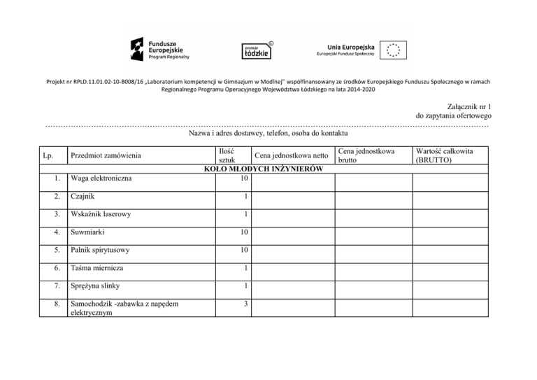 Projekt nr RPLD.11.01.02-10-B008/16 „Laboratorium kompetencji w Gimnazjum w Modlnej” współfinansowany ze środków Europejskiego Funduszu Społecznego w ramach Regionalnego Programu Operacyjnego Województwa Łódzkiego na lata 2014-2020 Załącznik nr 1 do zapytania ofertowego ………………………………………………………………………………………………………………………………………………………… Nazwa i adres dostawcy, telefon, osoba do kontaktu Lp. Przedmiot zamówienia Ilość Cena jednostkowa netto sztuk KOŁO MŁODYCH INŻYNIERÓW 10 1. Waga elektroniczna 2. Czajnik 1 3. Wskaźnik laserowy 1 4. Suwmiarki 10 5. Palnik spirytusowy 10 6. Taśma miernicza 1 7. Sprężyna slinky 1 8. Samochodzik -zabawka z napędem elektrycznym 3 Cena jednostkowa brutto Wartość całkowita (BRUTTO) Projekt nr RPLD.11.01.02-10-B008/16 „Laboratorium kompetencji w Gimnazjum w Modlnej” współfinansowany ze środków Europejskiego Funduszu Społecznego w ramach Regionalnego Programu Operacyjnego Województwa Łódzkiego na lata 2014-2020 9. Siłomierz komplet 6 szt. 5 10. Zasilacz laboratoryjny prądu stałego 15V max 3A DC 362510 11. Miernik uniwersalny 5 12. Izolowane przewody- Przewód z końcówką bananową 30 13. Oporniki (opornica suwakowa 0-20 Ohm/ 2A) 14. Żarówki z oprawka 5 15. Sprężyny 3 16. Ciężarki obciążniki 50 g 3 17. Soczewki 5 18. Igła magnetyczna 03-631 19. Rurka do demostracji zjawiska konwekcji 03155 20. Magnesy sztabkowy i podkowa komplet 21. Statywy 02-100-1 5 5 5 10 5 10 1 Projekt nr RPLD.11.01.02-10-B008/16 „Laboratorium kompetencji w Gimnazjum w Modlnej” współfinansowany ze środków Europejskiego Funduszu Społecznego w ramach Regionalnego Programu Operacyjnego Województwa Łódzkiego na lata 2014-2020 22. Zasilacz laboratoryjny prądu stałego i zmiennego 24V 10A 55267 23. Maszyna elektrostatyczna 24. Mikroskop z podłączeniem do komputera BioLight 300 z kamerą Delta Optical DLTCam Basic 2 MP 25. Mikroskopy optyczne (szkolne, stereoskopowe) Mikroskop stereoskopowy Delta Optical Discovery 40 26. Waga laboratoryjna 03-710 1 1 KÓŁO MŁODYCH BIOLOGÓW 1 1 1 27. Model szkieletu człowieka 01-605 1 28. Model budowy anatomicznej człowieka 1/2 wymiaru naturalnego zamknięty z tyłu 01607 29. Fartuchy laboratoryjne 1 30. Apteczka z wyposażeniem, 31. Tacki, deski do krojenia 30 1 15 Projekt nr RPLD.11.01.02-10-B008/16 „Laboratorium kompetencji w Gimnazjum w Modlnej” współfinansowany ze środków Europejskiego Funduszu Społecznego w ramach Regionalnego Programu Operacyjnego Województwa Łódzkiego na lata 2014-2020 32. Okulary ochronne 33. Rękawiczki lateksowe/ winylowe (100 szt.) 30 3 34. Łyżeczki (5) i kubki jednorazowe (5) (po 100 szt.) 35. Mikroskopy terenowe Biolight 300 10 36. Skalpele 10 37. Nożyczki 5 38. Lornetka Delta Optical Voyager II 20x50 1 39. Lupy 2 10 40. Stopery 5 41. Ciśnieniomierz 1 42. Szkiełka przykrywkowe 10 43. Szkiełka podstawowe komplet 10 44. Zlewki różnej wielkości komplet 5 szt. 5 Projekt nr RPLD.11.01.02-10-B008/16 „Laboratorium kompetencji w Gimnazjum w Modlnej” współfinansowany ze środków Europejskiego Funduszu Społecznego w ramach Regionalnego Programu Operacyjnego Województwa Łódzkiego na lata 2014-2020 45. Kolby stożkowe 10 46. Rurki szklane gięte 02-013 10 47. Cylindry miarowe 10 48. Szalki Petriego 10 49. Probówki 20 szt. z statywem 3 50. Drewniane uchwyty do probówek 02-017 i 02-009 51. Pipety Pasteura i pipety miarowe 5 52. Bagietki do mieszania 53. Termometry laboratoryjne 02-610 5 10 5 54. Igły preparacyjne 10 55. Pęsety krótkie 10 56. Pęsety długie 10 Projekt nr RPLD.11.01.02-10-B008/16 „Laboratorium kompetencji w Gimnazjum w Modlnej” współfinansowany ze środków Europejskiego Funduszu Społecznego w ramach Regionalnego Programu Operacyjnego Województwa Łódzkiego na lata 2014-2020 57. Folie spożywcze „oddychające” 5 58. Folie spożywcze „nieoddychające” 5 59. Ocet spirytusowy (1 litr) 10 60. Skrobia /mąka ziemniaczana (1 kg) 2 61. Glukoza 2 62. Sacharoza/cukier (1 kg) 10 63. Sól kuchenna (1 kg) 10 64. Woda destylowana 10 65. Jodyna/ roztwór jodu w jodku potasu 10 66. Szczotki laboratoryjne małe 5 67. Szczotki laboratoryjne duże 5 68. Przewodniki roślin 2 69. Proste klucze do oznaczania roślin 2 Projekt nr RPLD.11.01.02-10-B008/16 „Laboratorium kompetencji w Gimnazjum w Modlnej” współfinansowany ze środków Europejskiego Funduszu Społecznego w ramach Regionalnego Programu Operacyjnego Województwa Łódzkiego na lata 2014-2020 70. Przewodniki zwierząt 2 71. Preparaty mikroskopowe (tkanki roślinne, tkanki zwierzęce, organy wegetatywne roślin, organy generatywne roślin, grzyby, bezkręgowce) Preparaty zestaw 100 szt. 72. Modele serca ( 1 na 3 osoby) 01-611 1 73. Model skóry człowieka 01-618 1 9 KOŁO MŁODYCH CHEMIKÓW 74. Szafa na oddczynniki metalowa z odciągiem 1 75. Waga metalowa z dokładnością do 0,1 g (do 1 kg) 76. Czasza grzejna 1 77. Układ okresowy plansza 160x120 cm 1 78. Sprzęt przeciwpożarowy - gaśnica 1 79. Tace laboratoryjne 5 80. Płytki ceramiczne izolacyjne 2 1 Projekt nr RPLD.11.01.02-10-B008/16 „Laboratorium kompetencji w Gimnazjum w Modlnej” współfinansowany ze środków Europejskiego Funduszu Społecznego w ramach Regionalnego Programu Operacyjnego Województwa Łódzkiego na lata 2014-2020 81. Butla do wody destylowanej 20l 1 82. Butelki do roztworów z doszlifowanym korkiem 5 szt 83. Palnik spritusowy z nakładką szklaną 4 84. Palniki gazowe typu turystycznego - Palnik Bunsena na kartusze nabijane 85. Probówki kpl 500 szt. 5 86. Pipety dla nauczyciela. Plastikowa pipeta Pasteura z znacznikiem 3,0ml op=500szt 87. Rękawiczki lateksowe (100 szt.) 1 88. Szczypce metalowe 5 89. Podnośniki 02-617 5 5 2 5 90. Pipeta miarowa 10 91. Bagietki 10 92. Szkiełka laboratoryjne 60 Projekt nr RPLD.11.01.02-10-B008/16 „Laboratorium kompetencji w Gimnazjum w Modln