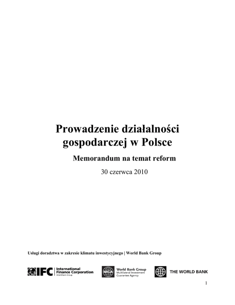 Prowadzenie działalności gospodarczej w Polsce Memorandum na temat reform 30 czerwca 2010 Usługi doradztwa w zakresie klimatu inwestycyjnego World Bank Group 1 Finansowanie z FIAS, wielostronne usługi doradcze w zakresie klimatu inwestycyjnego Prowadzenie działalności w Polsce: Notatka na temat reform Dobre regulacje prawne są czynnikiem istotnym dla wzrostu, tworzenia miejsc pracy i zwalczania ubóstwa. Raport Doing Business (Prowadzenie działalności) ocenia regulacje zachęcające doprowadzenia działalności biznesowej lub ograniczające ją w 10 kluczowych obszarach lub inaczej „wskaźnikach” (Rozpoczynanie działalności, Uzyskiwanie pozwoleń na budowę, Zatrudnianie pracowników, Rejestrowanie majątku, Uzyskiwanie kredytów, Ochrona inwestorów, Podatki, Handel zagraniczny, Zawieranie umów i Likwidacja przedsiębiorstwa) w 183 gospodarkach z całego świata.1 Wyższa pozycja w ogólnym indeksie łatwości prowadzenia działalności zawartym w Raporcie odpowiada bardziej przyjaznemu dla przedsiębiorców środowisku regulacyjnemu. W raporcie Doing Business 2010 Polska uplasowała się na 72. miejscu spośród 183 krajów;2 jest to ta sama pozycja co w zeszłym roku.3 Polska znalazła się na liście za wieloma swoimi sąsiadami: Niemcami (25), Litwą (26), Słowacją (42) i Białorusią (58). Wyżej uplasowały się również kraje takie jak Irlandia (7), Słowenia (53) i Hiszpania (62). Polska wyprzedza natomiast Czechy (74), Grecję (109), Federację Rosyjską (120) oraz Ukrainę (142). Wyniki Polski w zakresie różnych wskaźników są niejednorodne. Zdobyła na przykład 15. miejsce jeśli chodzi o łatwość uzyskiwania kredytów, ale dopiero 163. jeśli chodzi o łatwość uzyskiwania pozwoleń na budowę. W ostatnim czasie Polska zyskała dzięki wprowadzeniu znaczących reform w zakresie Zamykania działalności 4 oraz poprawie w obszarze dostępności kredytów w wyniku umożliwienia wszelkim osobom prawnym (włączając podmioty zagraniczne) utrzymywania lub przyznawania zabezpieczeń. W Tabeli 1 podano pozycję Polski w zakresie wszystkich wskaźników Doing Business. Niniejszy dokument zawiera zalecenia dotyczące reform w pięciu obszarach, w których Polska plasuje się na niskiej pozycji. Są to: Rozpoczynanie działalności, Uzyskiwanie pozwoleń na budowę, Rejestrowanie majątku, Podatki i Ochrona inwestorów. W Tabeli 2 przedstawiono podsumowanie tych zaleceń, opisanych bardziej szczegółowo na dalszych stronach niniejszego dokumentu. Wszystkie zalecenia zostały dopracowane i dostosowane przez zespół Doradztwa ws. Reform w zakresie Prowadzenia Działalności (Doing Business Reform Advisory, DBRA) po wizycie w kraju w czerwcu 2010 roku. Zalecenia te są oparte na analizie porównawczej najlepszych praktyk w zakresie regulacji klimatu inwestycyjnego, wskazanych w raporcie Doing Business. Prośby o dodatkowe przykłady najlepszych praktyk można składać do zespołu DBRA. Poprawa pozycji w rankingach jest trudna do przewidzenia zarówno dla Polski, jak i innych krajów. Zamiast dążenia do poprawy konkretnych pozycji w rankingu, zalecamy położenie nacisku na wdrażanie kluczowych reform mających na celu zwiększenie łatwości prowadzenia działalności. Skoordynowane 1 Metodologia Doing Business ma swoje ograniczenia. Inne obszary ważne dla biznesu, takie jak bliskość dużych rynków, jakość usług infrastruktury (innych niż te związane z handlem zagranicznym), bezpieczeństwo majątku przed kradzieżą i plądrowaniem, przejrzystość podczas prowadzenia zamówień publicznych, warunki makroekonomiczne czy siła instytucji – nie są bezpośrednio mierzone w raporcie Prowadzenie Działalności. 2 Ranking łatwości prowadzenia działalności to prosta średnia pozycji kraju w każdej z 10 dziedzin ujętych w raporcie Doing Business. 3 W raporcie Doing Business 2010 dodano dwa kraje, które nie były uwzględnione w raporcie Doing Business 2009: Cypr i Kosowo. 4 Jeśli chodzi o wskaźnik Zamykanie działalności, Polska wprowadziło nowe prawo dotyczące bankructwa, określające ściślejsze wymogi profesjonalne dla zarządców majątku oraz ograniczające wynagrodzenie syndyka do maksymalnie 3% wartości masy upadłościowej (zmniejszenie z poziomu maksymalnie 5%). 2 reformy z pewnością znajdą swoje odzwierciedlenie we wskaźnikach Doing Business, a co ważniejsze, zapewnią lepsze środowisko biznesowe, bardziej sprzyjające wzrostowi ekonomicznemu. Wszelkie reformy realizowane przez Polskę winny być monitorowane, a informacje o nich powinny być przekazywane w odpowiednie miejsca. Monitorowanie wpływu reform pozwoli uwypuklić zarówno obszary, w których udało się uzyskać poprawę, jak również te wymagające dalszych starań. Jednocześnie, efektywne przekazywanie informacji dotyczących reform jednostkom wdrażającym, środowisku biznesowemu i prawniczemu oraz opinii publicznej pozwoli zapewnić, że zmiany będą akceptowane i stosowane w praktyce. Efektywna komunikacja przekazuje również opinii publicznej informację, że polski rząd podejmuje poważne kroki w celu zwiększenia konkurencyjności kraju. To z kolei może zmienić sposób postrzegania Polski przez inwestorów oraz zachęcić do inwestycji i tworzenia nowych miejsc pracy – zarówno z wewnątrz, jak i spoza kraju. 3 Tabela 1. Wyniki Polski w zakresie wskaźników Doing Business Wskaźnik Rozpoczynanie działalności Stanowisko Procedury (liczba) Czas (dni) Koszt (% dochodu per capita) Min. kapitał (% dochodu per capita) Uzyskiwanie pozwoleń na budowę Stanowisko Procedury (liczba) Czas (dni) Koszt (% dochodu per capita) Zatrudnianie pracowników Stanowisko Wskaźnik trudności zatrudnienia Wskaźnik sztywności godzin Wskaźnik trudności zwolnienia Wskaźnik sztywności zatrudnienia Koszty zwolnienia (tygodniowe pensje) Rejestrowanie majątku Stanowisko Procedury (liczba) Czas (dni) Koszt (% wartości majątku) Uzyskiwanie kredytu Stanowisko 