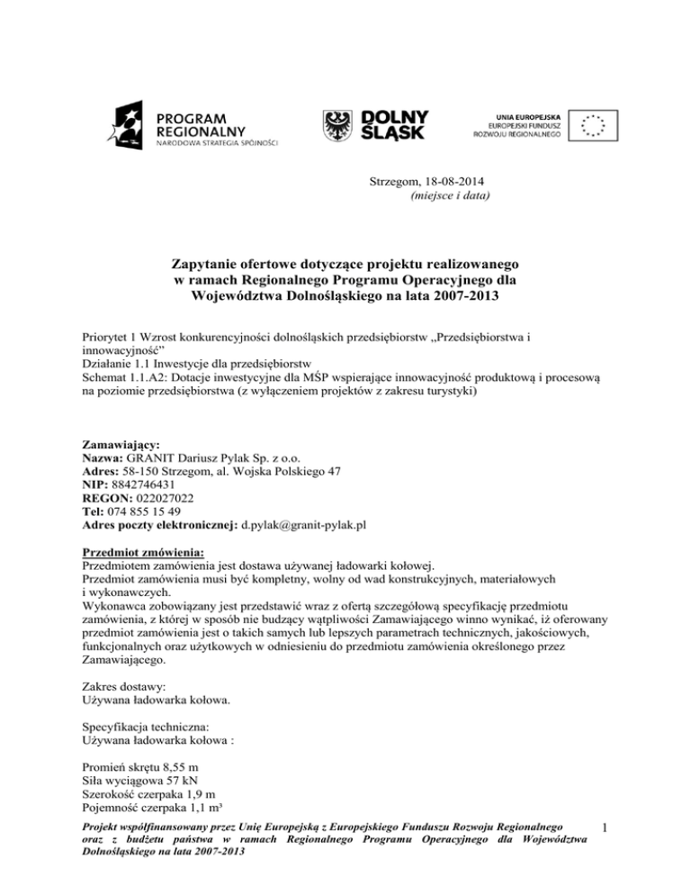 Strzegom, 18-08-2014 (miejsce i data) Zapytanie ofertowe dotyczące projektu realizowanego w ramach Regionalnego Programu Operacyjnego dla Województwa Dolnośląskiego na lata 2007-2013 Priorytet 1 Wzrost konkurencyjności dolnośląskich przedsiębiorstw „Przedsiębiorstwa i innowacyjność” Działanie 1.1 Inwestycje dla przedsiębiorstw Schemat 1.1.A2: Dotacje inwestycyjne dla MŚP wspierające innowacyjność produktową i procesową na poziomie przedsiębiorstwa (z wyłączeniem projektów z zakresu turystyki) Zamawiający: Nazwa: GRANIT Dariusz Pylak Sp. z o.o. Adres: 58-150 Strzegom, al. Wojska Polskiego 47 NIP: 8842746431 REGON: 022027022 Tel: 074 855 15 49 Adres poczty elektronicznej: [email protected] Przedmiot zmówienia: Przedmiotem zamówienia jest dostawa używanej ładowarki kołowej. Przedmiot zamówienia musi być kompletny, wolny od wad konstrukcyjnych, materiałowych i wykonawczych. Wykonawca zobowiązany jest przedstawić wraz z ofertą szczegółową specyfikację przedmiotu zamówienia, z której w sposób nie budzący wątpliwości Zamawiającego winno wynikać, iż oferowany przedmiot zamówienia jest o takich samych lub lepszych parametrach technicznych, jakościowych, funkcjonalnych oraz użytkowych w odniesieniu do przedmiotu zamówienia określonego przez Zamawiającego. Zakres dostawy: Używana ładowarka kołowa. Specyfikacja techniczna: Używana ładowarka kołowa : Promień skrętu 8,55 m Siła wyciągowa 57 kN Szerokość czerpaka 1,9 m Pojemność czerpaka 1,1 m³ Projekt współfinansowany przez Unię Europejską z Europejskiego Funduszu Rozwoju Regionalnego oraz z budżetu państwa w ramach Regionalnego Programu Operacyjnego dla Województwa Dolnośląskiego na lata 2007-2013 1 Prędkość jazdy 30 km/h Moc netto 52 kW Poj. Silnika 3 l Termin i miejsce wykonania zamówienia: Wymagany maksymalny termin realizacji zamówienia: 30-09-2014r. Miejsce realizacji projektu: 58-150 Strzegom, Graniczna 18A Opis kryteriów, którymi Zamawiający będzie się kierował przy wyborze oferty, wraz z podaniem znaczenia tych kryteriów i sposobu oceny ofert.: Wybór najkorzystniejszej oferty nastąpi w oparciu o kryteria: Nazwa kryterium Cena - C Waga kryterium 100 % Cena: Cena netto oferty najtańszej ------------------------------------- x 100 = ilość punktów Cena netto oferty badanej . Cena powinna zawierać wszystkie koszty związane z realizacją zamówienia, w tym koszty dostawy/transportu, instalacji, uruchomienia. Wymagane jest podanie min. ceny netto. Miejsce, sposób i termin składania ofert: Miejsce składania ofert: 58-150 Strzegom, al. Wojska Polskiego 47 Sposób: forma elektroniczna na podany adres e-mail: lub forma papierowa (pocztą, osobiście lub przez kuriera) na adres wskazany powyżej. Termin składania ofert: do dnia 25-08-2014r., godz. 14.00. Ofertę uważa się za złożoną w terminie, gdy dotrze ona do Zamawiającego w taki sposób, że mógł się z ofertą zapoznać. Warunki udziału w postępowaniu: 1. oferta powinna być sporządzona w języku polskim i odpowiadać przedmiotowi zamówienia. 2. zamówienie zostanie udzielone wykonawcy po uprzednim porównaniu i ocenie wszystkich ofert 3. nie dopuszcza się składania ofert częściowych 4. szczegółowych informacji w sprawie udziela: Dariusz Pylak, tel: 693 905 246 Z poważaniem Dariusz Pylak Projekt współfinansowany przez Unię Europejską z Europejskiego Funduszu Rozwoju Regionalnego oraz z budżetu państwa w ramach Regionalnego Programu Operacyjnego dla Województwa Dolnośląskiego na lata 2007-2013 2