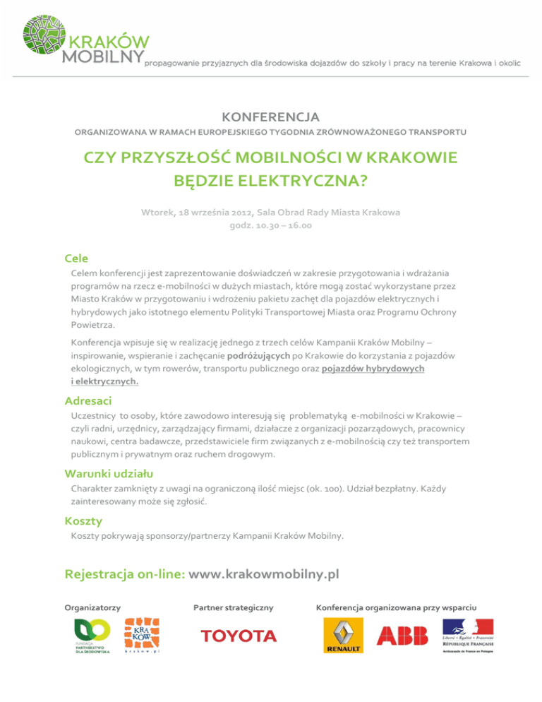 KONFERENCJA ORGANIZOWANA W RAMACH EUROPEJSKIEGO TYGODNIA ZRÓWNOWAŻONEGO TRANSPORTU CZY PRZYSZŁOŚĆ MOBILNOŚCI W KRAKOWIE BĘDZIE ELEKTRYCZNA? Wtorek, 18 września 2012, Sala Obrad Rady Miasta Krakowa godz. 10.30 – 16.00 Cele Celem konferencji jest zaprezentowanie doświadczeń w zakresie przygotowania i wdrażania programów na rzecz e-mobilności w dużych miastach, które mogą zostać wykorzystane przez Miasto Kraków w przygotowaniu i wdrożeniu pakietu zachęt dla pojazdów elektrycznych i hybrydowych jako istotnego elementu Polityki Transportowej Miasta oraz Programu Ochrony Powietrza. Konferencja wpisuje się w realizację jednego z trzech celów Kampanii Kraków Mobilny – inspirowanie, wspieranie i zachęcanie podróżujących po Krakowie do korzystania z pojazdów ekologicznych, w tym rowerów, transportu publicznego oraz pojazdów hybrydowych i elektrycznych. Adresaci Uczestnicy to osoby, które zawodowo interesują się problematyką e-mobilności w Krakowie – czyli radni, urzędnicy, zarządzający firmami, działacze z organizacji pozarządowych, pracownicy naukowi, centra badawcze, przedstawiciele firm związanych z e-mobilnością czy też transportem publicznym i prywatnym oraz ruchem drogowym. Warunki udziału Charakter zamknięty z uwagi na ograniczoną ilość miejsc (ok. 100). Udział bezpłatny. Każdy zainteresowany może się zgłosić. Koszty Koszty pokrywają sponsorzy/partnerzy Kampanii Kraków Mobilny. Rejestracja on-line: www.krakowmobilny.pl Organizatorzy Partner strategiczny Konferencja organizowana przy wsparciu Program 10.30 Rejestracja 11.00 POWITANIE Jacek Majchrowski, Prezydent Miasta Krakowa 11.10 E-MOBILNOŚĆ W KAMPANII KRAKÓW MOBILNY Rafał Serafin, Fundacja Partnerstwo dla Środowiska PANEL 1 – PERSPEKTYWA SEKTORA PUBLICZNEGO (JAKIE SĄ UWARUNKOWANIA ?) 11.15 UWARUNKOWANIA ZINTEGROWANEGO SYSTEMU E-MOBILNOŚCI W POLSCE Ministerstwo Gospodarki 11.30 NARODOWA STRATEGIA ROZWOJU E-MOBILNOŚCI WE FRANCJI Patrick Coroller, Dyrektor Departamentu Transportu i Mobilności, Agencja Środowiska i Zarządzania Energią 11.45 STRATEGIA PROMOCJI E-MOBILNOŚCI W STRASBOURGU Ronan Golias, Dyrektor Departamentu Transportu i Mobilności Miasta Strasbourg 12.00 DYSKUSJA 12.15 Przerwa kawowa PANEL 2 – PERSPEKTYWA SEKTORA NIEPUBLICZNEGO (JAKIE SĄ MOŻLIWOŚCI ?) 12.30 PRZYSZŁOŚĆ POJAZDÓW ELEKTRYCZNYCH I HYBRYDOWYCH Jacek Pawlak, Toyota Motor Poland 12.45 INFRASTRUKTURA ŁADOWANIA POJAZDÓW ELEKTRYCZNYCH - MODA CZY KONIECZNOŚĆ Ekoenergetyka-Zachód s.c. 13.00 E-MOBILNOŚCIOWE TECHNOLOGIE DLA KRAKOWA Centrum Badawcze ABB 13.15 DYSKUSJA 13.30 Lunch 14.15 E-MOBILNOŚĆ W TRANSPORCIE PUBLICZNYM Michał Sierszyński, Solaris Bus & Coach S.A. 14.30 E-MOBILNOŚĆ I OGRANICZENIE ZANIECZYSZCZENIA POWIETRZA – DOŚWIADCZENIA Z RZYMU Renault 14.45 DYSKUSJA PANEL 3 - E-MOBILNOŚĆ W KRAKOWIE (CO ROBIMY W KRAKOWIE ?) 15.00 PROGRAM E-MOBILNOŚCI DLA KRAKOWA NA DZIŚ I NA JUTRO Wiesław Starowicz, Doradca Prezydenta Miasta Krakowa, Politechnika Krakowska 15.15 DYSKUSJA 15.30 PODSUMOWANIE I WNIOSKI 15.45 Poczęstunek IMPREZY TOWARZYSZĄCE (program otwarty) data 17.09 wydarzenie Odyseja Elektryczna Przejazd/happening citroenów elektrycznych na Rynku Głównym koordynacja Joanna Morowiec Kancelaria Prezydenta Krakowa dodatkowe informacje: [FR] http://www.electric-odyssey.com/DP_Odyssee_Electrique.pdf [ENG] http://www.electric-odyssey.com/PP_Electric_Odyssey.pdf 18-22.09 E-mobilność w transporcie publicznym Mariusz Szałkowski MPK w Krakowie Autobus hybrydowy Solaris kursuje na wybranej trasie 20.09 Prezentacja pojazdów elektrycznych/ hybrydowych Autobus hybrydowy, rowery elektryczne oraz inne pojazdy elektryczne i hybrydowe a Małym Rynku (Toyota, Opel, Renault, Solaris i inni) 21.09 Plany Mobilności – Jak poprawić dostępność obiektu i jakość przestrzeni publicznej w jego otoczeniu Warsztaty w Urzędzie Miasta Krakowa na Os. Zgody – wypracowanie program wdrożenia planu mobilności. Małgorzata Stanula Fundacja Partnerstwo dla Środowiska Aleksandra Pacułt Fundacja Partnerstwo dla Środowiska