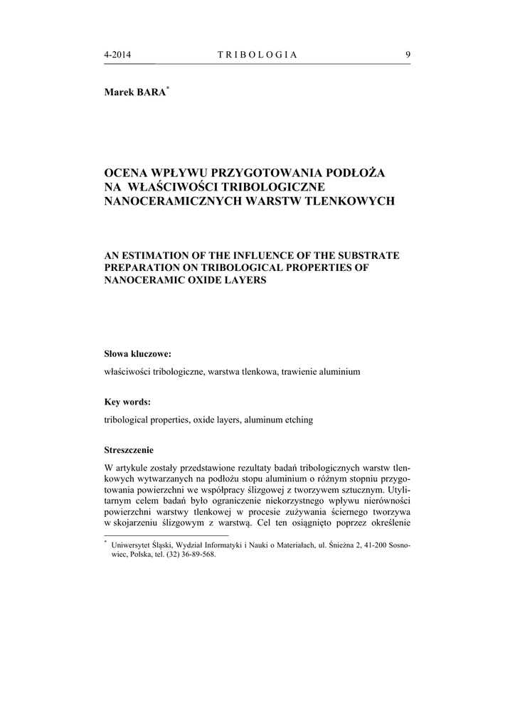 4-2014 TRIBOLOGIA 9 Marek BARA* OCENA WPŁYWU PRZYGOTOWANIA PODŁOŻA NA WŁAŚCIWOŚCI TRIBOLOGICZNE NANOCERAMICZNYCH WARSTW TLENKOWYCH AN ESTIMATION OF THE INFLUENCE OF THE SUBSTRATE PREPARATION ON TRIBOLOGICAL PROPERTIES OF NANOCERAMIC OXIDE LAYERS Słowa kluczowe: właściwości tribologiczne, warstwa tlenkowa, trawienie aluminium Key words: tribological properties, oxide layers, aluminum etching Streszczenie W artykule zostały przedstawione rezultaty badań tribologicznych warstw tlenkowych wytwarzanych na podłożu stopu aluminium o różnym stopniu przygotowania powierzchni we współpracy ślizgowej z tworzywem sztucznym. Utylitarnym celem badań było ograniczenie niekorzystnego wpływu nierówności powierzchni warstwy tlenkowej w procesie zużywania ściernego tworzywa w skojarzeniu ślizgowym z warstwą. Cel ten osiągnięto poprzez określenie * Uniwersytet Śląski, Wydział Informatyki i Nauki o Materiałach, ul. Śnieżna 2, 41-200 Sosnowiec, Polska, tel. (32) 36-89-568. 10 TRIBOLOGIA 4-2014 wpływu przygotowania podłoża na kształtowanie topografii powierzchni oraz właściwości tribologiczne nanoceramicznych warstw tlenkowych. Badania tribologiczne przeprowadzono na stanowisku tarciowo-zużyciowym typu trzpień– –płaszczyzna. Analiza wyników badań tribologicznych została uzupełniona badaniami morfologii powierzchni oraz badaniami stereometrycznymi wykonanymi przed i po teście tribologicznym. Wyniki badań wykazały znaczący wpływ przygotowania podłoża na kształtowanie topografii powierzchni i właściwości tribologiczne warstw powierzchniowych. WPROWADZENIE Proces elektrochemicznego utleniania aluminium i jego stopów należy do najbardziej optymalnych oraz najczęściej stosowanych procesów ochrony powierzchni aluminiowych. Warstwy tlenku aluminium wytwarzane metodami elektrochemicznymi charakteryzują się specyficzną, kolumnową strukturą [L. 1–3] oraz charakterystyczną morfologią powierzchni zależną od parametrów procesu wytwarzania [L. 4–7]. Proces anodowania twardego często stosowany jest celem zwiększania trwałości eksploatacyjnej elementów części maszyn wykonanych ze stopów aluminium, których powierzchnie współpracują z tworzywami sztucznymi w warunkach tarcia technicznie suchego. Najczęściej występującym rodzajem zużycia w takich skojarzeniach jest zużycie ścierne. Bardzo istotne zatem jest zastosowanie w skojarzeniach ślizgowych z tworzywami sztucznymi warstwy tlenkowej o równej powierzchni [L. 8–10]. Powierzchnie stopów aluminium, na którym wytwarza się warstwy tlenkowe są zwykle wstępnie trawione w różnych roztworach kwasów i zasad, stosując przy tym różny czas trawienia. Zastosowanie niekorzystnych warunków trawienia podłoża warstw tlenkowych w dużym stopniu może wpływać na znaczne zużycie partnera ślizgowego na pierwszym etapie współpracy. Celem ograniczenia niekorzystnego wpływu nierówności powierzchni na proces tarcia ślizgowego autor pracy zbadał wpływ przygotowania podłoża na kształtowanie topografii powierzchni oraz właściwości tribologiczne nanoceramicznych warstw tlenkowych wytworzonych w procesie anodowania twardego. MATERIAŁY UŻYTE W BADANIACH Obiektem badań były nanoceramiczne warstwy powierzchniowe wytworzone w procesie anodowania twardego metodą stałoprądową na stopie aluminium EN AW-5251. Warstwy te wykazują kolumnowo-włóknistą strukturę zorientowaną wzdłuż kierunku narastania warstw wskutek wpływu pola elektrycznego. Włókna warstw są ułożone w stosunku do siebie w sposób równoległy, tworząc pomiędzy sobą wolne przestrzenie, będące kanałem dla migracji jonów tlenu łączących się z materiałem anody w procesie elektrochemicznym. Zarówno 4-2014 TRIBOLOGIA 11 średnice włókien, jak wymiary przestrzeni między włóknami zależą od struktury podłoża, rodzaju elektrolitu oraz warunków prowadzenia procesu anodowania. Efektem nakładania się tych czynników są mikro- i nanopory występujące na powierzchni i w strukturze warstw. Mikropory powstają w wyniku zaburzeń w strukturze spowodowanej przeniesieniem wad podłoża na powierzchnię warstw oraz zakłóceń energetycznych procesu anodowania, natomiast nanopory powstają w wyniku styku włókien warstw i są obecne we wszystkich przekrojach poprzecznych włókien na całej grubości warstw. Istotą procesu anodowania twardego jest fakt, że kształtowanie nanoceramicznych warstw powierzchniowych następuje kosztem ubytku podłoża, dzięki czemu warstwy grubości 50 µm mają bardzo dobrą adhezję do podłoża. Charakterystyczną cechą nanoceramicznych warstw powierzchniowych jest różna ich twardość w zależności od odległości od podłoża. Najwyższą mikrotwardość uzyskuje się przy podłożu warstwy, natomiast najniższą przy powierzchni. Mikrotwardość warstw wytworzonych w procesie anodowania twardego zmienia się odwrotnie proporcjonalnie do porowatości powierzchni i wynosi 3000÷6000 MPa w zależności od zastosowanych parametrów procesu. W badaniach przeprowadzono proces anodowania przy stałym ładunku elektrycznym 180 A·min, dla gęstości prądu 3 A/dm2, w stałej temperaturze trójskładnikowego elektrolitu 303 K. Powierzchnie próbek przed anodowaniem były wstępnie trawione w różnym czasie i różnych substancjach Celem oceny wpływu czasu trawienia i substancji trawiącej na kształtowanie topografii powierzchni oraz właściwości tribologiczne nanoceramicznych warstw tlenkowych próbki podzielono na dwie grupy. W pierwszej grupie powierzchnie stopu aluminium były trawione w 5% roztworze KOH przez 20, 40 sekund oraz 2, 5 i 20 minut (Tabela 1). W drugiej grupie powierzchnie stopu aluminium były trawione przy stałym czasie 2 minut, w 5% roztworach najczęściej używanych do trawienia aluminium substancjach: H3PO4, HF + HNO3, NaOH, KOH. Do przygotowania powierzchni jednej z warstw użyto również 96% roztworu C2H5OH (Tabela 2). Ta