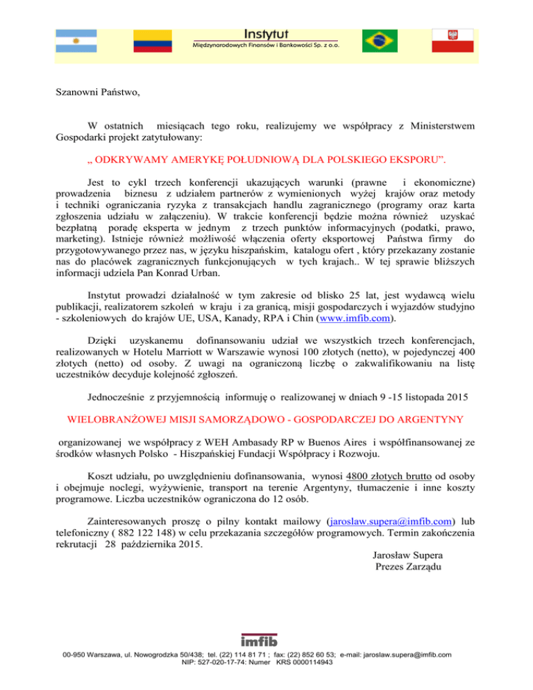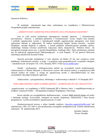 Szanowni Państwo, W ostatnich miesiącach tego roku, realizujemy we współpracy z Ministerstwem Gospodarki projekt zatytułowany: „ ODKRYWAMY AMERYKĘ POŁUDNIOWĄ DLA POLSKIEGO EKSPORU”. Jest to cykl trzech konferencji ukazujących warunki (prawne i ekonomiczne) prowadzenia biznesu z udziałem partnerów z wymienionych wyżej krajów oraz metody i techniki ograniczania ryzyka z transakcjach handlu zagranicznego (programy oraz karta zgłoszenia udziału w załączeniu). W trakcie konferencji będzie można również uzyskać bezpłatną poradę eksperta w jednym z trzech punktów informacyjnych (podatki, prawo, marketing). Istnieje również możliwość włączenia oferty eksportowej Państwa firmy do przygotowywanego przez nas, w języku hiszpańskim, katalogu ofert , który przekazany zostanie nas do placówek zagranicznych funkcjonujących w tych krajach.. W tej sprawie bliższych informacji udziela Pan Konrad Urban. Instytut prowadzi działalność w tym zakresie od blisko 25 lat, jest wydawcą wielu publikacji, realizatorem szkoleń w kraju i za granicą, misji gospodarczych i wyjazdów studyjno - szkoleniowych do krajów UE, USA, Kanady, RPA i Chin (www.imfib.com). Dzięki uzyskanemu dofinansowaniu udział we wszystkich trzech konferencjach, realizowanych w Hotelu Marriott w Warszawie wynosi 100 złotych (netto), w pojedynczej 400 złotych (netto) od osoby. Z uwagi na ograniczoną liczbę o zakwalifikowaniu na listę uczestników decyduje kolejność zgłoszeń. Jednocześnie z przyjemnością informuję o realizowanej w dniach 9 -15 listopada 2015 WIELOBRANŻOWEJ MISJI SAMORZĄDOWO - GOSPODARCZEJ DO ARGENTYNY organizowanej we współpracy z WEH Ambasady RP w Buenos Aires i współfinansowanej ze środków własnych Polsko - Hiszpańskiej Fundacji Współpracy i Rozwoju. Koszt udziału, po uwzględnieniu dofinansowania, wynosi 4800 złotych brutto od osoby i obejmuje noclegi, wyżywienie, transport na terenie Argentyny, tłumaczenie i inne koszty programowe. Liczba uczestników ograniczona do 12 osób. Zainteresowanych proszę o pilny kontakt mailowy ([email protected]) lub telefoniczny ( 882 122 148) w celu przekazania szczegółów programowych. Termin zakończenia rekrutacji 28 października 2015. Jarosław Supera Prezes Zarządu 00-950 Warszawa, ul. Nowogrodzka 50/438; tel. (22) 114 81 71 ; fax: (22) 852 60 53; e-mail: [email protected] NIP: 527-020-17-74: Numer KRS 0000114943