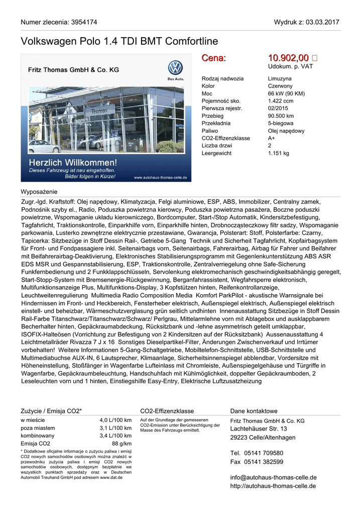 Numer zlecenia: 3954174 Wydruk z: 03.03.2017 Volkswagen Polo 1.4 TDI BMT Comfortline Cena: 10.902,00 Rodzaj nadwozia Kolor Moc Pojemność sko. Pierwsza rejestr. Przebieg Przekładnia Paliwo CO2-Effizenzklasse Liczba drzwi Leergewicht Limuzyna Czerwony 66 kW (90 KM) 1.422 ccm 02/2015 90.500 km 5-biegowa Olej napędowy A+ 2 1.151 kg Udokum. p. VAT Wyposażenie Zugr.-lgd. Kraftstoff: Olej napędowy, Klimatyzacja, Felgi aluminiowe, ESP, ABS, Immobilizer, Centralny zamek, Podnośnik szyby el., Radio, Poduszka powietrzna kierowcy, Poduszka powietrzna pasażera, Boczne poduszki powietrzne, Wspomaganie układu kierowniczego, Bordcomputer, Start-/Stop Automatik, Kindersitzbefestigung, Tagfahrlicht, Traktionskontrolle, Einparkhilfe vorn, Einparkhilfe hinten, Drobnocząsteczkowy filtr sadzy, Wspomaganie parkowania, Lusterko zewnętrzne elektrycznie przestawiane, Gwarancja, Polsterart: Stoff, Polsterfarbe: Czarny, Tapicerka: Sitzbezüge in Stoff Dessin Rail-, Getriebe 5-Gang Technik und Sicherheit Tagfahrlicht, Kopfairbagsystem für Front- und Fondpassagiere inkl. Seitenairbags vorn, Seitenairbags, Fahrerairbag, Airbag für Fahrer und Beifahrer mit Beifahrerairbag-Deaktivierung, Elektronisches Stabilisierungsprogramm mit Gegenlenkunterstützung ABS ASR EDS MSR und Gespannstabilisierung, ESP, Traktionskontrolle, Zentralverriegelung ohne Safe-Sicherung Funkfernbedienung und 2 Funkklappschlüsseln, Servolenkung elektromechanisch geschwindigkeitsabhängig geregelt, Start-Stopp-System mit Bremsenergie-Rückgewinnung, Berganfahrassistent, Wegfahrsperre elektronisch, Multifunktionsanzeige Plus, Multifunktions-Display, 3 Kopfstützen hinten, Reifenkontrollanzeige, Leuchtweitenregulierung Multimedia Radio Composition Media Komfort ParkPilot - akustische Warnsignale bei Hindernissen im Front- und Heckbereich, Fensterheber elektrisch, Außenspiegel elektrisch, Außenspiegel elektrisch einstell- und beheizbar, Wärmeschutzverglasung grün seitlich undhinten Innenausstattung Sitzbezüge in Stoff Dessin Rail-Farbe Titanschwarz/Titanschwarz/Schwarz/ Perlgrau, Mittelarmlehne vorn mit Ablagebox und ausklappbarem Becherhalter hinten, Gepäckraumabdeckung, Rücksitzbank und -lehne asymmetrisch geteilt umklappbar, ISOFIX-Halteösen (Vorrichtung zur Befestigung von 2 Kindersitzen auf der Rücksitzbank) Aussenausstattung 4 Leichtmetallräder Rivazza 7 J x 16 Sonstiges Dieselpartikel-Filter, Änderungen Zwischenverkauf und Irrtümer vorbehalten! Weitere Informationen 5-Gang-Schaltgetriebe, Mobiltelefon-Schnittstelle, USB-Schnittstelle und Multimediabuchse AUX-IN, 6 Lautsprecher, Klimaanlage, Sicherheitsinnenspiegel abblendbar, Vordersitze mit Höheneinstellung, Stoßfänger in Wagenfarbe Lufteinlass mit Chromleiste, Außenspiegelgehäuse und Türgriffe in Wagenfarbe, Gepäckraumbeleuchtung, Handschuhfach mit Kühlmöglichkeit, doppelter Gepäckraumboden, 2 Leseleuchten vorn und 1 hinten, Einstiegshilfe Easy-Entry, Elektrische Luftzusatzheizung Zużycie / Emisja CO2* w mieście poza miastem kombinowany Emisja CO2 4,0 L/100 km 3,1 L/100 km 3,4 L/100 km 88 g/km * Dodatkowe oficjalne informacje o zużyciu paliwa i emisji CO2 nowych samochodów osobowych można znaleźć w przewodniku zużycia paliwa i emisji CO2 nowych samochodów osobowych, dostępnym bezpłatnie we wszystkich punktach sprzedaży oraz w Deutschen Automobil Treuhand GmbH pod adresem www.dat.de CO2-Effizenzklasse Dane kontaktowe Auf der Grundlage der gemessenen CO2-Emission unter Berücksichtigung der Masse des Fahrzeugs ermittelt. Fritz Thomas GmbH & Co. KG Lachtehäuser Str. 13 29223 Celle/Altenhagen Tel. 05141 709580 Fax 05141 382599 [email protected] http://autohaus-thomas-celle.de Numer zlecenia: 3954174 Volkswagen Polo 1.4 TDI BMT Comfortline Wydruk z: 03.03.2017