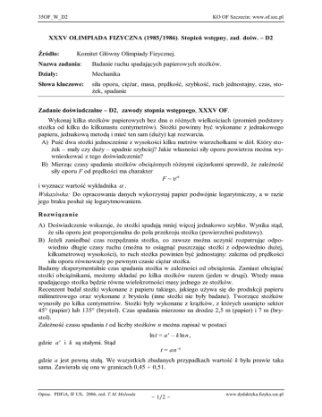 35OF_W_D2 KO OF Szczecin: www.of.szc.pl XXXV OLIMPIADA FIZYCZNA (1985/1986). Stopień wstępny, zad. dośw. – D2 Źródło: Komitet Główny Olimpiady Fizycznej. Nazwa zadania: Badanie ruchu spadających papierowych stożków. Działy: Mechanika Słowa kluczowe: siła oporu, ciężar, masa, prędkość, szybkość, ruch jednostajny, czas, stożek, spadanie Zadanie doświadczalne – D2, zawody stopnia wstępnego, XXXV OF. Wykonaj kilka stożków papierowych bez dna o różnych wielkościach (promień podstawy stożka od kilku do kilkunastu centymetrów). Stożki powinny być wykonane z jednakowego papieru, jednakową metodą i mieć ten sam (duży) kąt rozwarcia. A) Puść dwa stożki jednocześnie z wysokości kilku metrów wierzchołkami w dół. Który stożek – mały czy duży – upadnie szybciej? Jakie własności siły oporu powietrza można wywnioskować z tego doświadczenia? B) Mierząc czasy spadania stożków obciążonych różnymi ciężarkami sprawdź, że zależność siły oporu F od prędkości ma charakter F ~ v i wyznacz wartość wykładnika . Wskazówka: Do opracowania danych wykorzystaj papier podwójnie logarytmiczny, a w razie jego braku posłuż się logarytmowaniem. Rozwiązanie A) Doświadczenie wskazuje, że stożki spadają mniej więcej jednakowo szybko. Wynika stąd, że siła oporu jest proporcjonalna do pola przekroju stożka (powierzchni podstawy). B) Jeżeli zaniedbać czas rozpędzania stożka, co zawsze można uczynić rozpatrując odpowiednio długie czasy ruchu (można to osiągnąć puszczając stożki z odpowiednio dużej, kilkumetrowej wysokości), to ruch stożka powinien być jednostajny: zależna od prędkości siła oporu równoważy po pewnym czasie ciężar stożka. Badamy eksperymentalnie czas spadania stożka w zależności od obciążenia. Zamiast obciążać stożki obciążnikami, możemy składać po kilka stożków razem (jeden w drugi). Wtedy masa spadającego stożka będzie równa wielokrotności masy jednego ze stożków. Recenzent badał stożki wykonane z papieru takiego, jakiego używa się do produkcji papieru milimetrowego oraz wykonane z brystolu (inne stożki nie były badane). Tworzące stożków wynosiły po kilka centymetrów. Stożki były wykonane z krążków, z których usunięto sektor 45° (papier) lub 135° (brystol). Czas spadania mierzono na drodze 2,5 m (papier) i 7 m (brystol). Zależność czasu spadania t od liczby stożków n można zapisać w postaci ln t = a – k ln n , gdzie a i k są stałymi. Stąd t = an -k gdzie a jest pewną stałą. We wszystkich zbadanych przypadkach wartość k była prawie taka sama. Zawierała się ona w granicach 0,45 ÷ 0,51. Oprac. PDFiA, IF US, 2006, red. T. M. Molenda - 1/2 - www.dydaktyka.fizyka.szc.pl 35OF_W_D2 KO OF Szczecin: www.of.szc.pl Można przyjąć, że k = 0,48 ± 0,03, r = 1/k = 2,09 ± 0,13. Czas spadania stożków jest odwrotnie proporcjonalny do prędkości t~ 1 . v Zatem 1 ~ n k , v r n~v. Ale n jest proporcjonalne do ciężaru stożka (złożonego z kilku) a ciężar stożka w ruchu jednostajnym jest równy sile oporu F. Wobec tego r F~v, r 2. Proponowana punktacja 1. Opis wykonanych czynności w przypadkach A i B 2. F ~ pola powierzchni podstawy stożka r 3. F ~ v , gdzie r 2 6 pkt. 4 pkt. 10 pkt. Uwagi Zadanie to okazało się mniej więcej trzy razy mniej popularne niż zadanie poprzednie. Wydaje się, że przyczyną większości trudności doświadczalnych uczniów było obserwowanie ruchu stożków na zbyt krótkiej drodze. Rozwiązania poprawne uzyskało 2/3 rozwiązujących. Oprac. PDFiA, IF US, 2006, red. T. M. Molenda - 2/2 - www.dydaktyka.fizyka.szc.pl