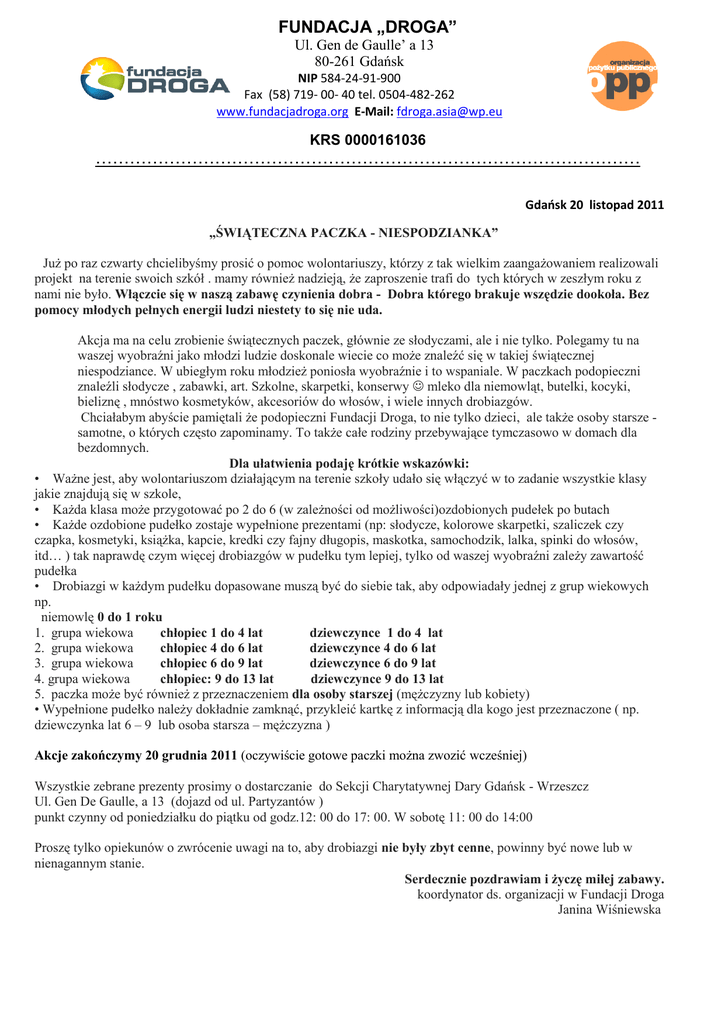 FUNDACJA „DROGA” Ul. Gen de Gaulle’ a 13 80-261 Gdańsk NIP 584-24-91-900 Fax (58) 719- 00- 40 tel. 0504-482-262 www.fundacjadroga.org E-Mail: [email protected] KRS 0000161036 …………………………………………………………………………………… Gdańsk 20 listopad 2011 „ŚWIĄTECZNA PACZKA - NIESPODZIANKA” Już po raz czwarty chcielibyśmy prosić o pomoc wolontariuszy, którzy z tak wielkim zaangażowaniem realizowali projekt na terenie swoich szkół . mamy również nadzieją, że zaproszenie trafi do tych których w zeszłym roku z nami nie było. Włączcie się w naszą zabawę czynienia dobra - Dobra którego brakuje wszędzie dookoła. Bez pomocy młodych pełnych energii ludzi niestety to się nie uda. Akcja ma na celu zrobienie świątecznych paczek, głównie ze słodyczami, ale i nie tylko. Polegamy tu na waszej wyobraźni jako młodzi ludzie doskonale wiecie co może znaleźć się w takiej świątecznej niespodziance. W ubiegłym roku młodzież poniosła wyobraźnie i to wspaniale. W paczkach podopieczni znaleźli słodycze , zabawki, art. Szkolne, skarpetki, konserwy mleko dla niemowląt, butelki, kocyki, bieliznę , mnóstwo kosmetyków, akcesoriów do włosów, i wiele innych drobiazgów. Chciałabym abyście pamiętali że podopieczni Fundacji Droga, to nie tylko dzieci, ale także osoby starsze samotne, o których często zapominamy. To także całe rodziny przebywające tymczasowo w domach dla bezdomnych. Dla ułatwienia podaję krótkie wskazówki: • Ważne jest, aby wolontariuszom działającym na terenie szkoły udało się włączyć w to zadanie wszystkie klasy jakie znajdują się w szkole, • Każda klasa może przygotować po 2 do 6 (w zależności od możliwości)ozdobionych pudełek po butach • Każde ozdobione pudełko zostaje wypełnione prezentami (np: słodycze, kolorowe skarpetki, szaliczek czy czapka, kosmetyki, książka, kapcie, kredki czy fajny długopis, maskotka, samochodzik, lalka, spinki do włosów, itd… ) tak naprawdę czym więcej drobiazgów w pudełku tym lepiej, tylko od waszej wyobraźni zależy zawartość pudełka • Drobiazgi w każdym pudełku dopasowane muszą być do siebie tak, aby odpowiadały jednej z grup wiekowych np. niemowlę 0 do 1 roku 1. grupa wiekowa chłopiec 1 do 4 lat dziewczynce 1 do 4 lat 2. grupa wiekowa chłopiec 4 do 6 lat dziewczynce 4 do 6 lat 3. grupa wiekowa chłopiec 6 do 9 lat dziewczynce 6 do 9 lat 4. grupa wiekowa chłopiec: 9 do 13 lat dziewczynce 9 do 13 lat 5. paczka może być również z przeznaczeniem dla osoby starszej (mężczyzny lub kobiety) • Wypełnione pudełko należy dokładnie zamknąć, przykleić kartkę z informacją dla kogo jest przeznaczone ( np. dziewczynka lat 6 – 9 lub osoba starsza – mężczyzna ) Akcje zakończymy 20 grudnia 2011 (oczywiście gotowe paczki można zwozić wcześniej) Wszystkie zebrane prezenty prosimy o dostarczanie do Sekcji Charytatywnej Dary Gdańsk - Wrzeszcz Ul. Gen De Gaulle, a 13 (dojazd od ul. Partyzantów ) punkt czynny od poniedziałku do piątku od godz.12: 00 do 17: 00. W sobotę 11: 00 do 14:00 Proszę tylko opiekunów o zwrócenie uwagi na to, aby drobiazgi nie były zbyt cenne, powinny być nowe lub w nienagannym stanie. Serdecznie pozdrawiam i życzę miłej zabawy. koordynator ds. organizacji w Fundacji Droga Janina Wiśniewska
